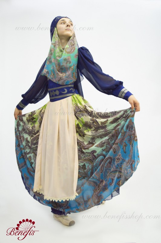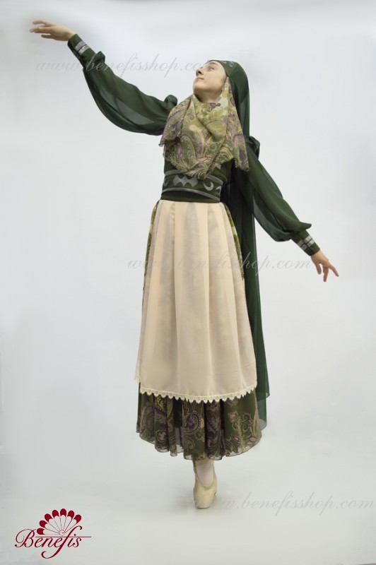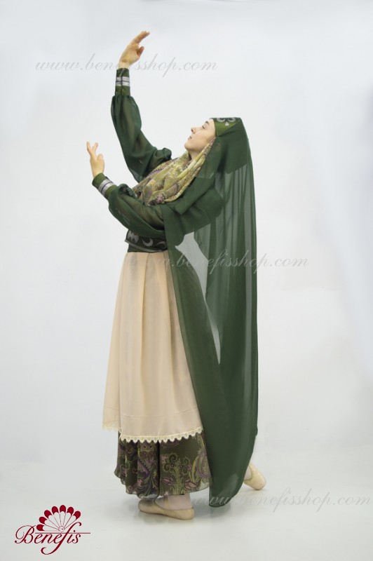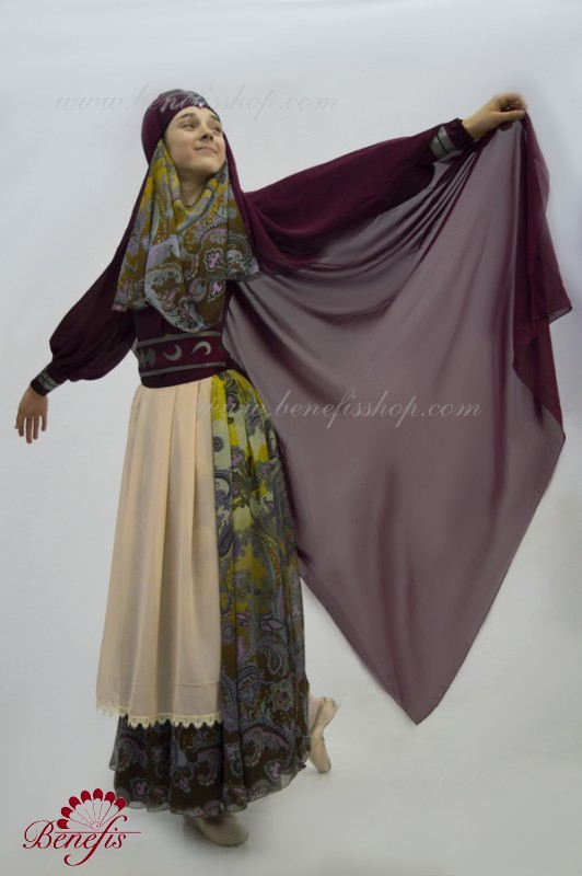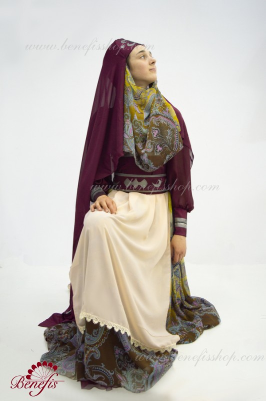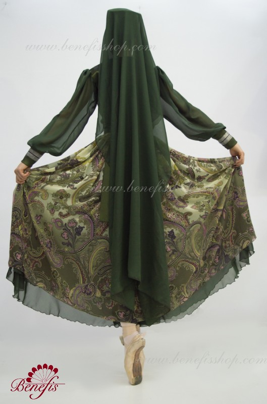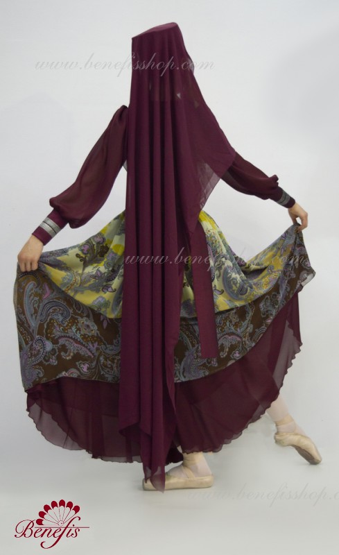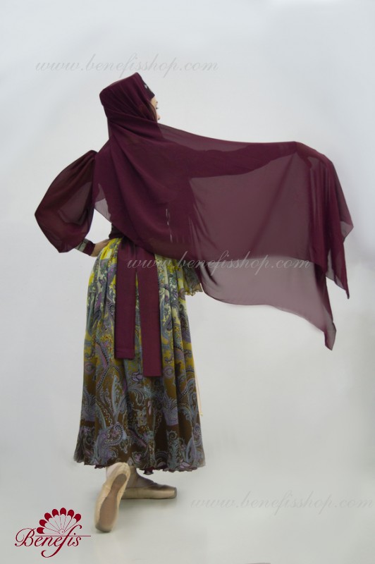 The bodice is made of semi-elastic, dense fabric, fastens on the back with two rows of hooks and loops for easy adjustment. Wide sleeves are made of chiffon.