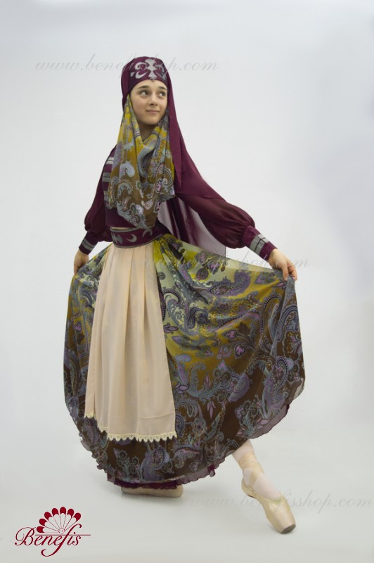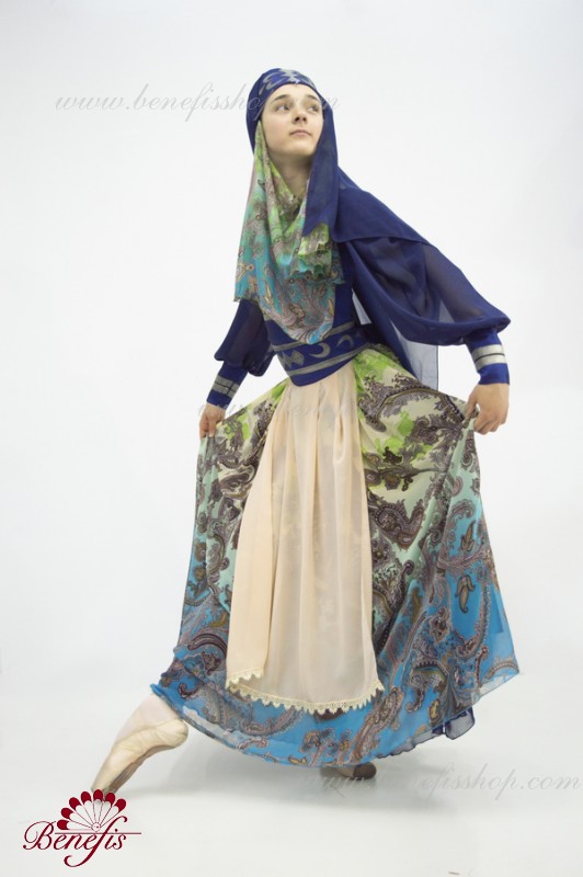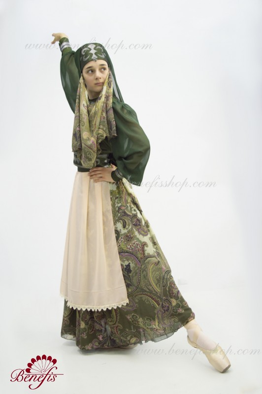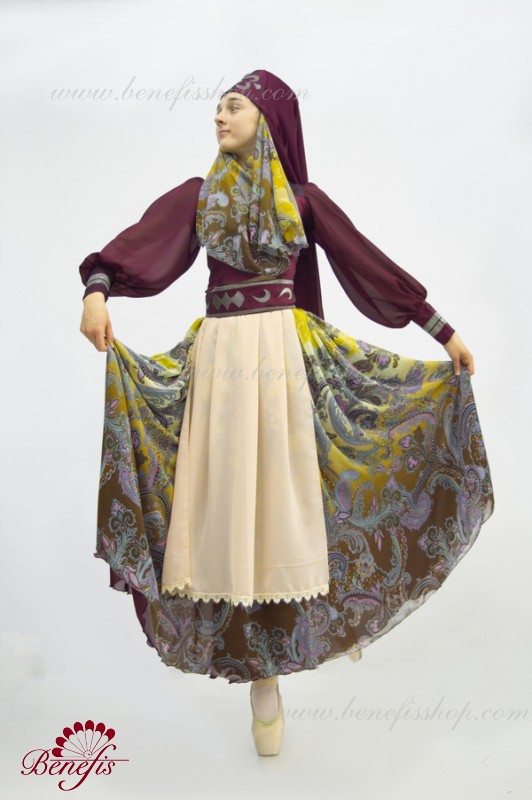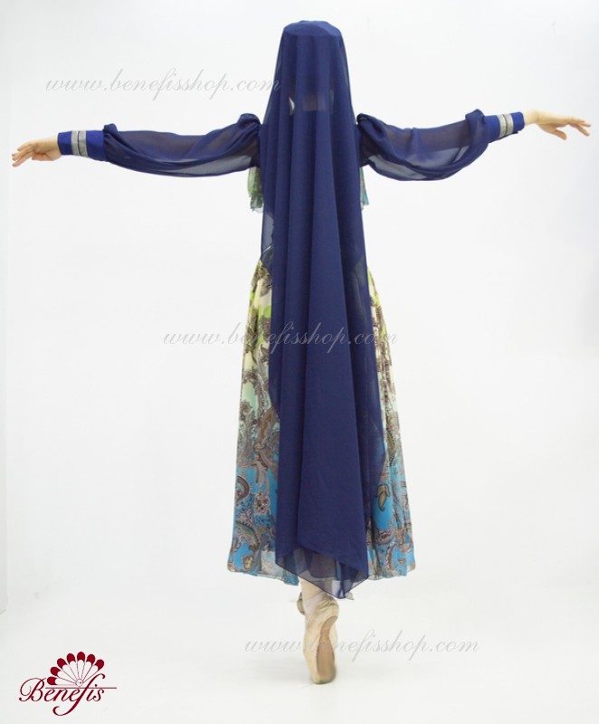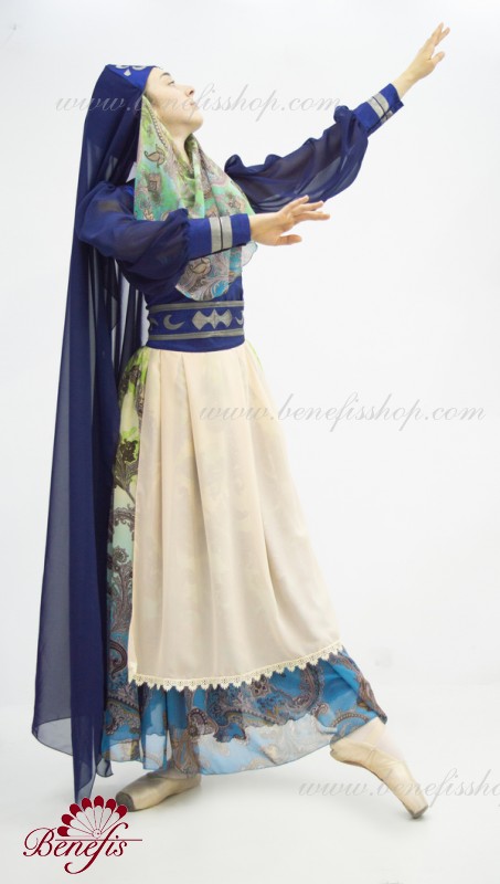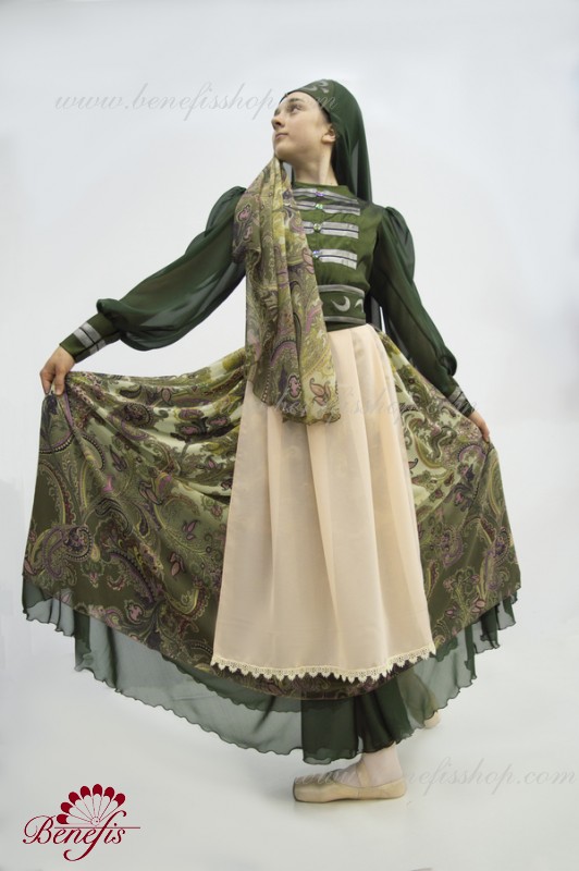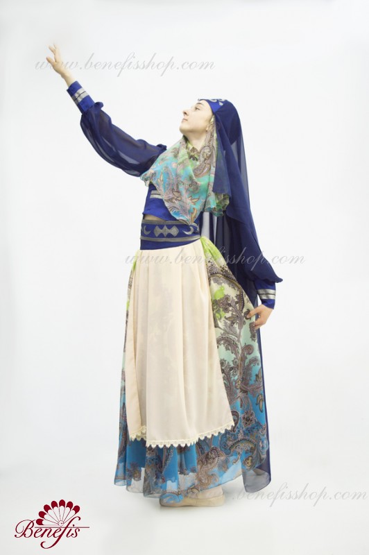 The bodice is made of semi-elastic, dense fabric, fastens on the back with two rows of hooks and loops for easy adjustment. Wide sleeves are made of chiffon.