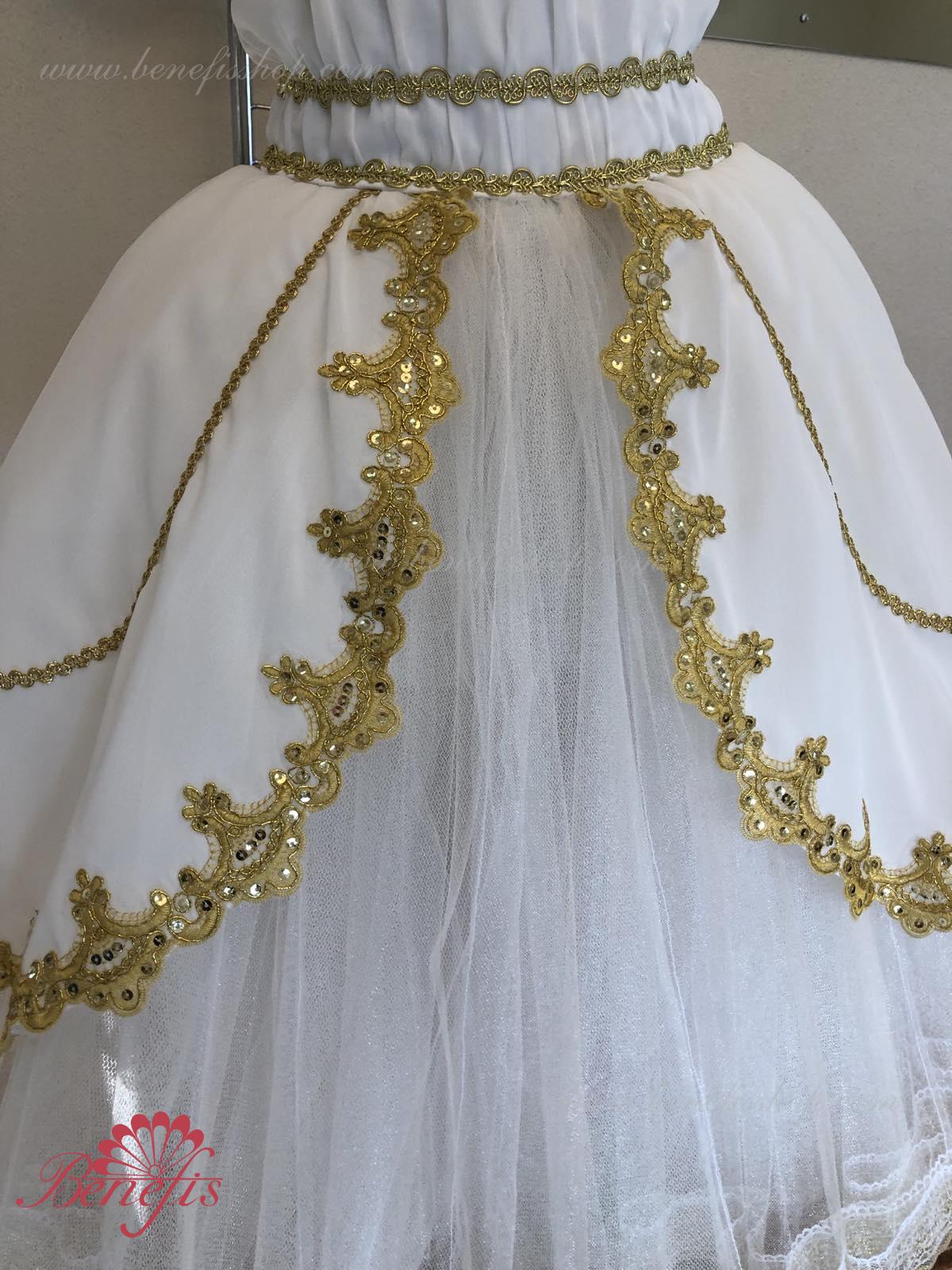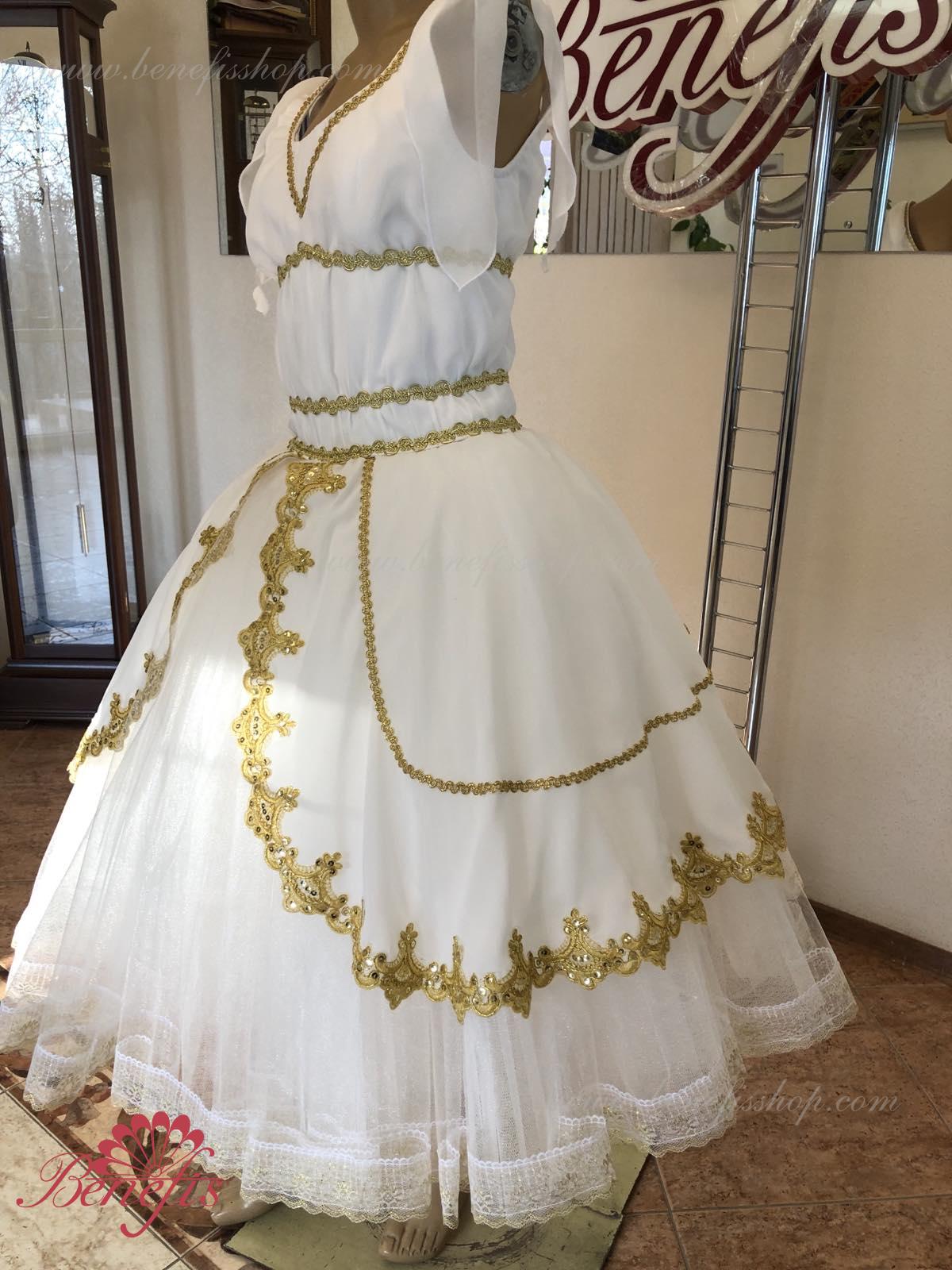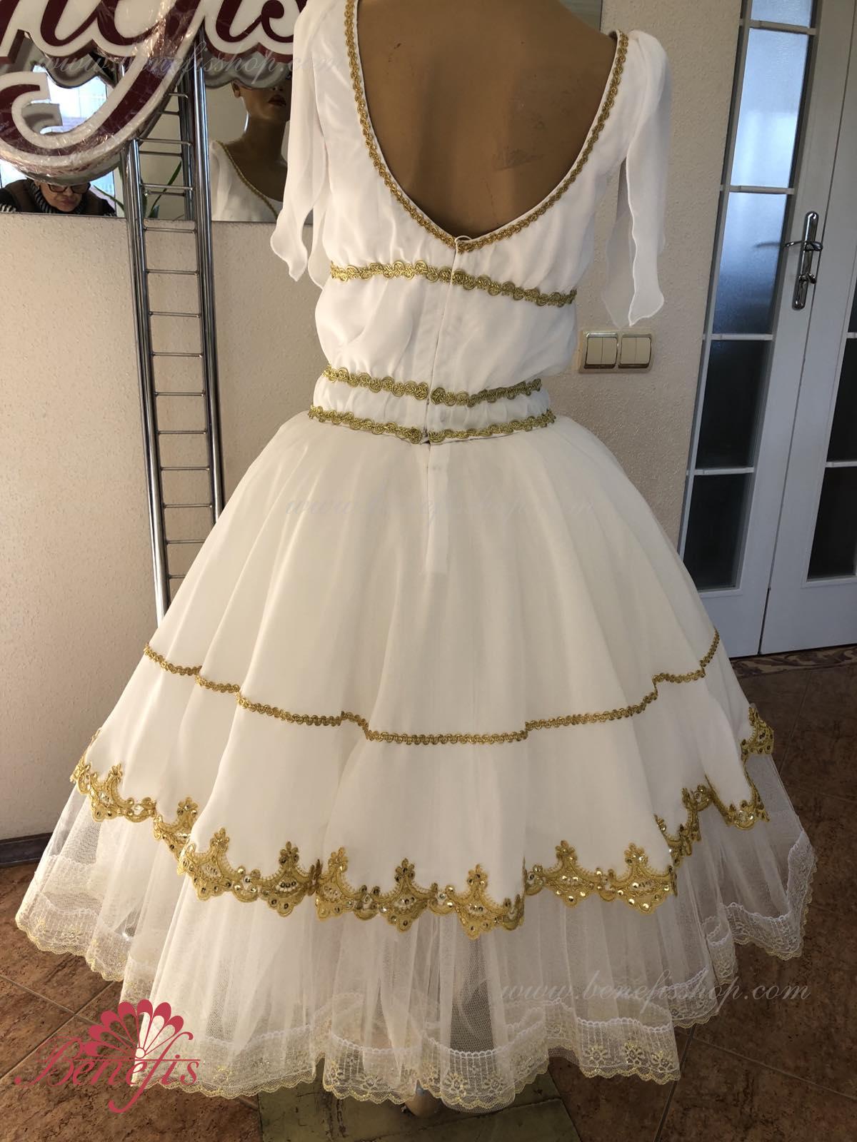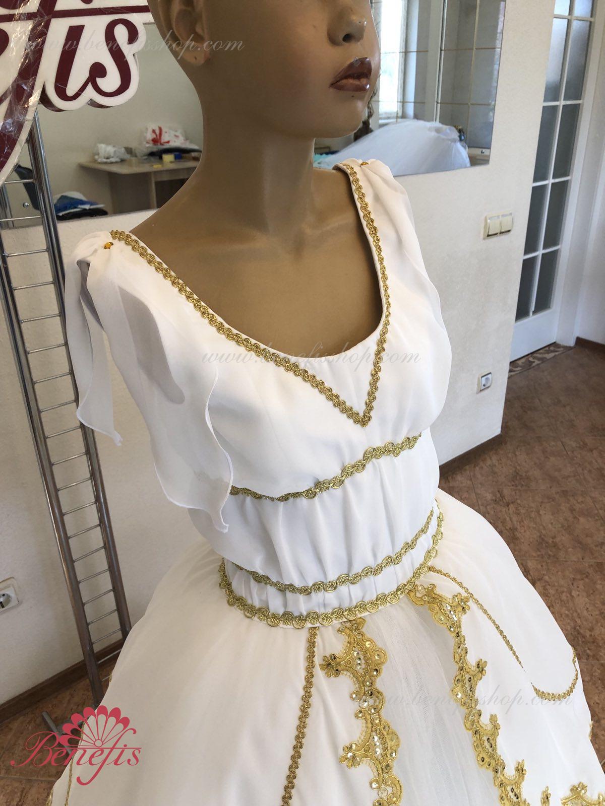 The pack is fastened at the back with 4 hooks and loops, which are sewn in the waist area. As the decor of the costume, applications in the form of exquisite patterns, as well as braid, sequins are used.