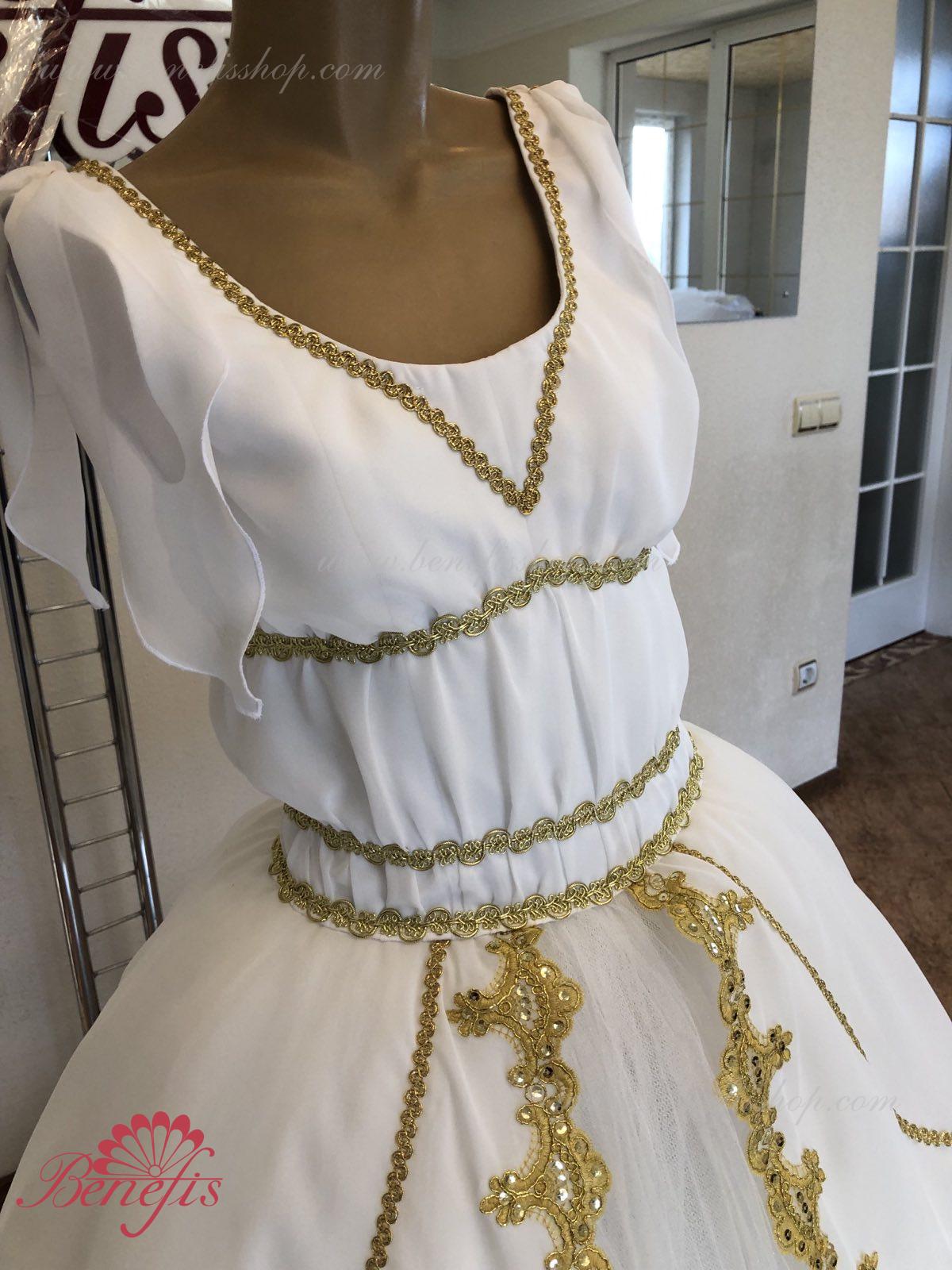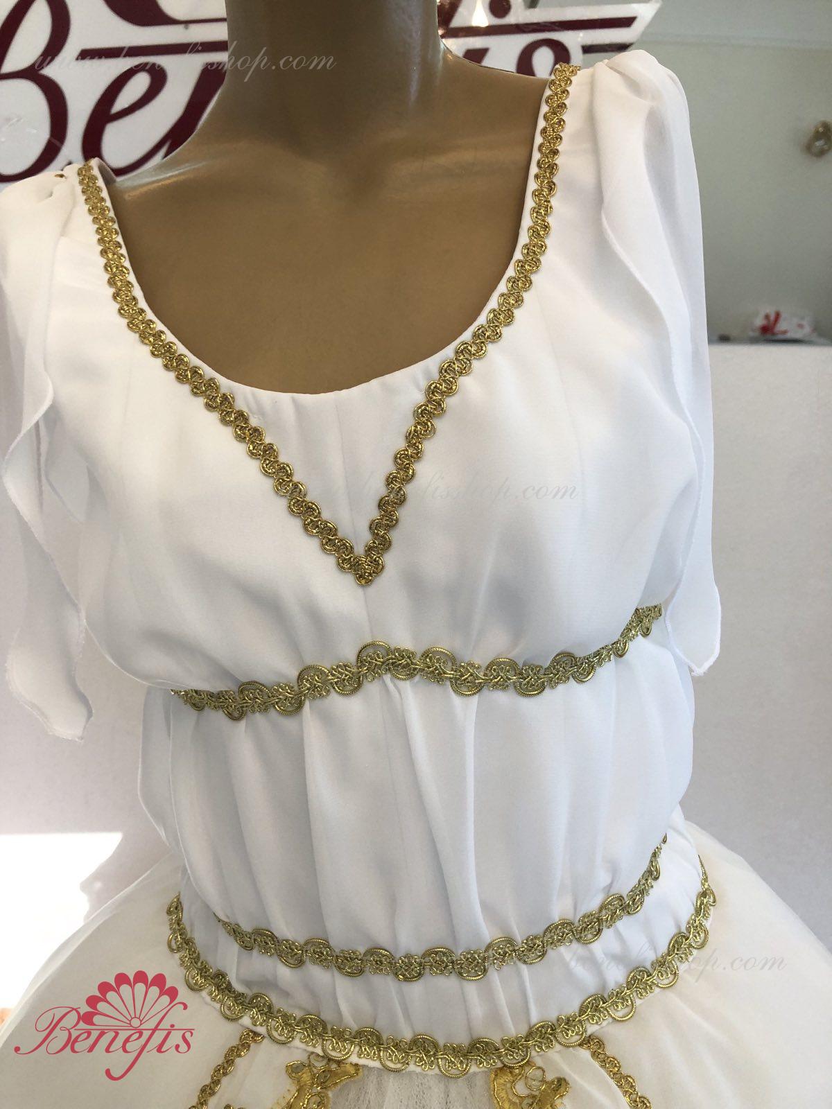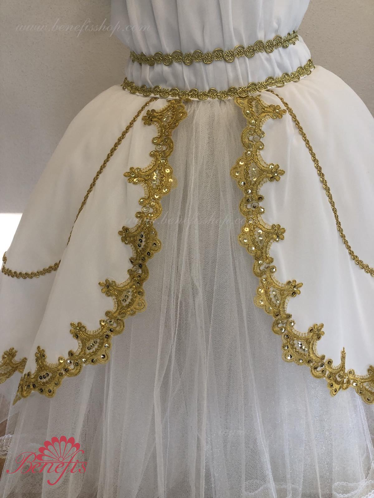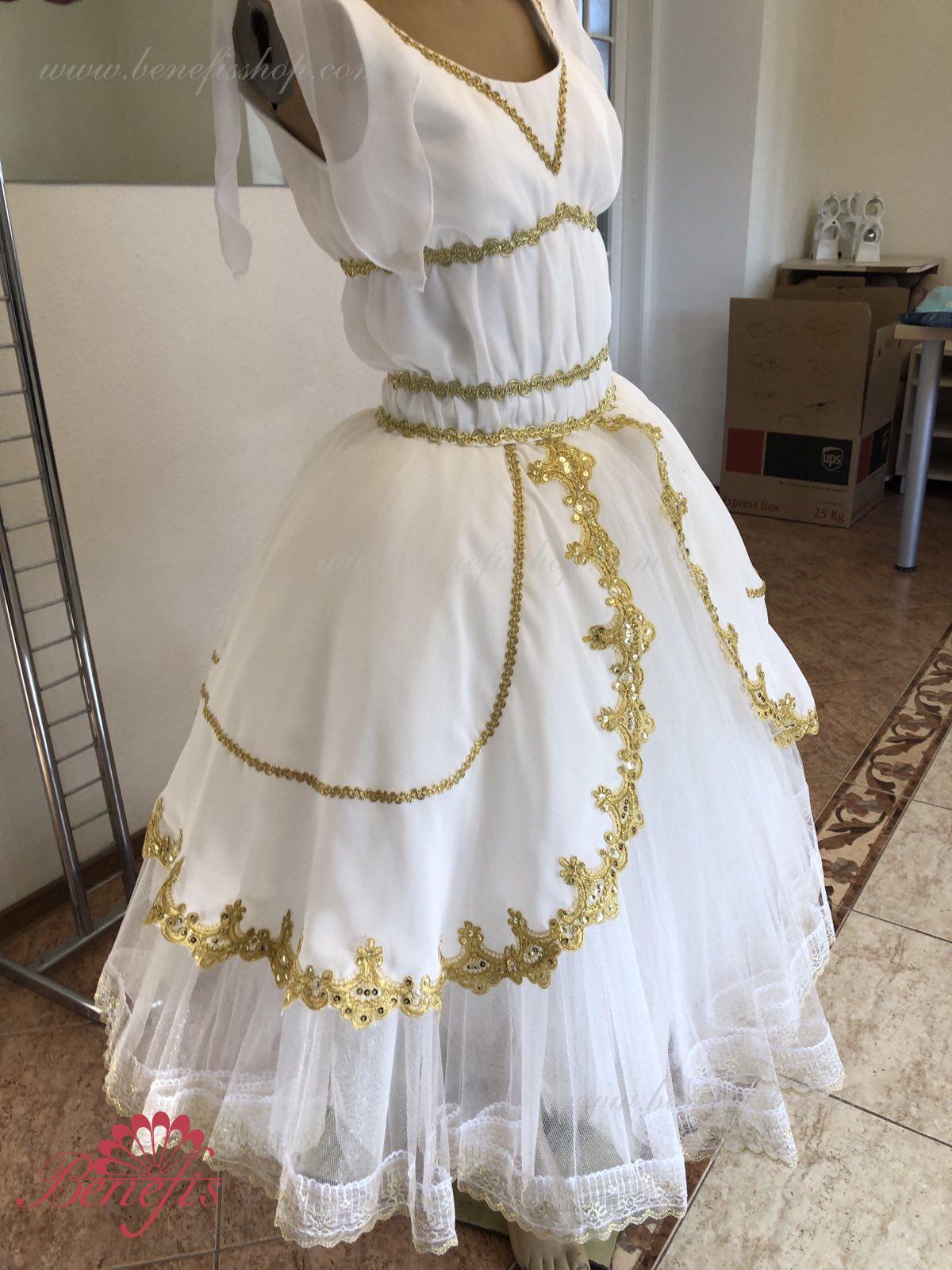 The pack is fastened at the back with 4 hooks and loops, which are sewn in the waist area. As the decor of the costume, applications in the form of exquisite patterns, as well as braid, sequins are used.