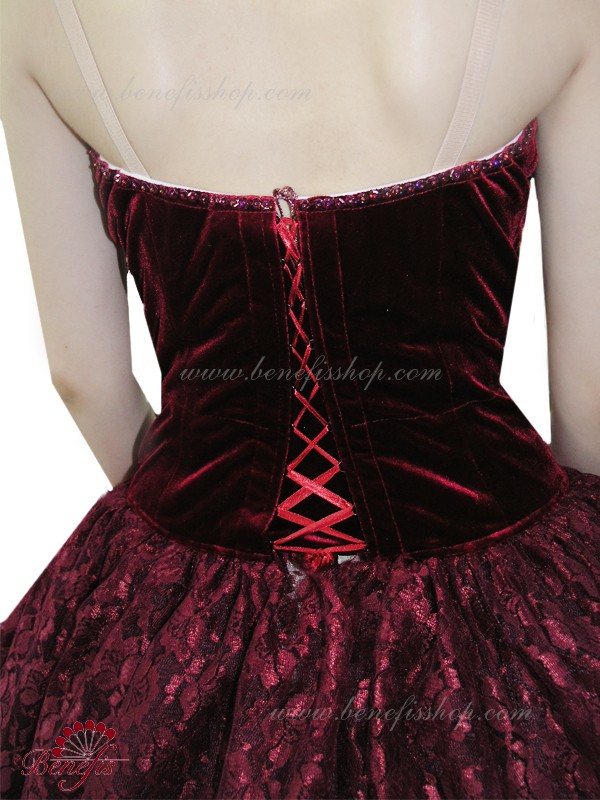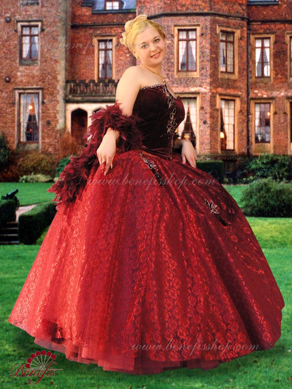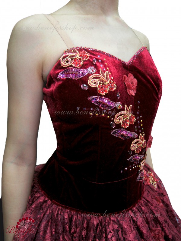 This splendid dress with velvet bodice and guipure upper skirt is embroidered with shining applications and sparkling braid. Strasses, bugles, beads and sparkles abundantly cover this beautiful dress. The dress fastens on the back.