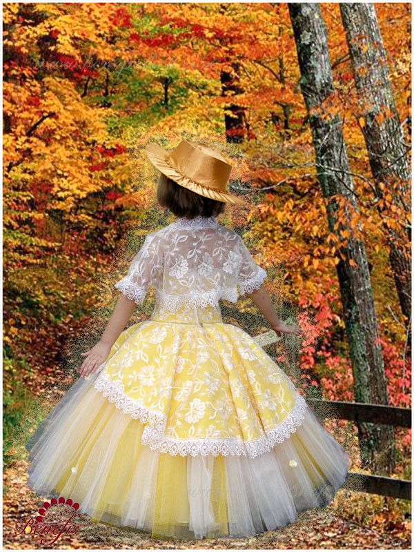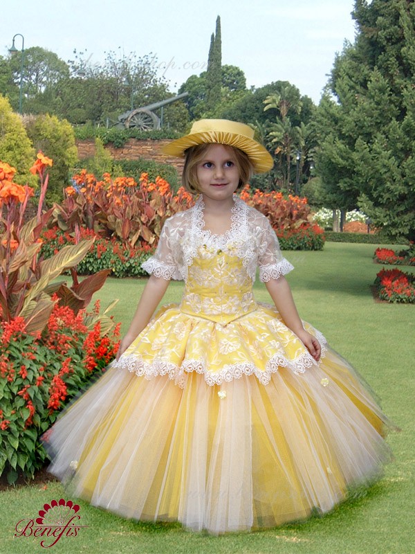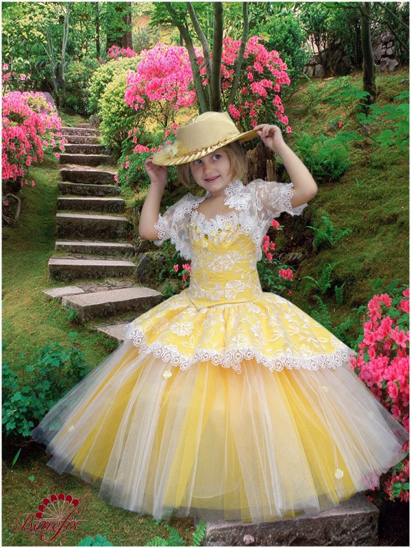 The skirt is made of lining, some layers of stiff and soft tulle and peplum. It is done from the tulle of yellow and white colors. The peplum, made of white guipure is doubled with yellow gabardine. The edge of the peplum is decorated with the lace, the same as on the bodice and bolero. The upper layer of the tulle is decorated with flowers made of sparkles.