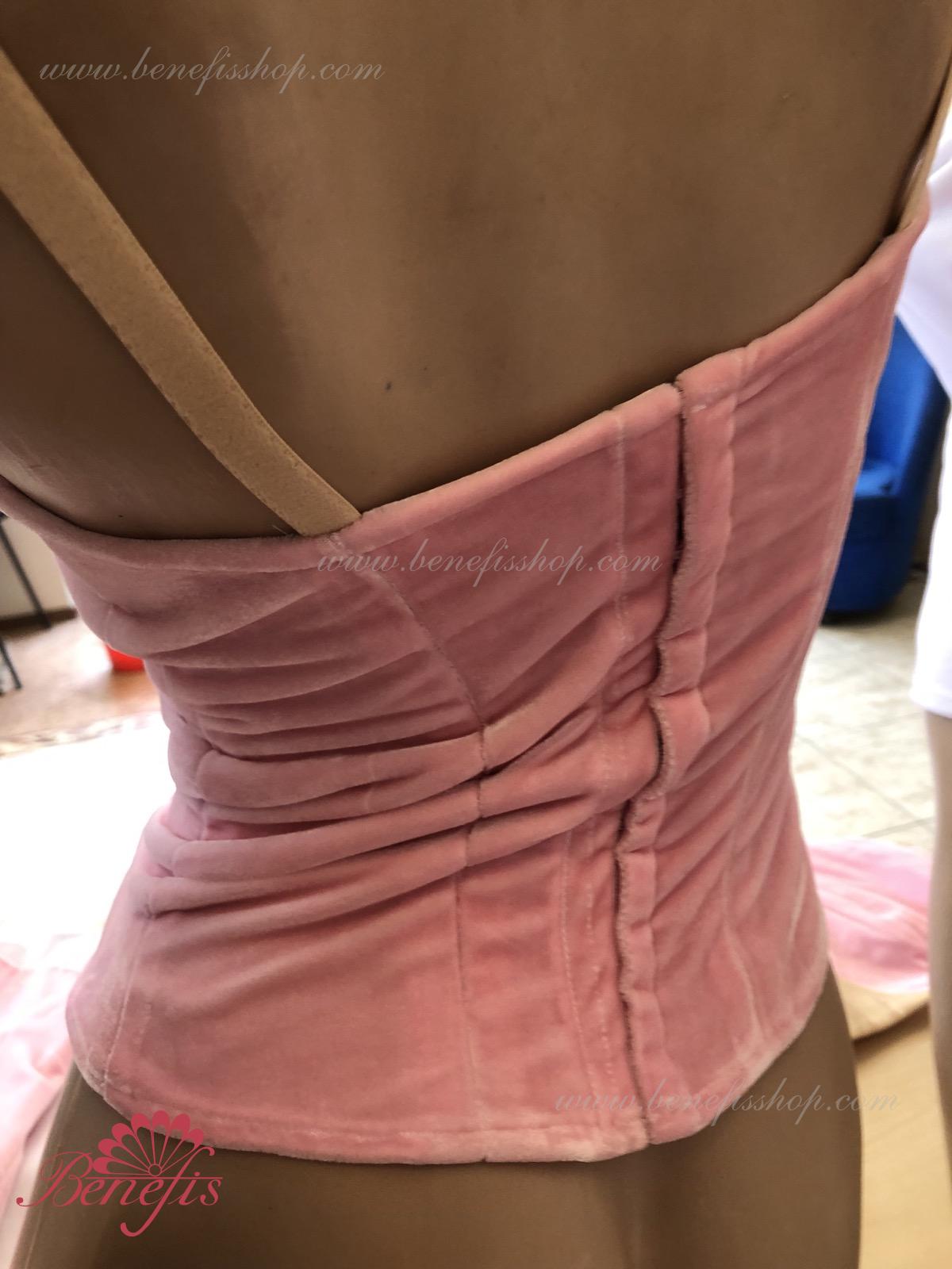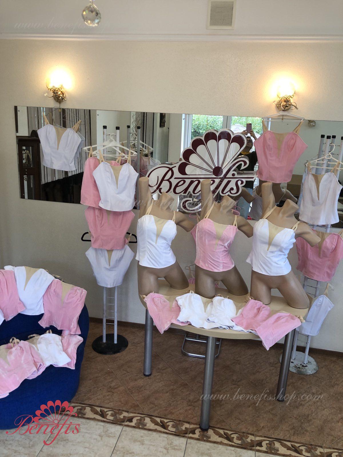 The ballet bodice is made of suplex fabric, sewn from 8 parts, on the back the bodice is fastened with a braid with hooks and loops. In front there is a flesh-colored insert the chest.