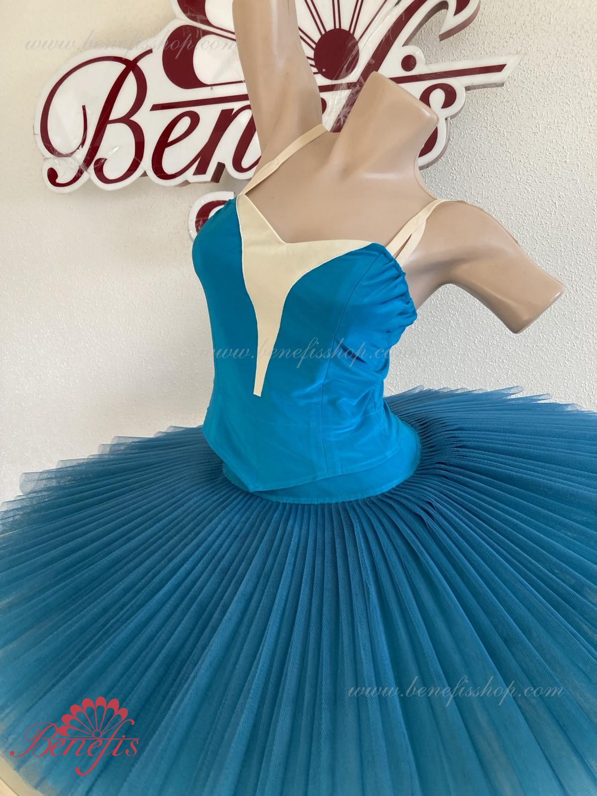 The bodice with elastic straps can be made of dense fabric. This item is made of two parts that are fastened together by elastic straps at the waist level. The lower part of the basque is made of supplex and fastened to the tutu. The upper part overlaps the lower one, allowing adjustment of the bodice length depending on ballerina’s height and giving it better flexibility.