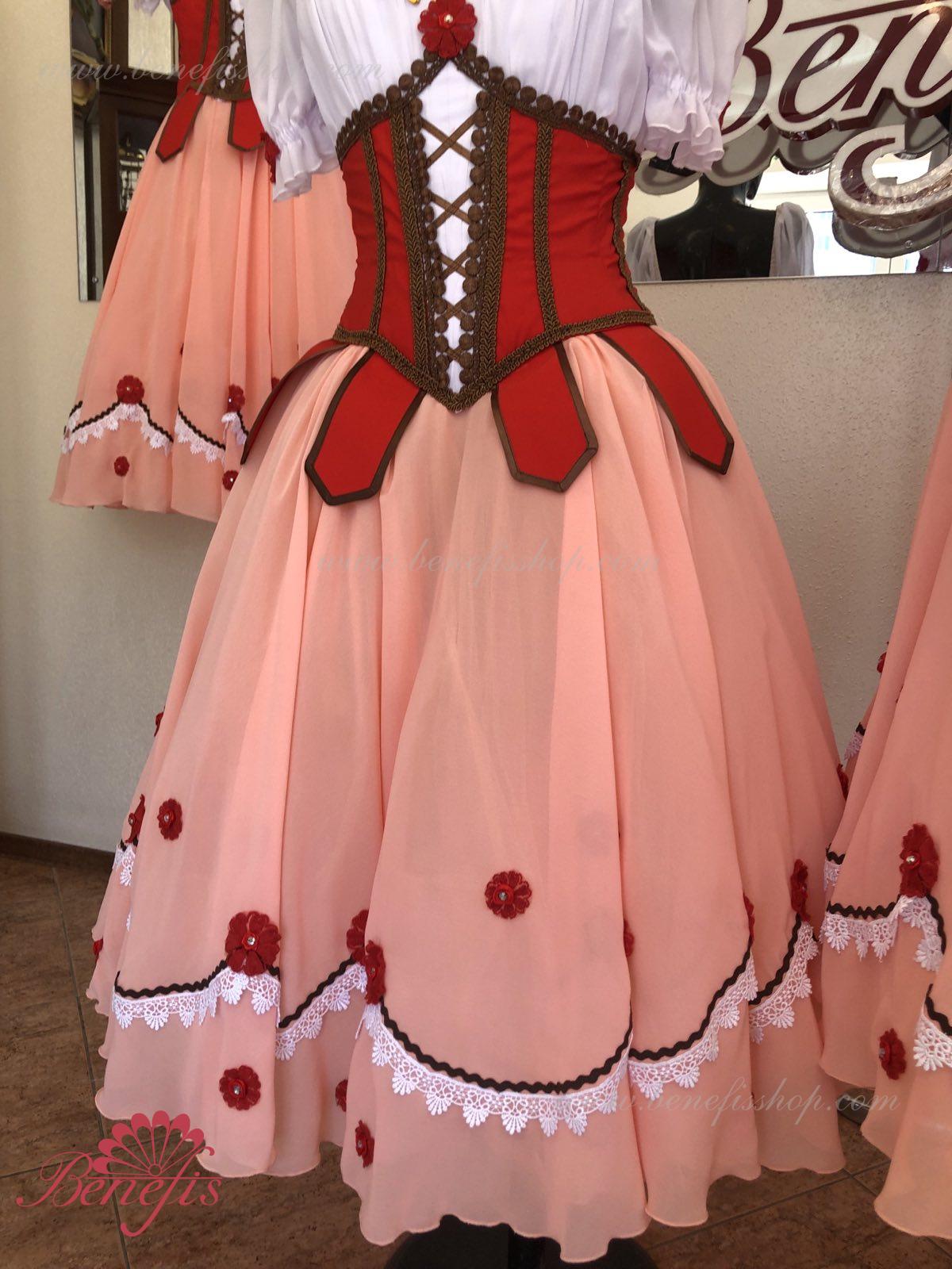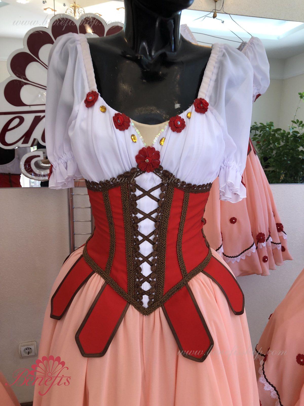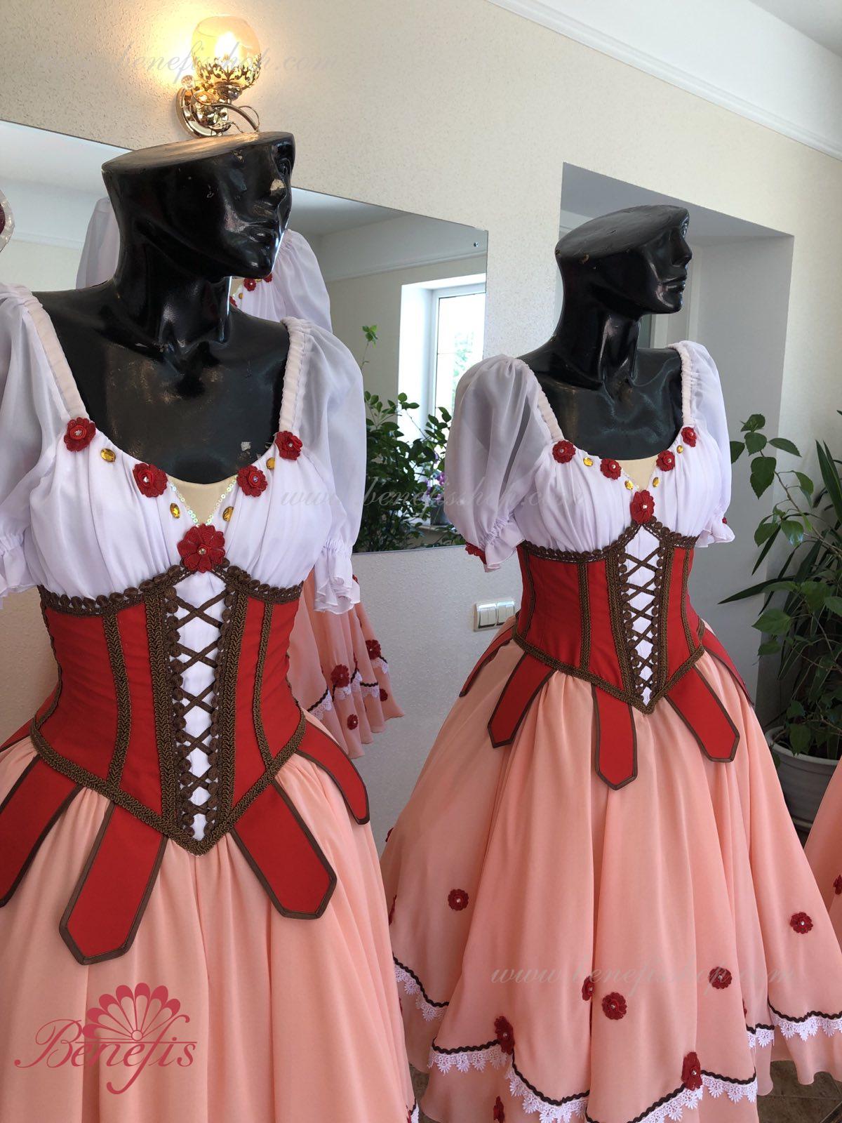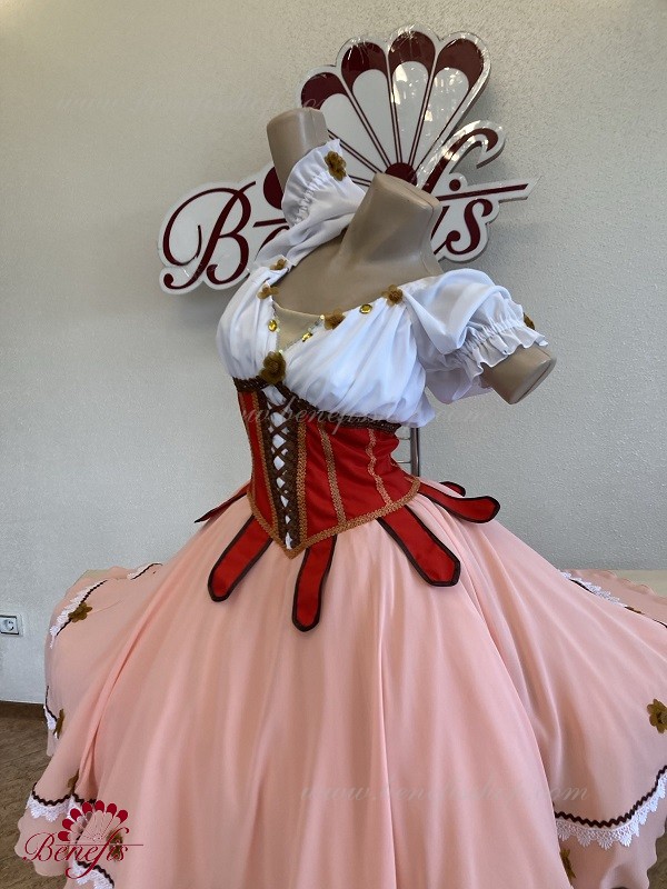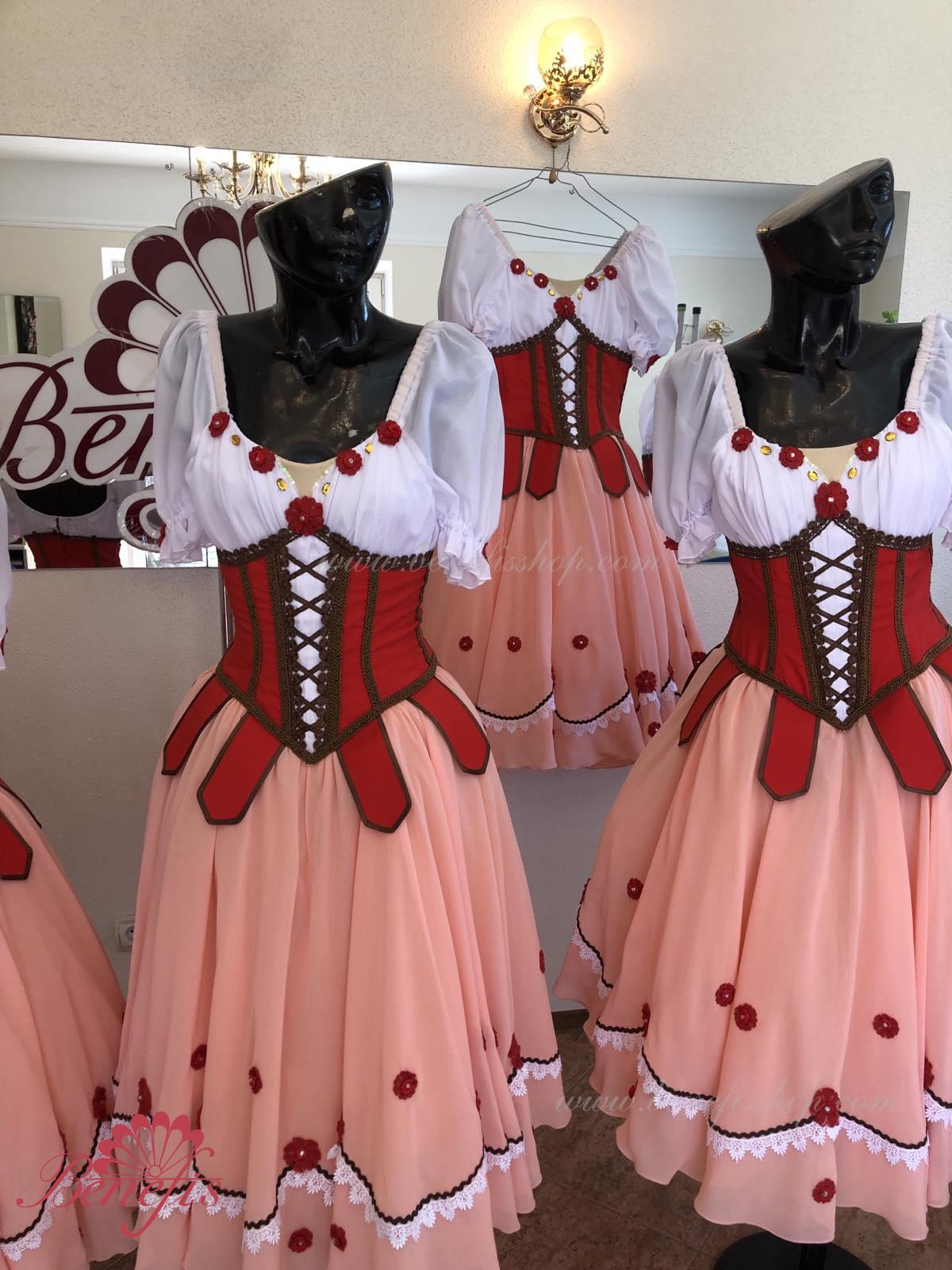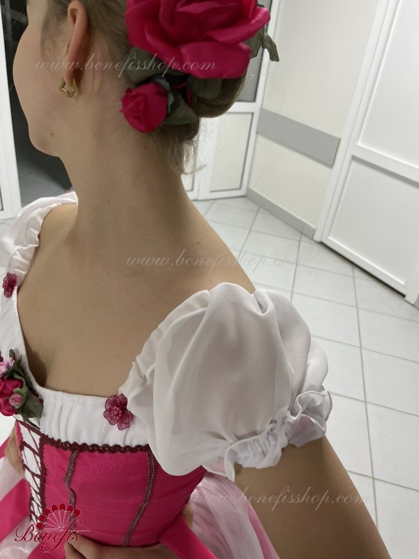 This is a professional stage costume. The bodice is made of 2 colors, the upper part of the bodice is duplicated by chiffon. Sleeves lanterns made of chiffon are gathered on an elastic band. The skirt is made of 3 layers of soft tulle, covered with light chiffon. The costume is decorated with two types of lace, the decor is complemented by flowers of various sizes.