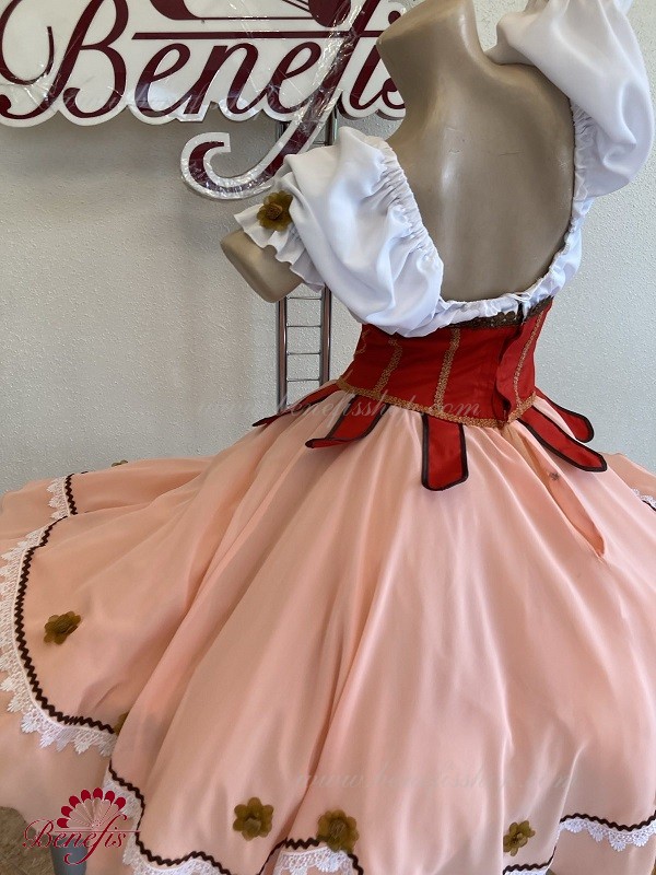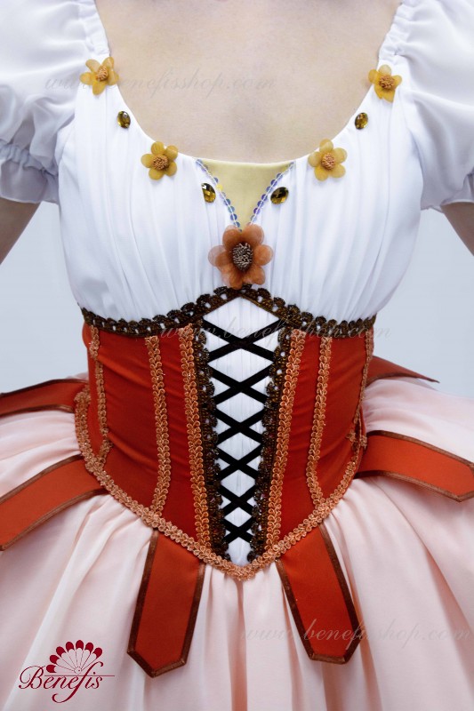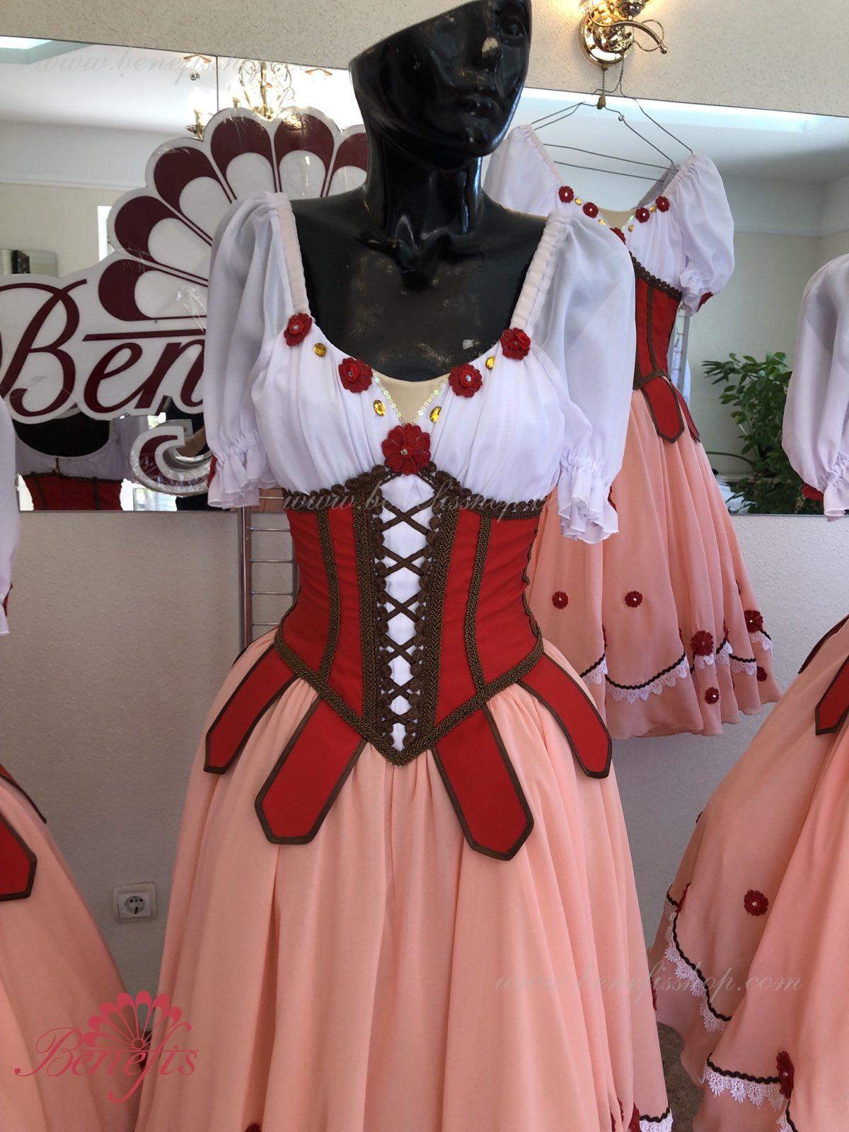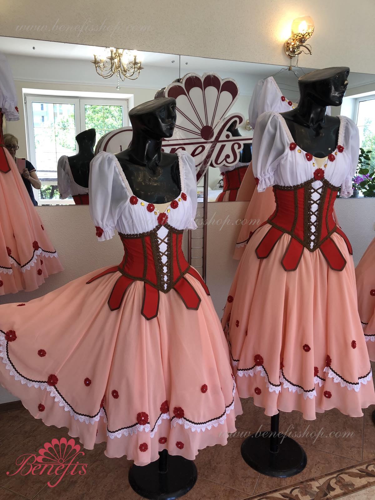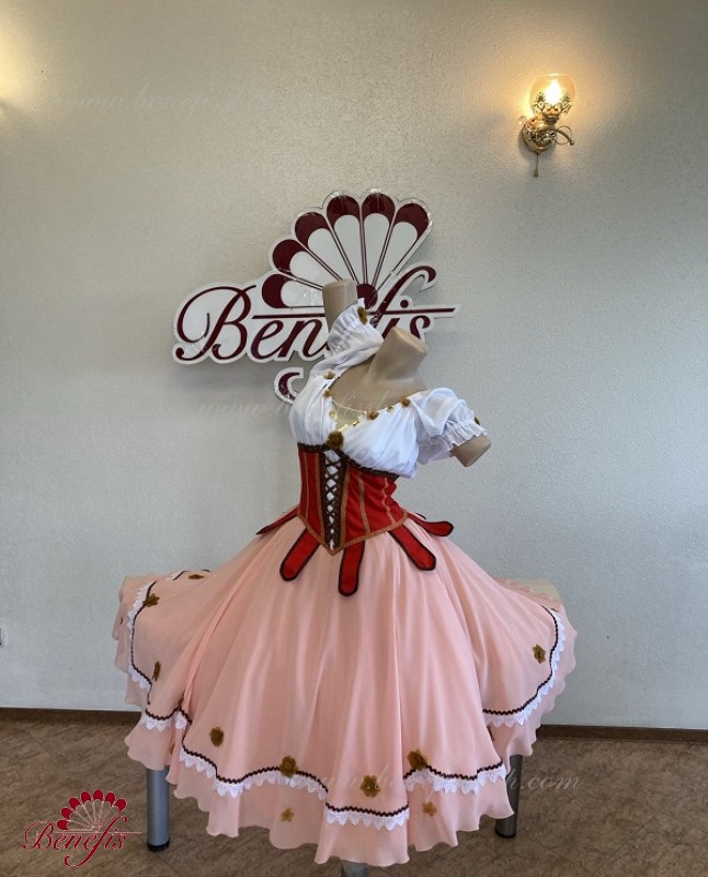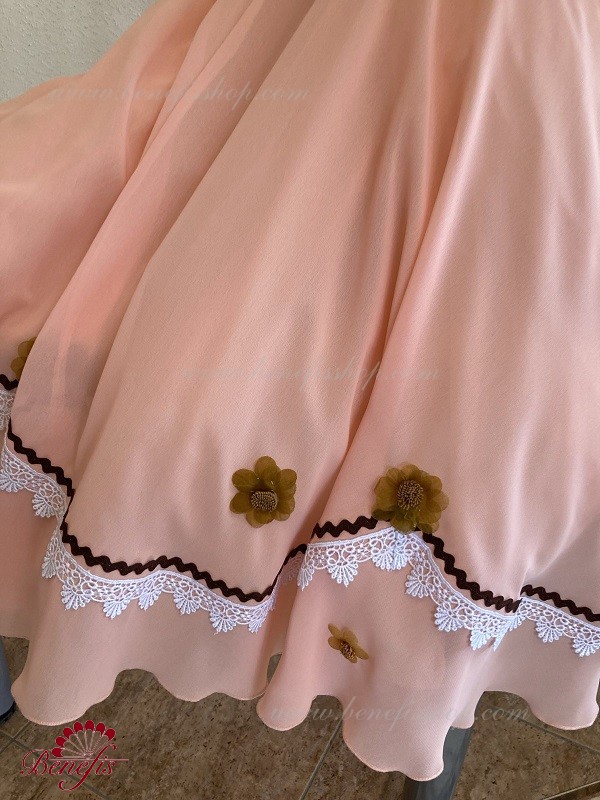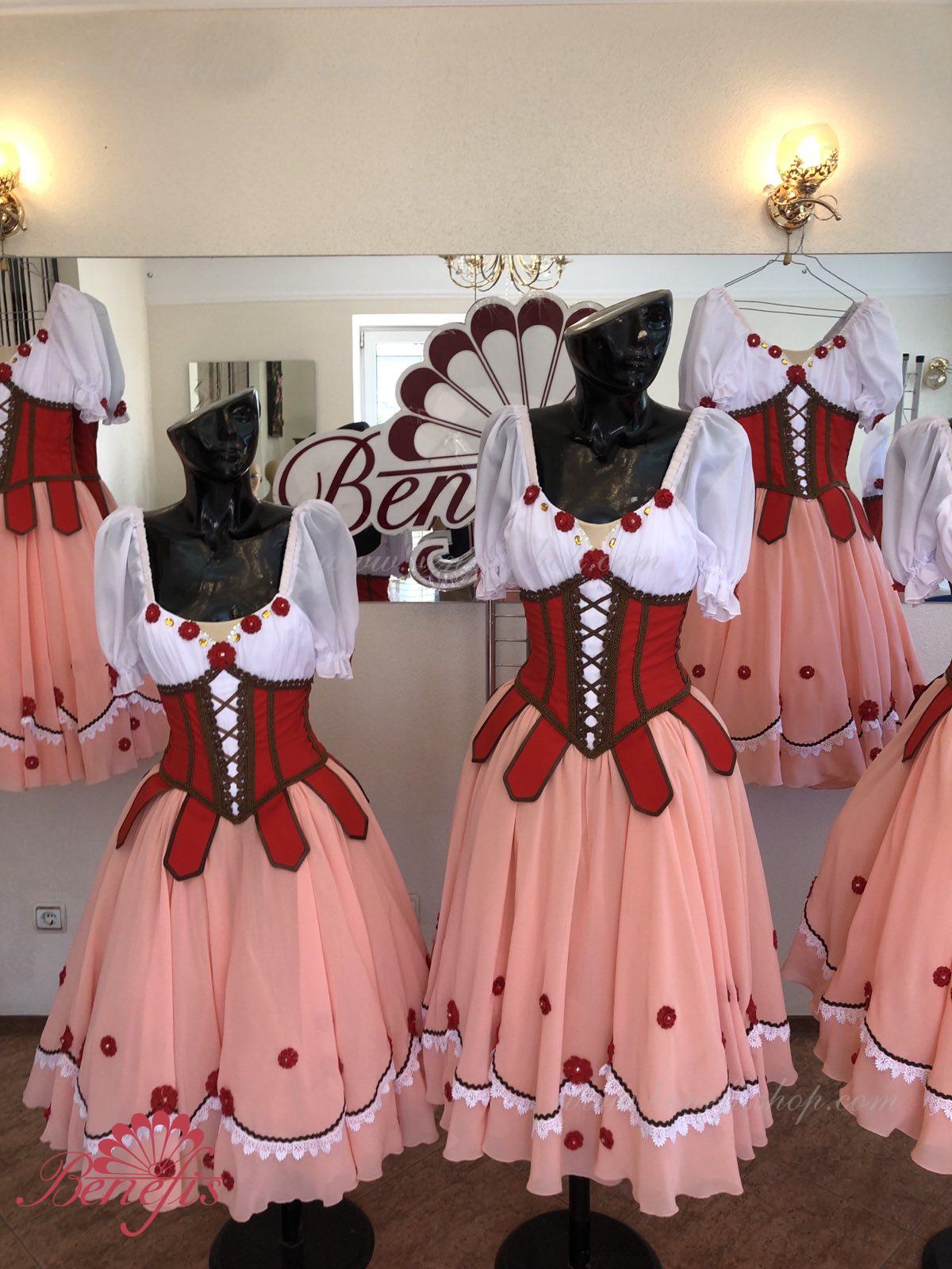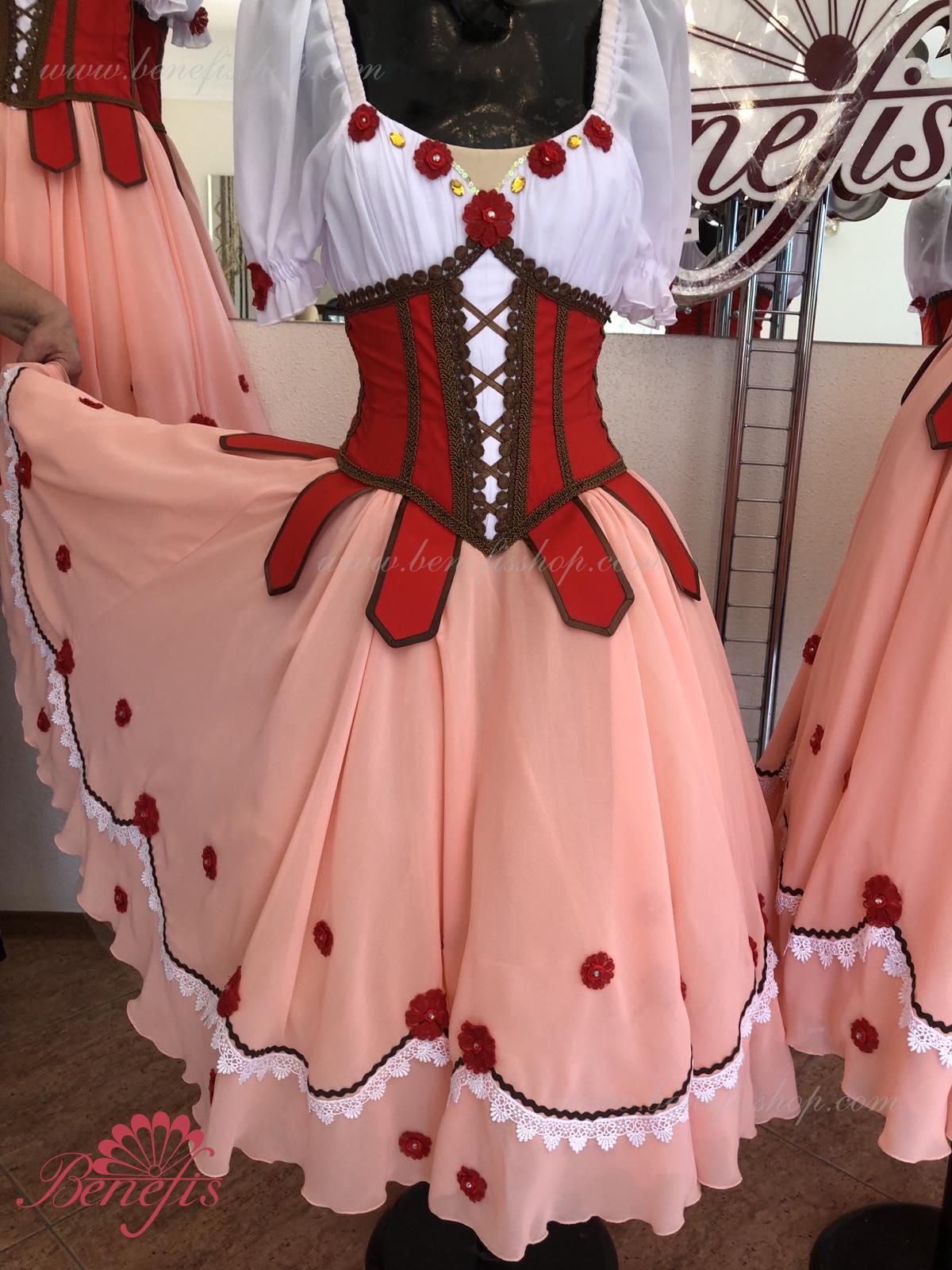 This is a professional stage costume. The bodice is made of 2 colors, the upper part of the bodice is duplicated by chiffon. Sleeves lanterns made of chiffon are gathered on an elastic band. The skirt is made of 3 layers of soft tulle, covered with light chiffon. The costume is decorated with two types of lace, the decor is complemented by flowers of various sizes.