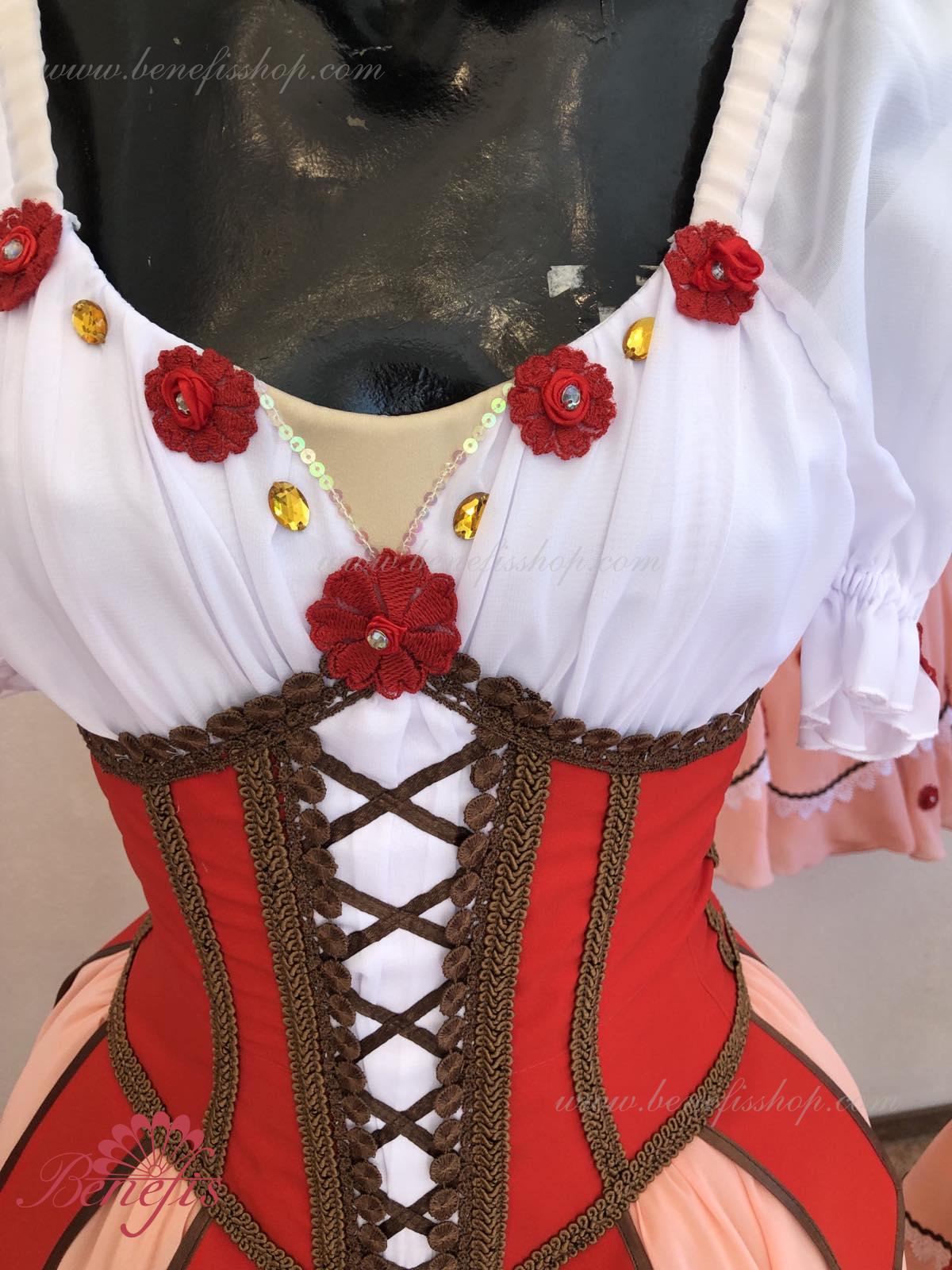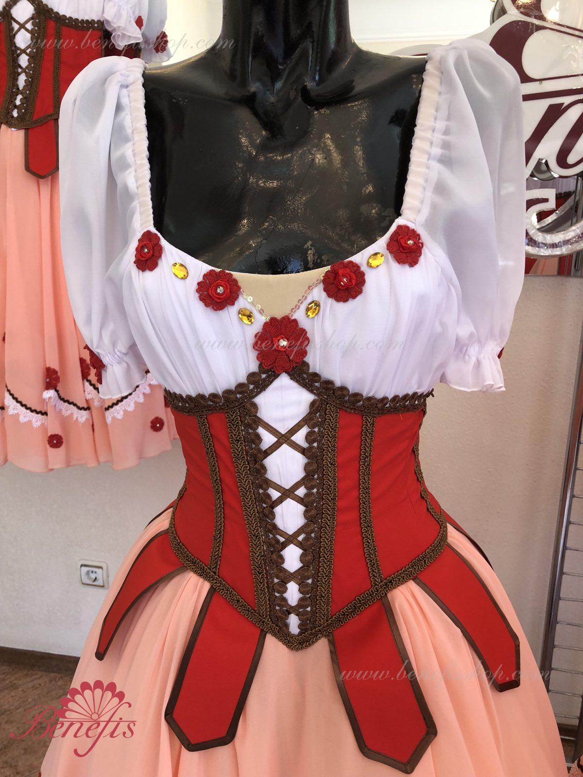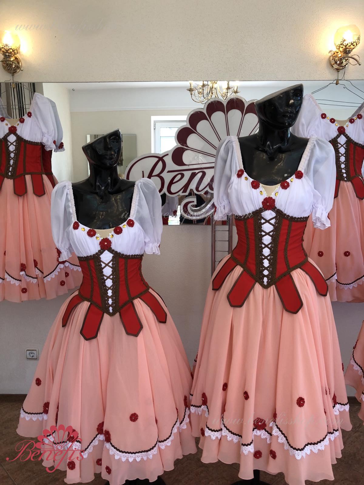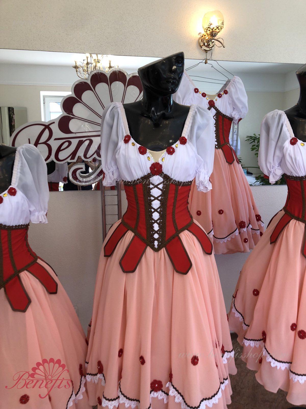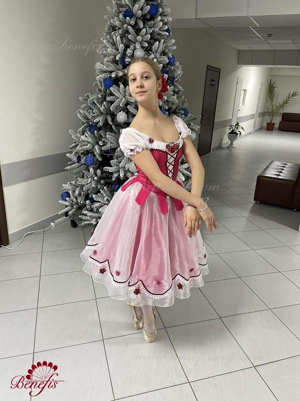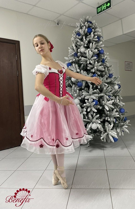 This is a professional stage costume. The bodice is made of 2 colors, the upper part of the bodice is duplicated by chiffon. Sleeves lanterns made of chiffon are gathered on an elastic band. The skirt is made of 3 layers of soft tulle, covered with light chiffon. The costume is decorated with two types of lace, the decor is complemented by flowers of various sizes.