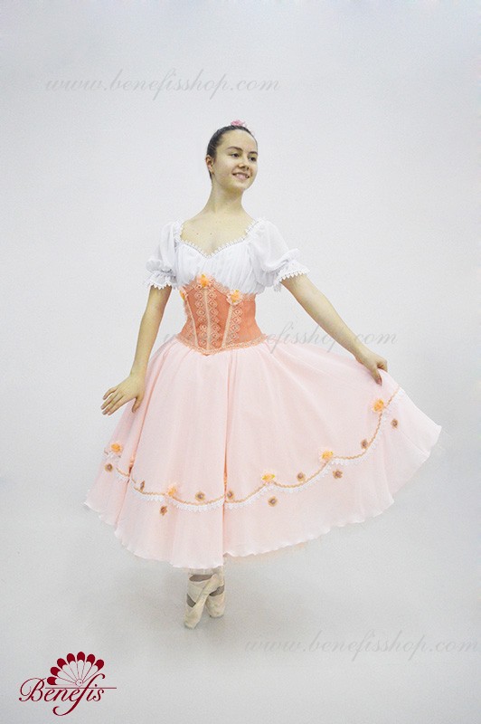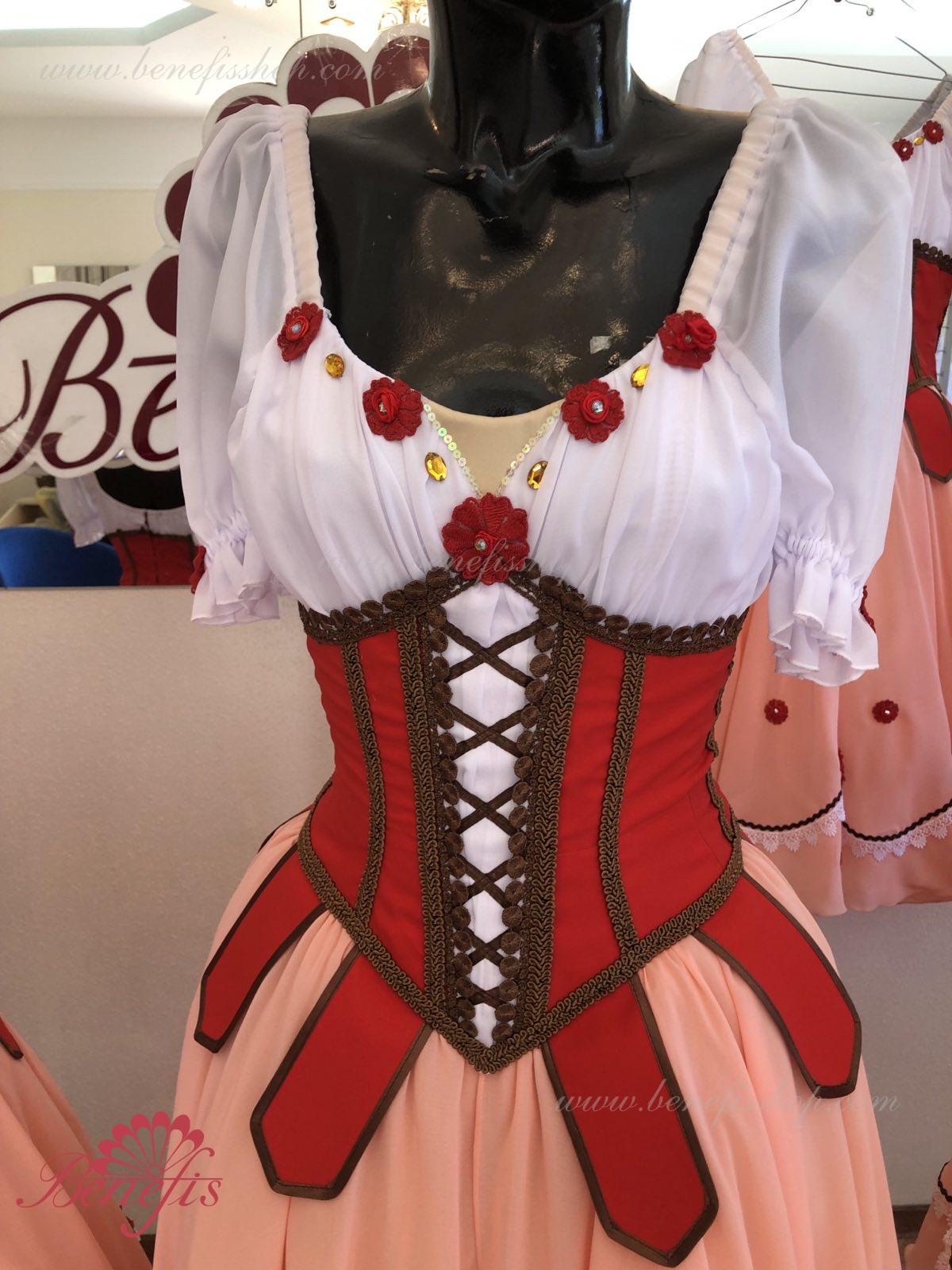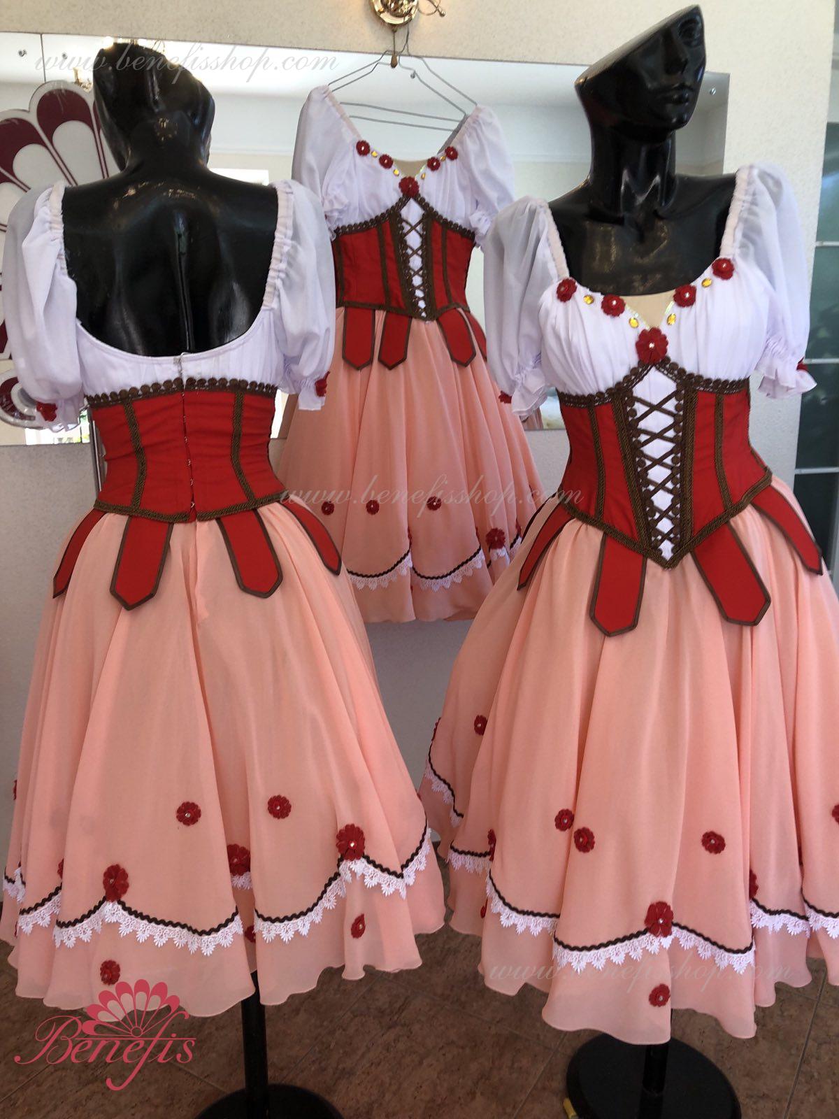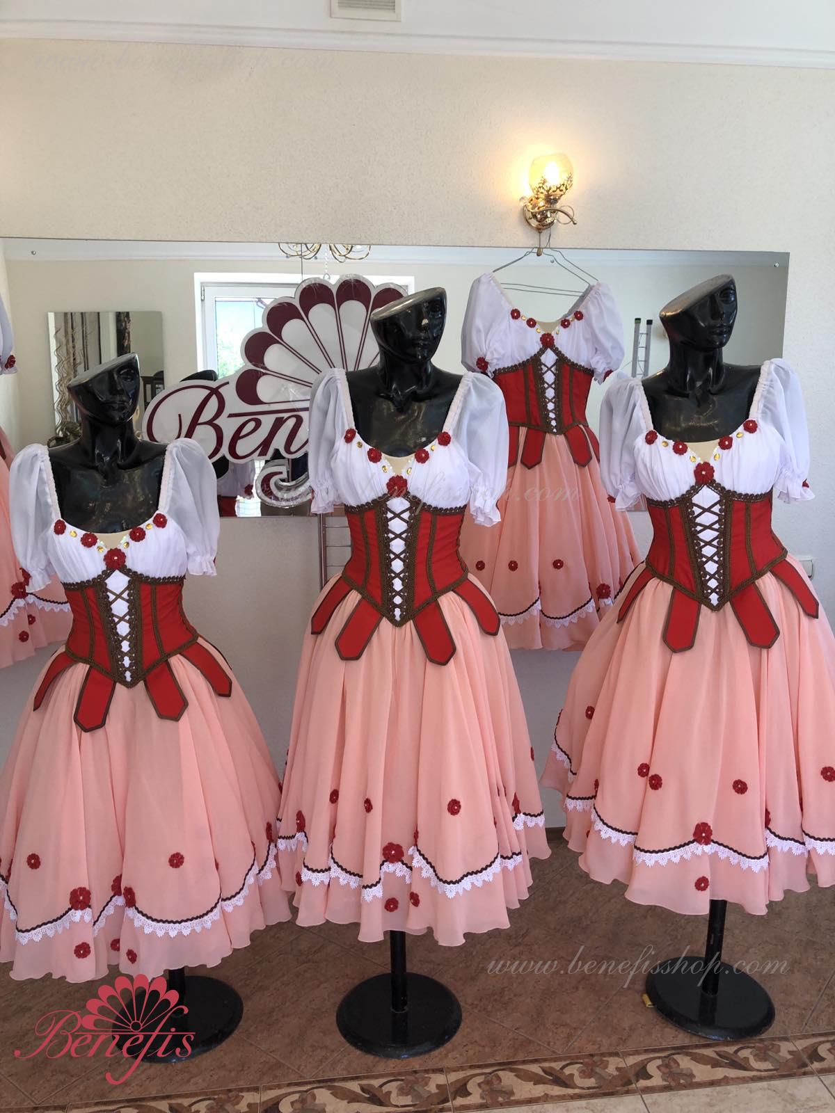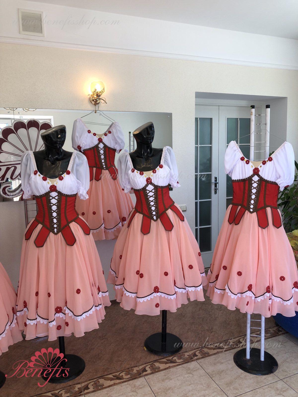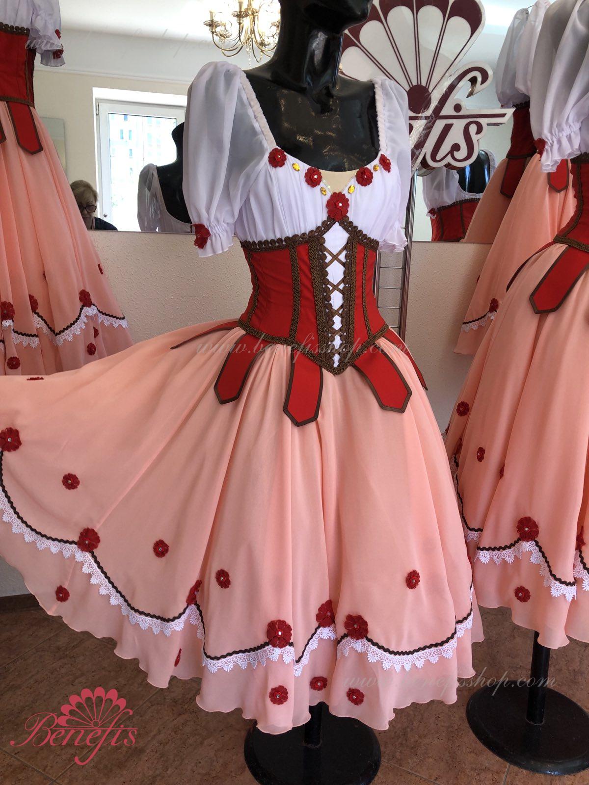 This is a professional stage costume. The bodice is made of 2 colors, the upper part of the bodice is duplicated by chiffon. Sleeves lanterns made of chiffon are gathered on an elastic band. The skirt is made of 3 layers of soft tulle, covered with light chiffon. The costume is decorated with two types of lace, the decor is complemented by flowers of various sizes.