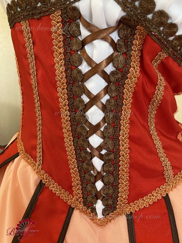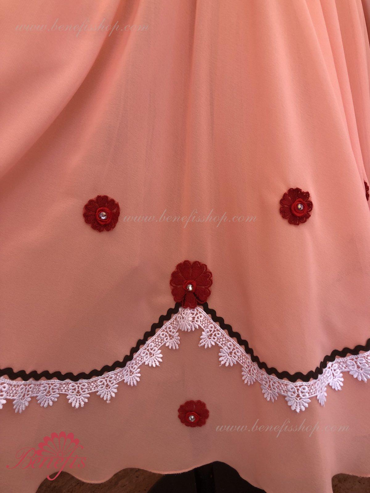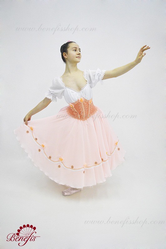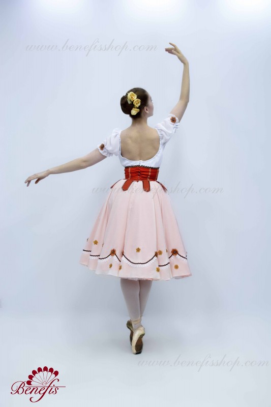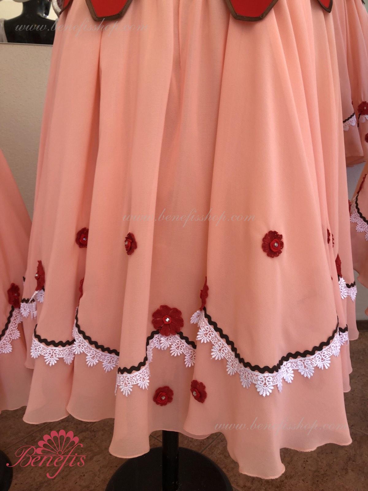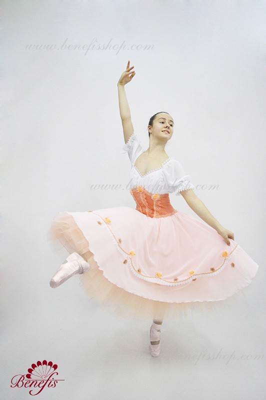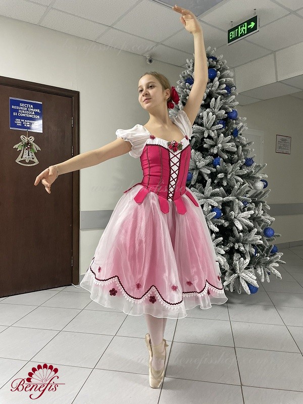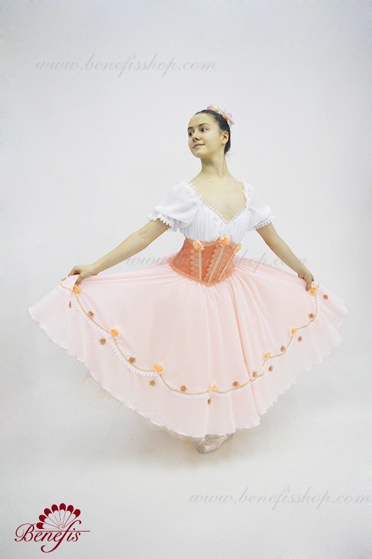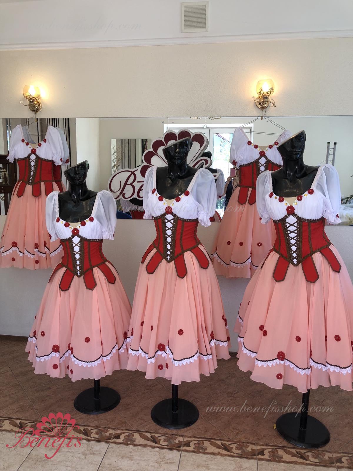 This is a professional stage costume. The bodice is made of 2 colors, the upper part of the bodice is duplicated by chiffon. Sleeves lanterns made of chiffon are gathered on an elastic band. The skirt is made of 3 layers of soft tulle, covered with light chiffon. The costume is decorated with two types of lace, the decor is complemented by flowers of various sizes.