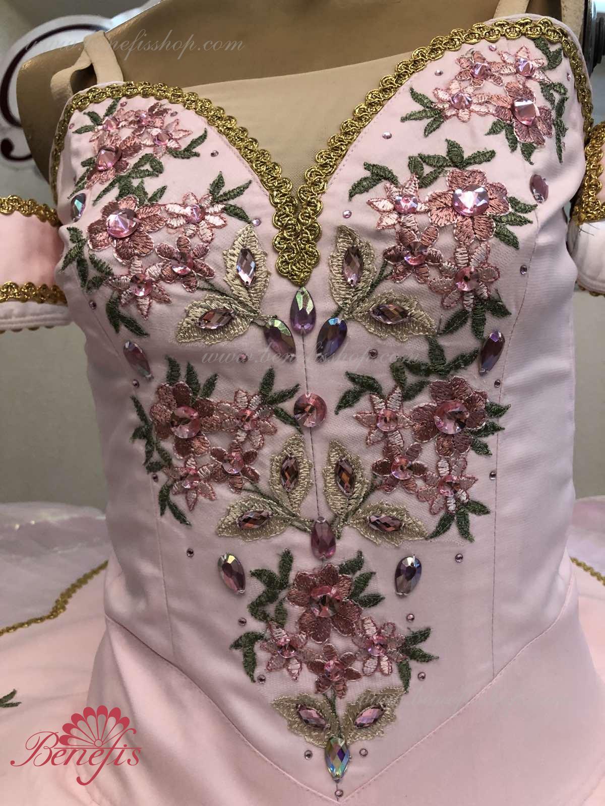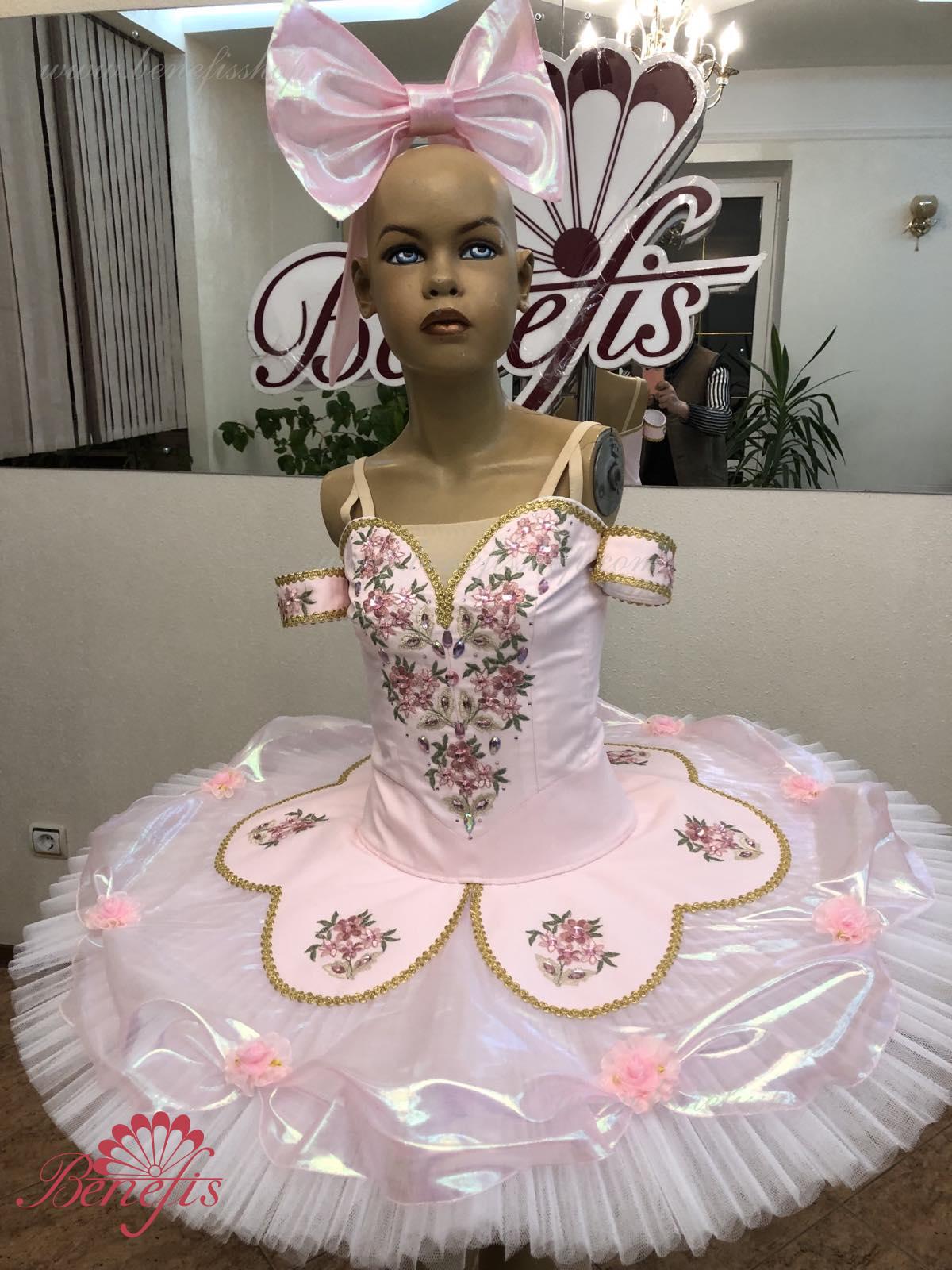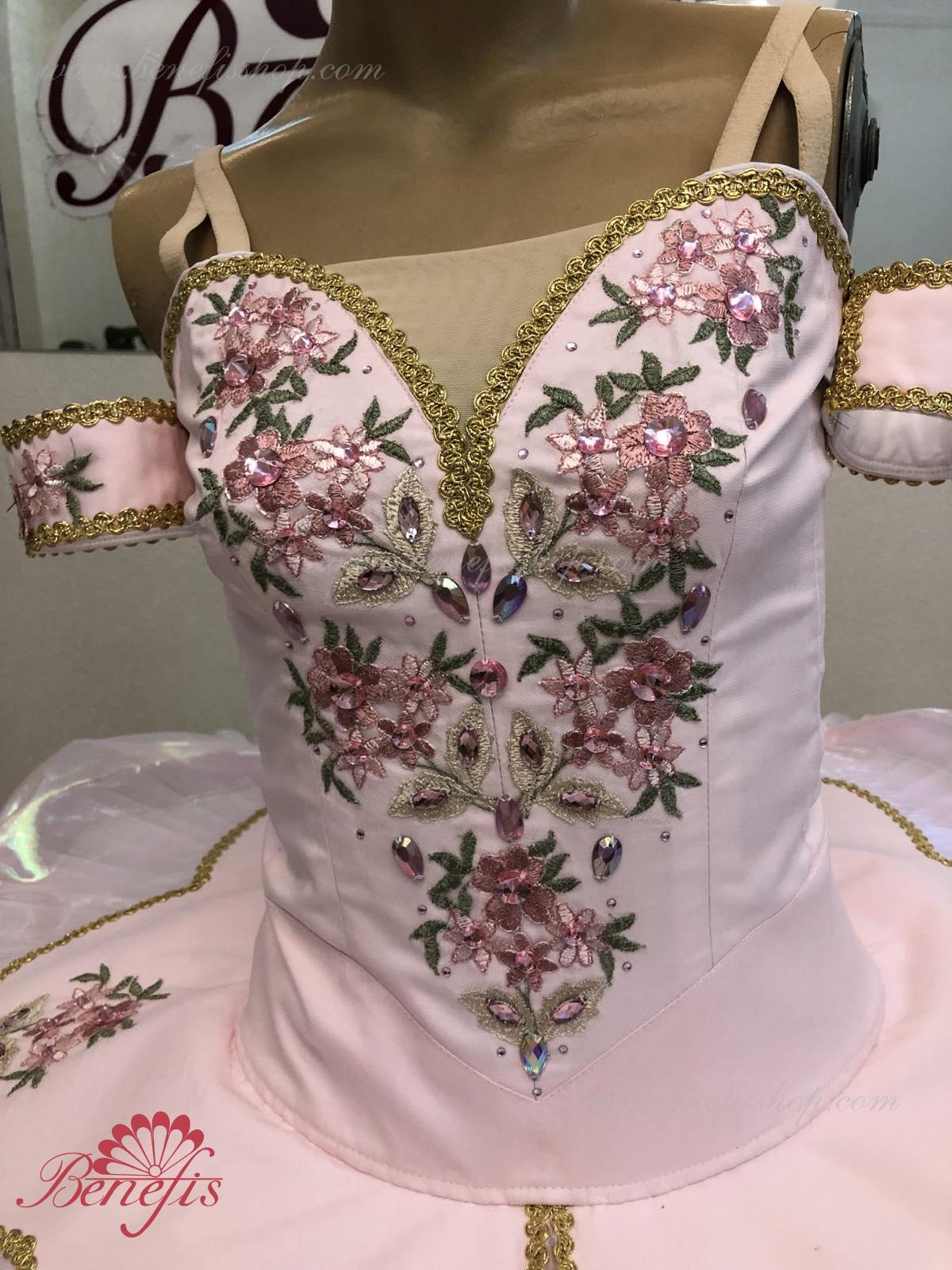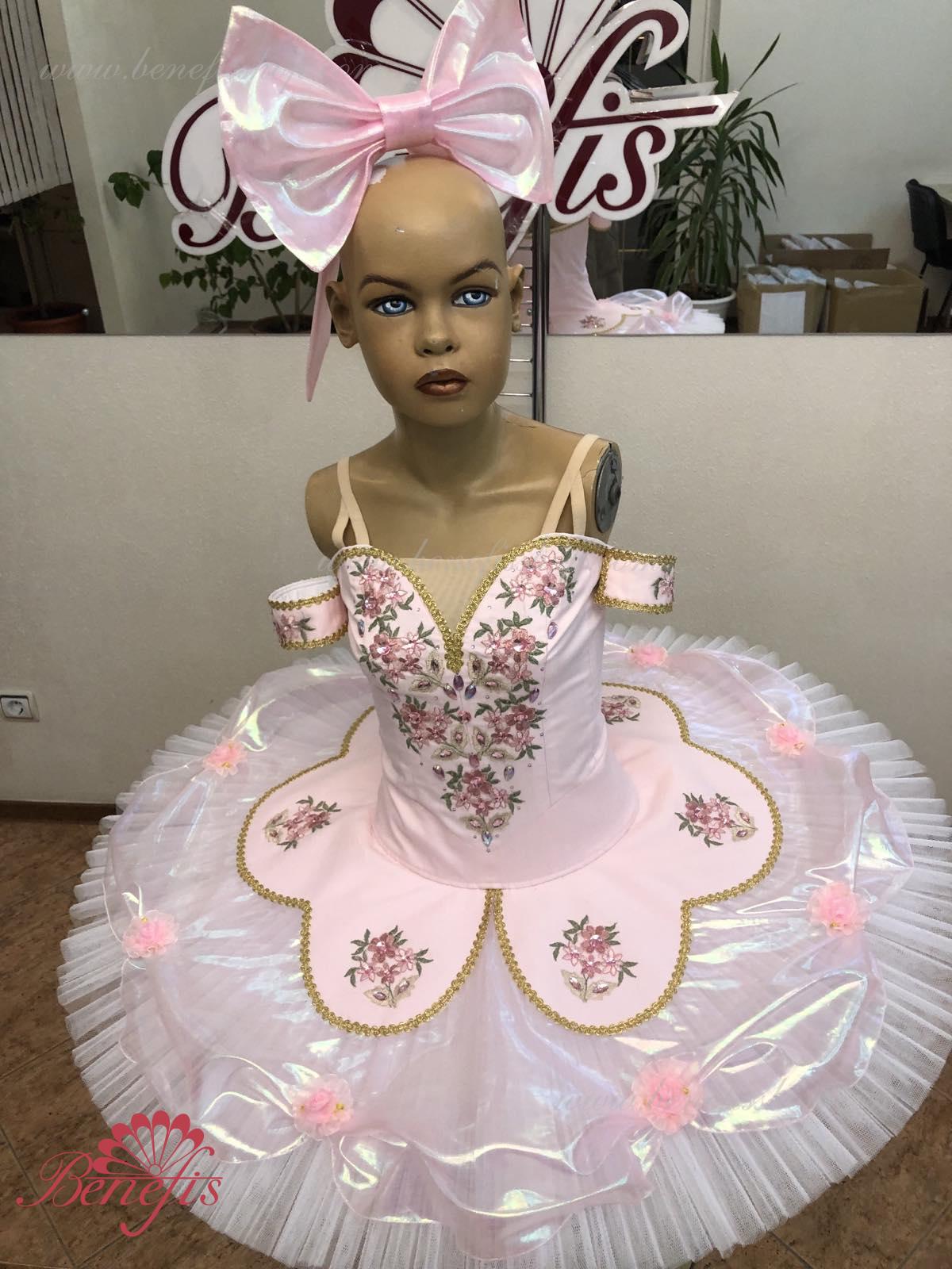 Details: costume, bow, sleeves. This professional stage costume is based on the professional basic tutu #T0001B (see the section "Basic tutus"). The bodice is made of semi-elastic dense fabric. The bodice is fastened with hooks in two rows for easy adjustment, and the inner cord is used to tighten the bodice in the chest area. A special elegance to the costume is given by the elegant braid, which is used on the bodice to create a V-shaped contour and along the edge of the flower-shaped tire. The top layer of the tutu is made of nylon, decorated with drapery and decorated with artificial flowers. Gold or silver braid, applications, sequins, rhinestones, glass beads and beads are used as jewelry. All the decor elements are matched to the suit. A bow is attached to the costume.
