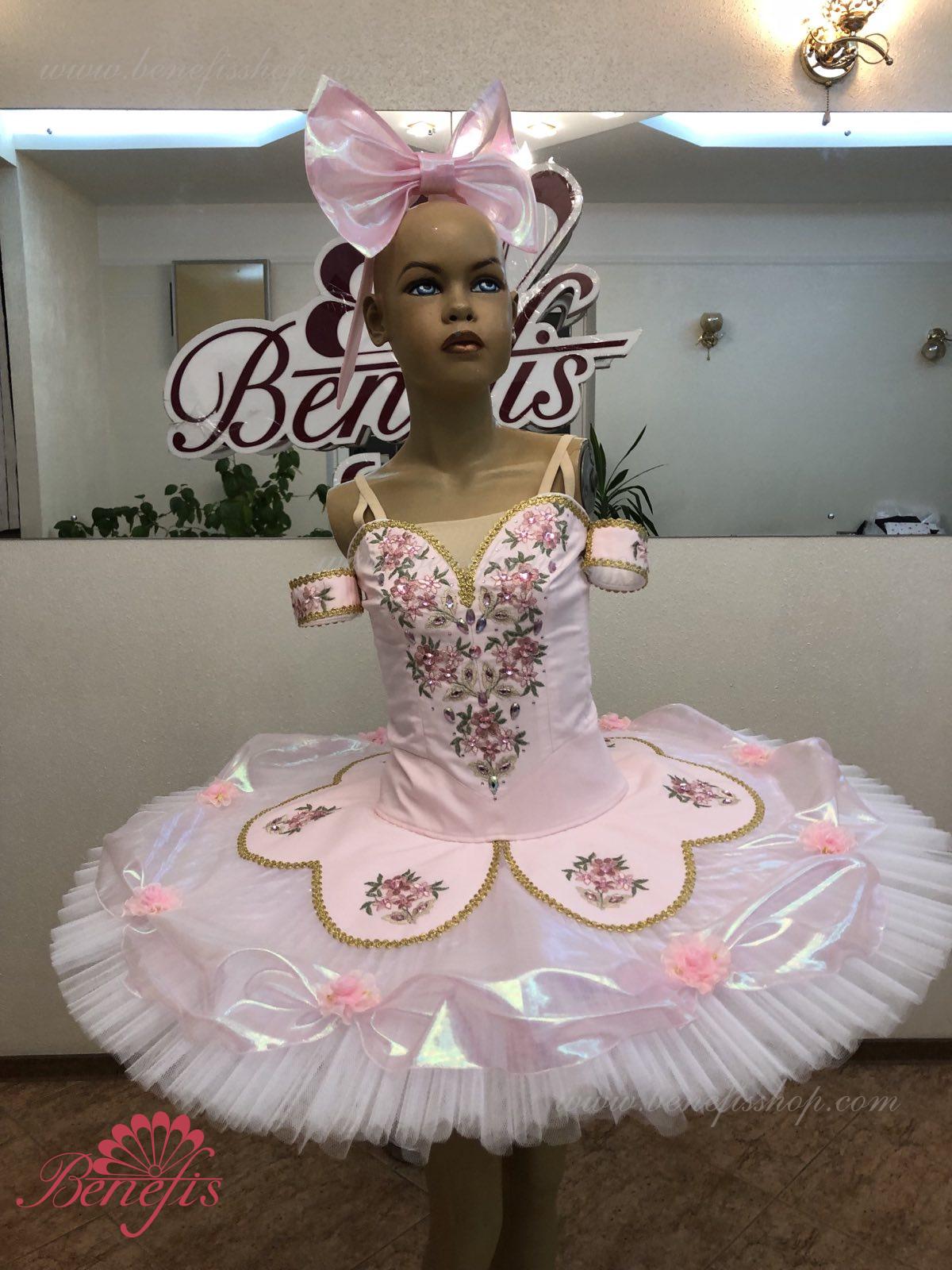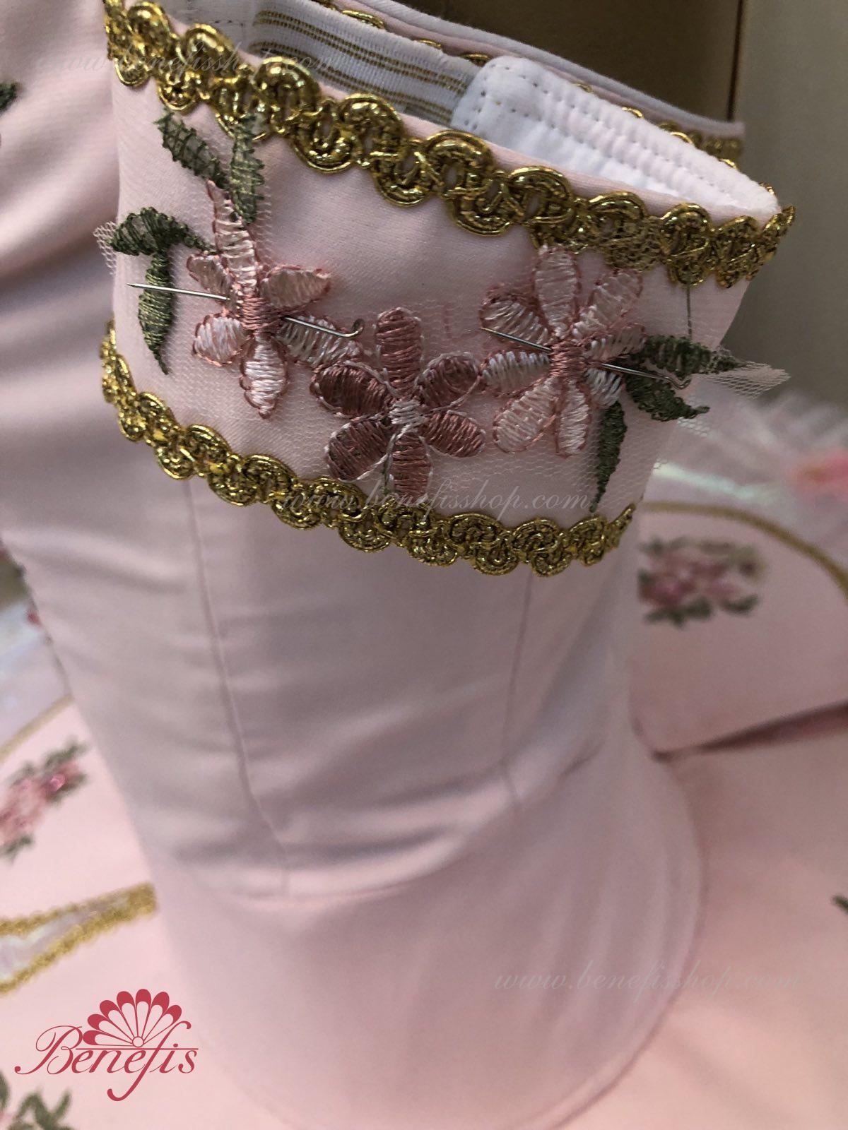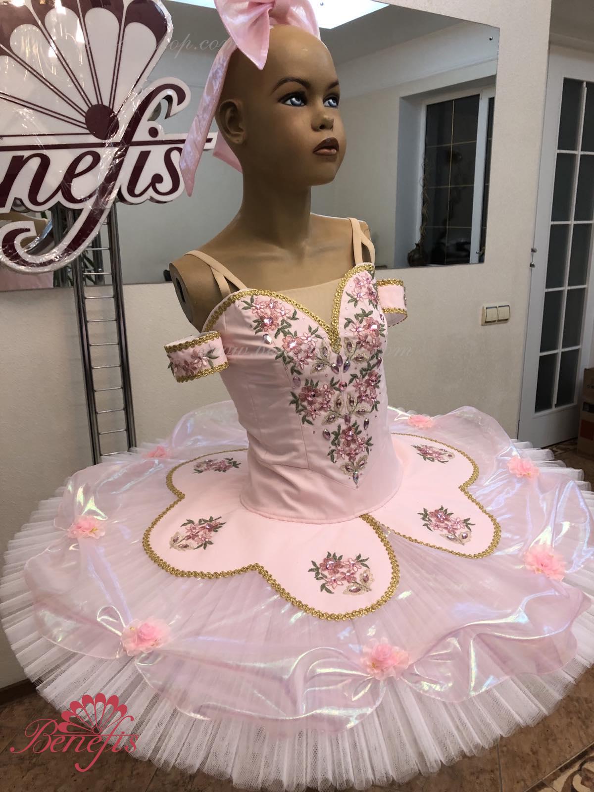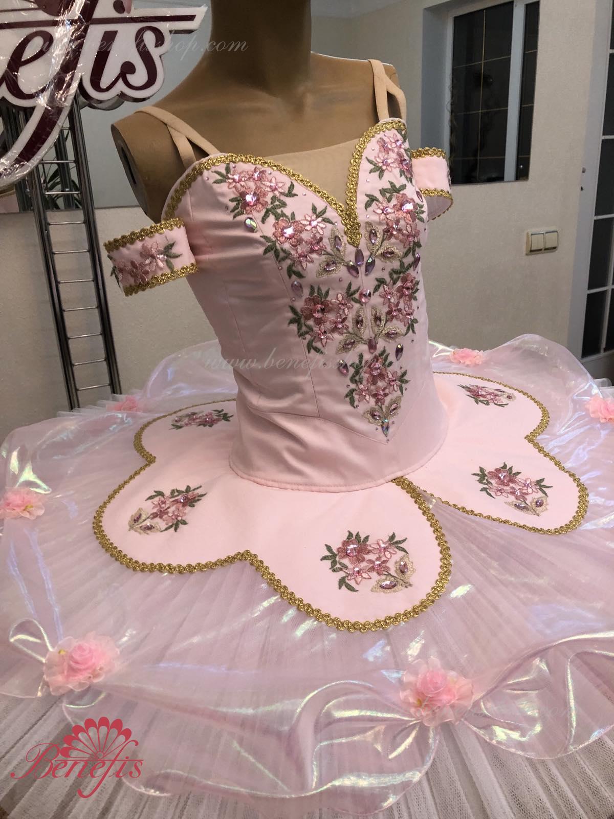 Details: costume, bow, sleeves. This professional stage costume is based on the professional basic tutu #T0001B (see the section "Basic tutus"). The bodice is made of semi-elastic dense fabric. The bodice is fastened with hooks in two rows for easy adjustment, and the inner cord is used to tighten the bodice in the chest area. A special elegance to the costume is given by the elegant braid, which is used on the bodice to create a V-shaped contour and along the edge of the flower-shaped tire. The top layer of the tutu is made of nylon, decorated with drapery and decorated with artificial flowers. Gold or silver braid, applications, sequins, rhinestones, glass beads and beads are used as jewelry. All the decor elements are matched to the suit. A bow is attached to the costume.