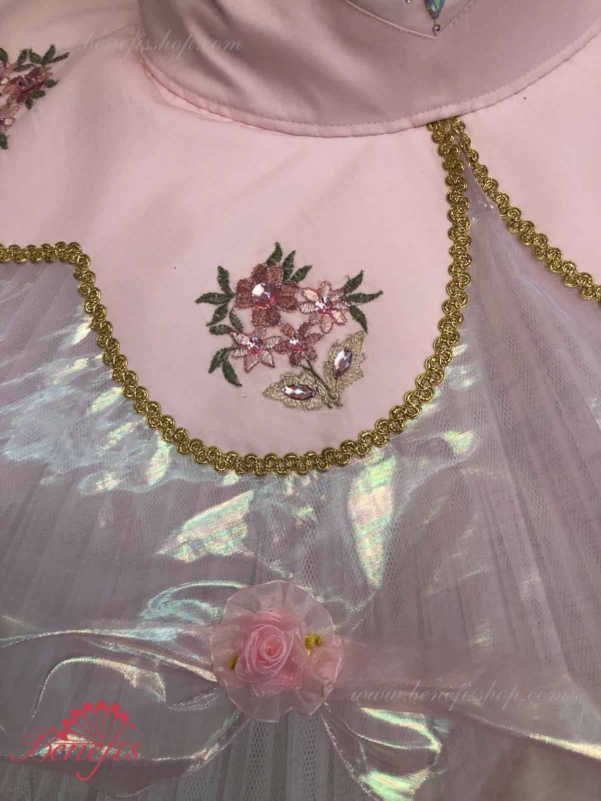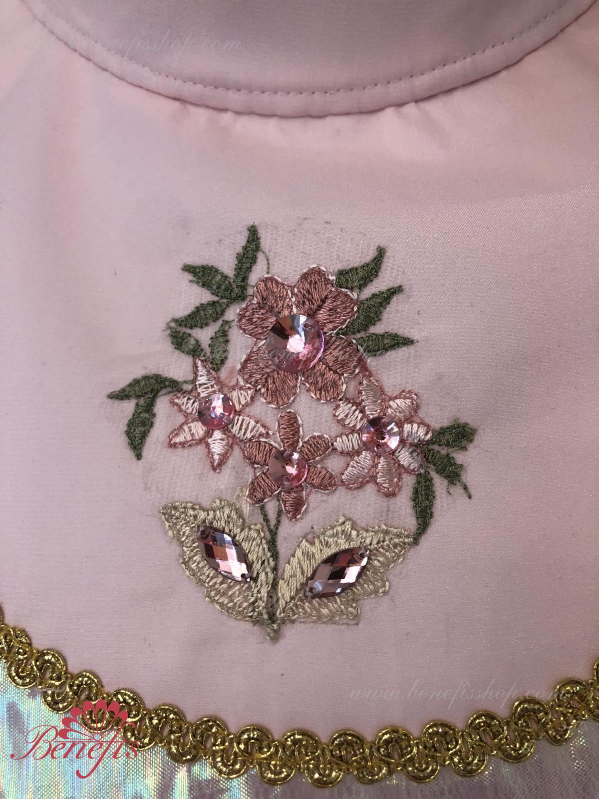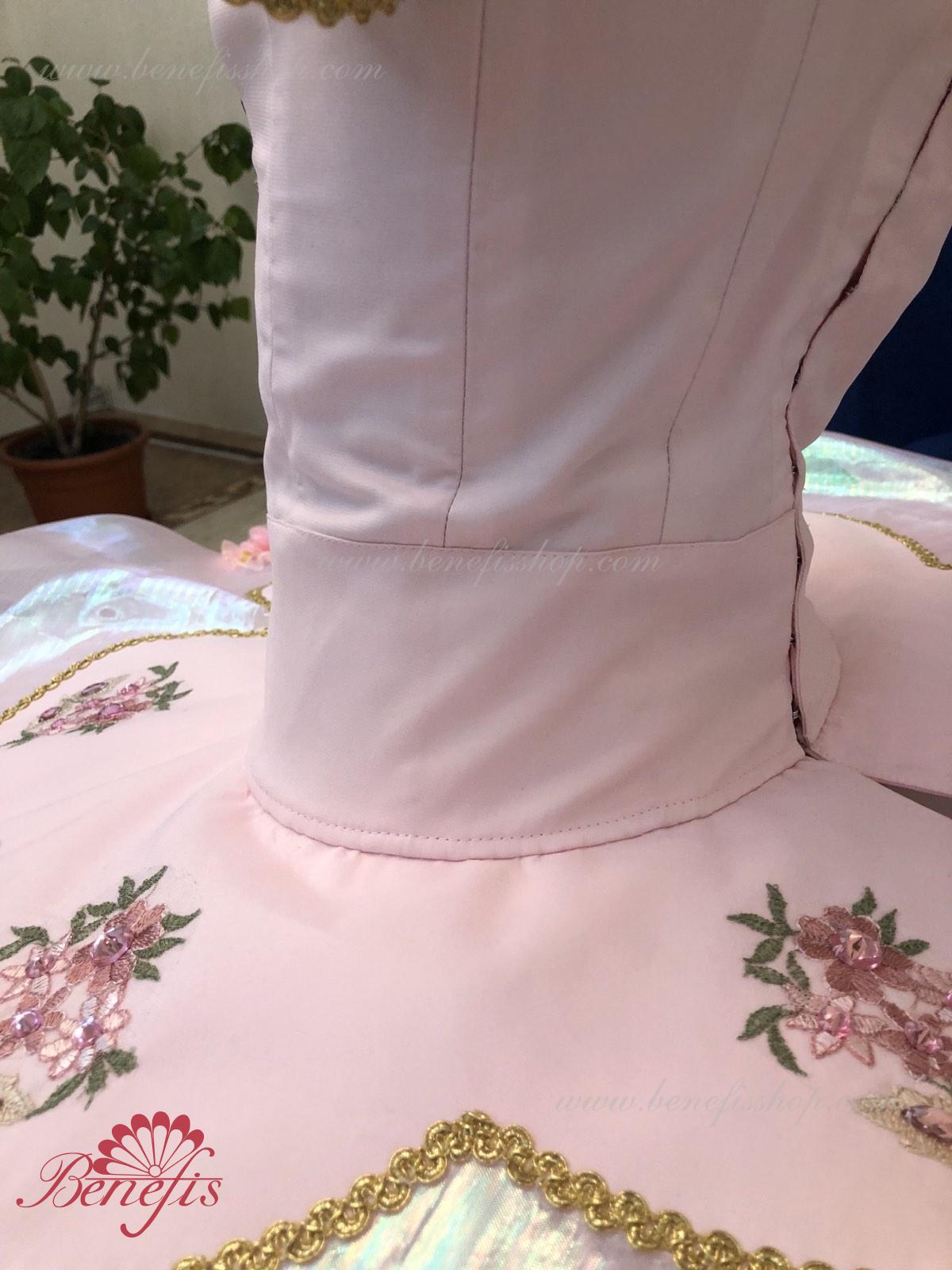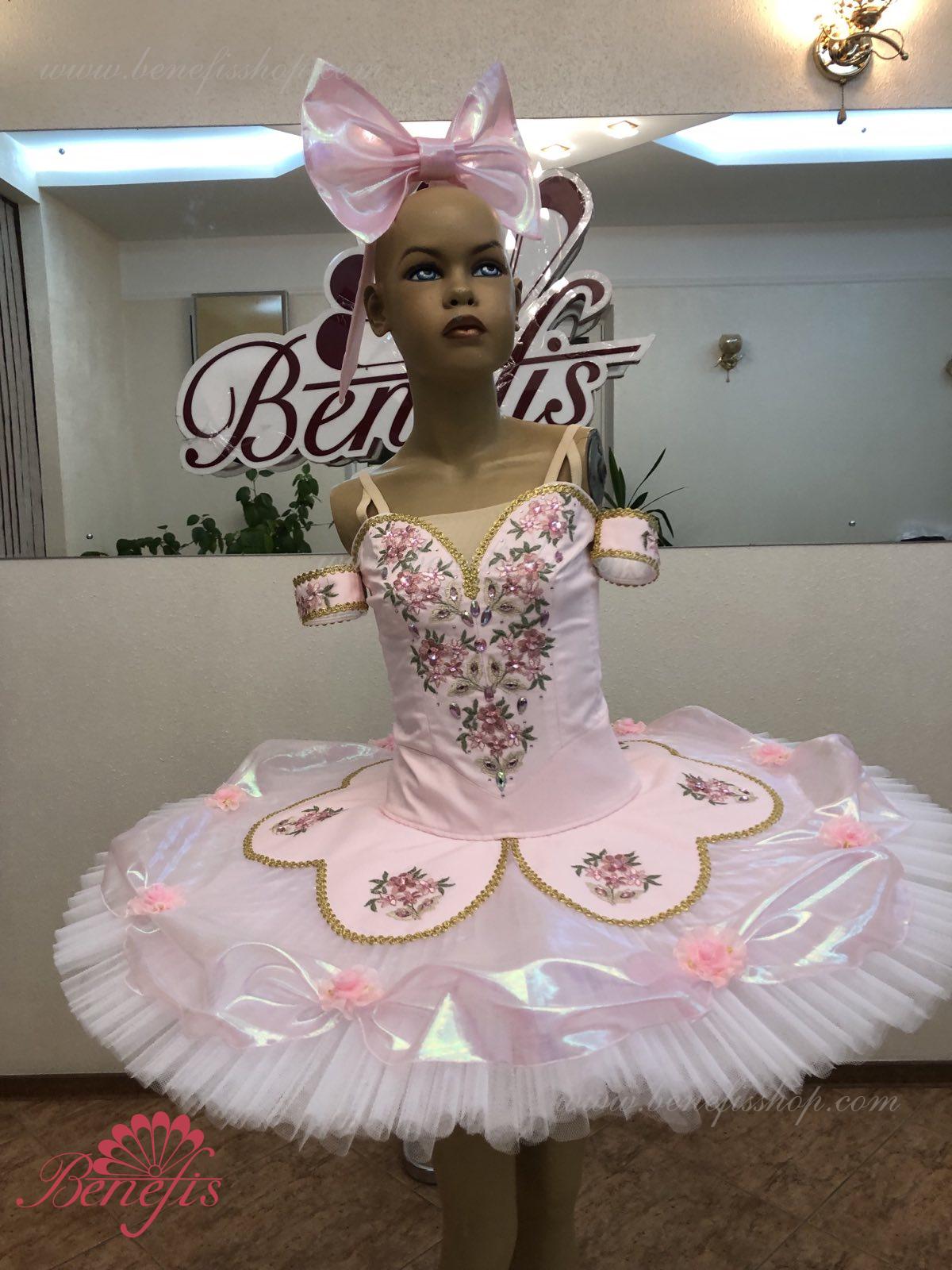 Details: costume, bow, sleeves. This professional stage costume is based on the professional basic tutu #T0001B (see the section "Basic tutus"). The bodice is made of semi-elastic dense fabric. The bodice is fastened with hooks in two rows for easy adjustment, and the inner cord is used to tighten the bodice in the chest area. A special elegance to the costume is given by the elegant braid, which is used on the bodice to create a V-shaped contour and along the edge of the flower-shaped tire. The top layer of the tutu is made of nylon, decorated with drapery and decorated with artificial flowers. Gold or silver braid, applications, sequins, rhinestones, glass beads and beads are used as jewelry. All the decor elements are matched to the suit. A bow is attached to the costume.