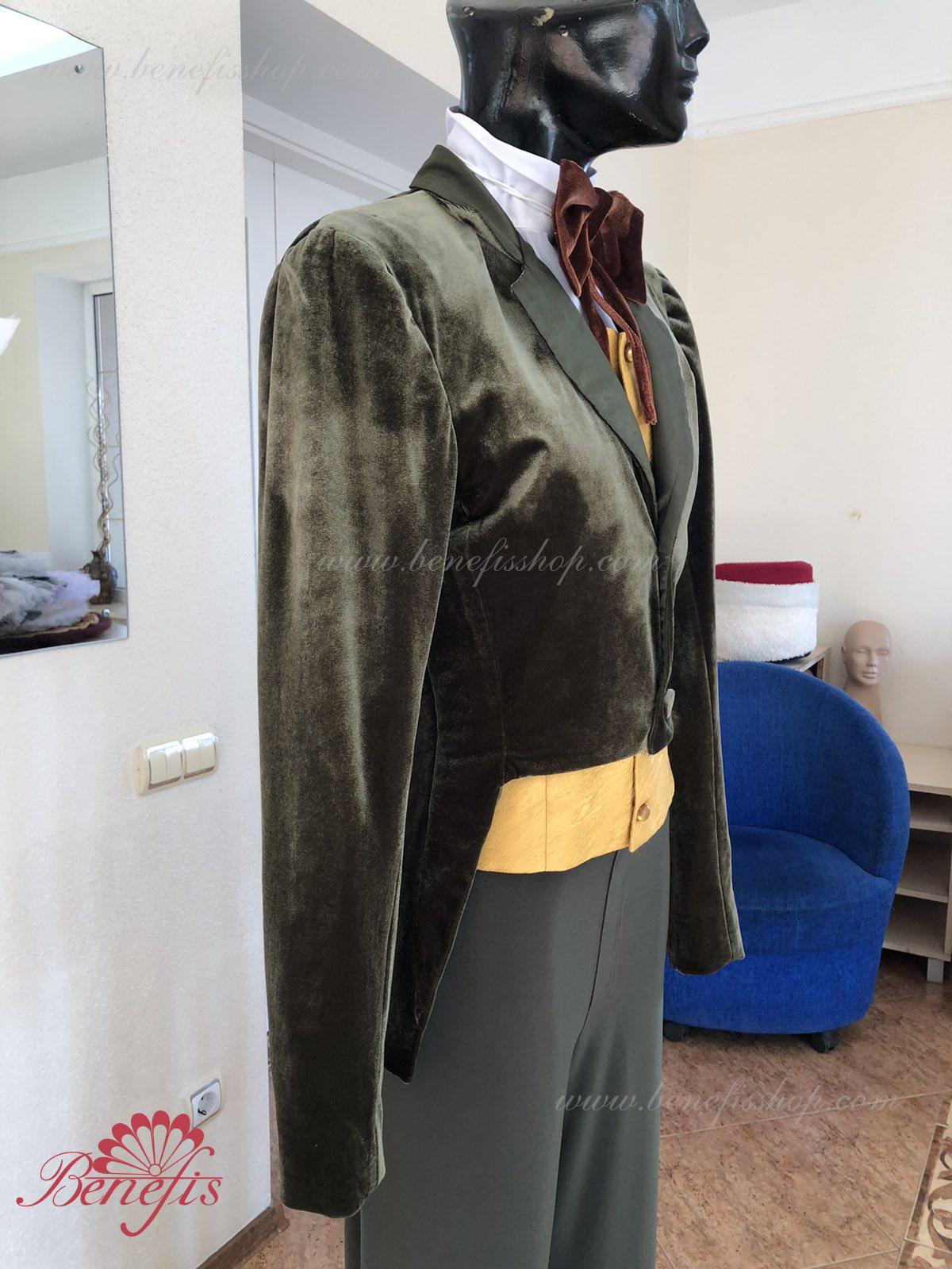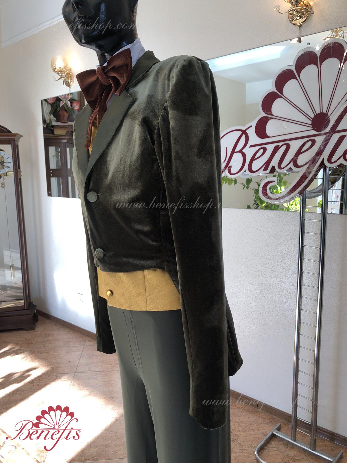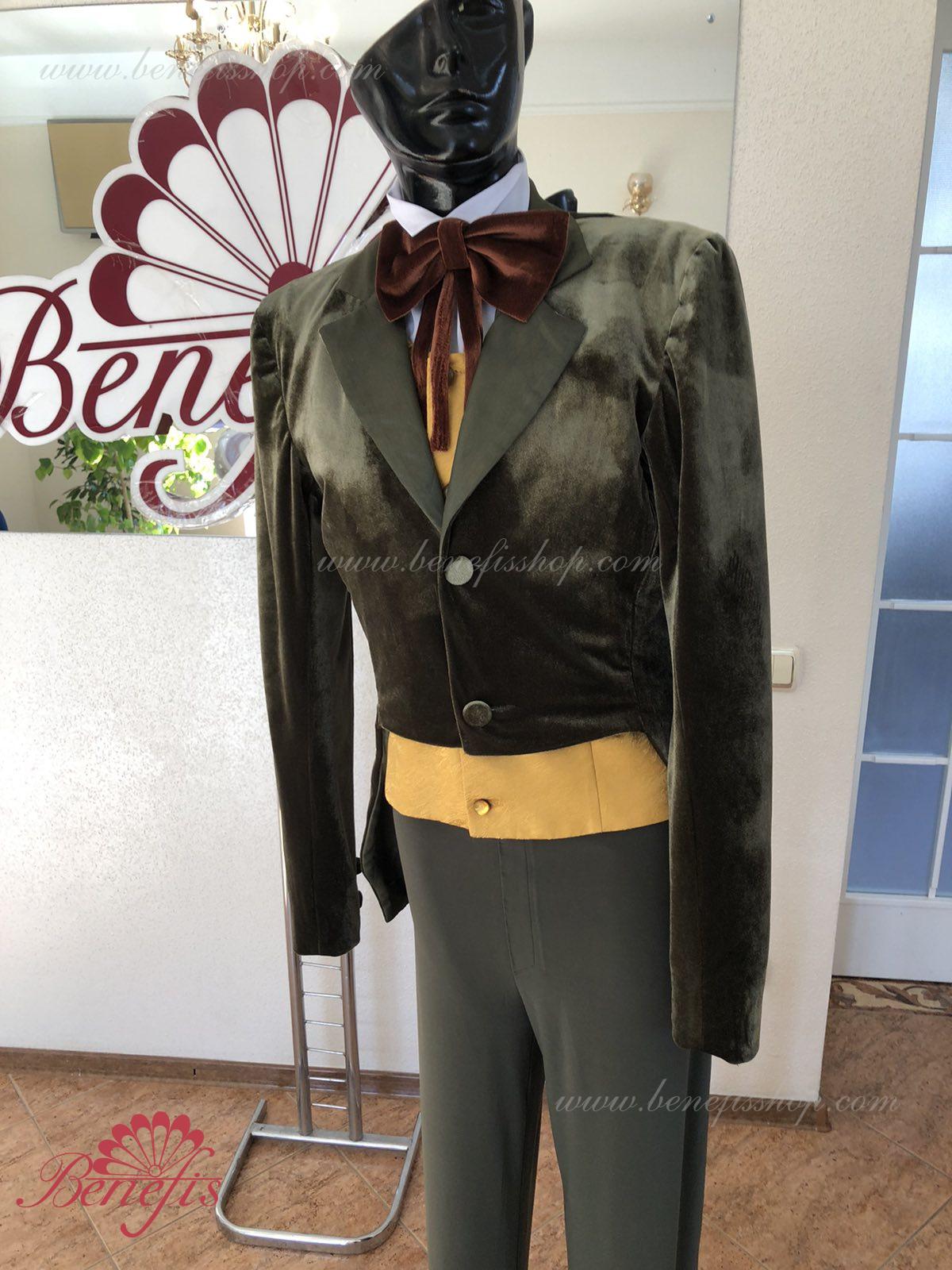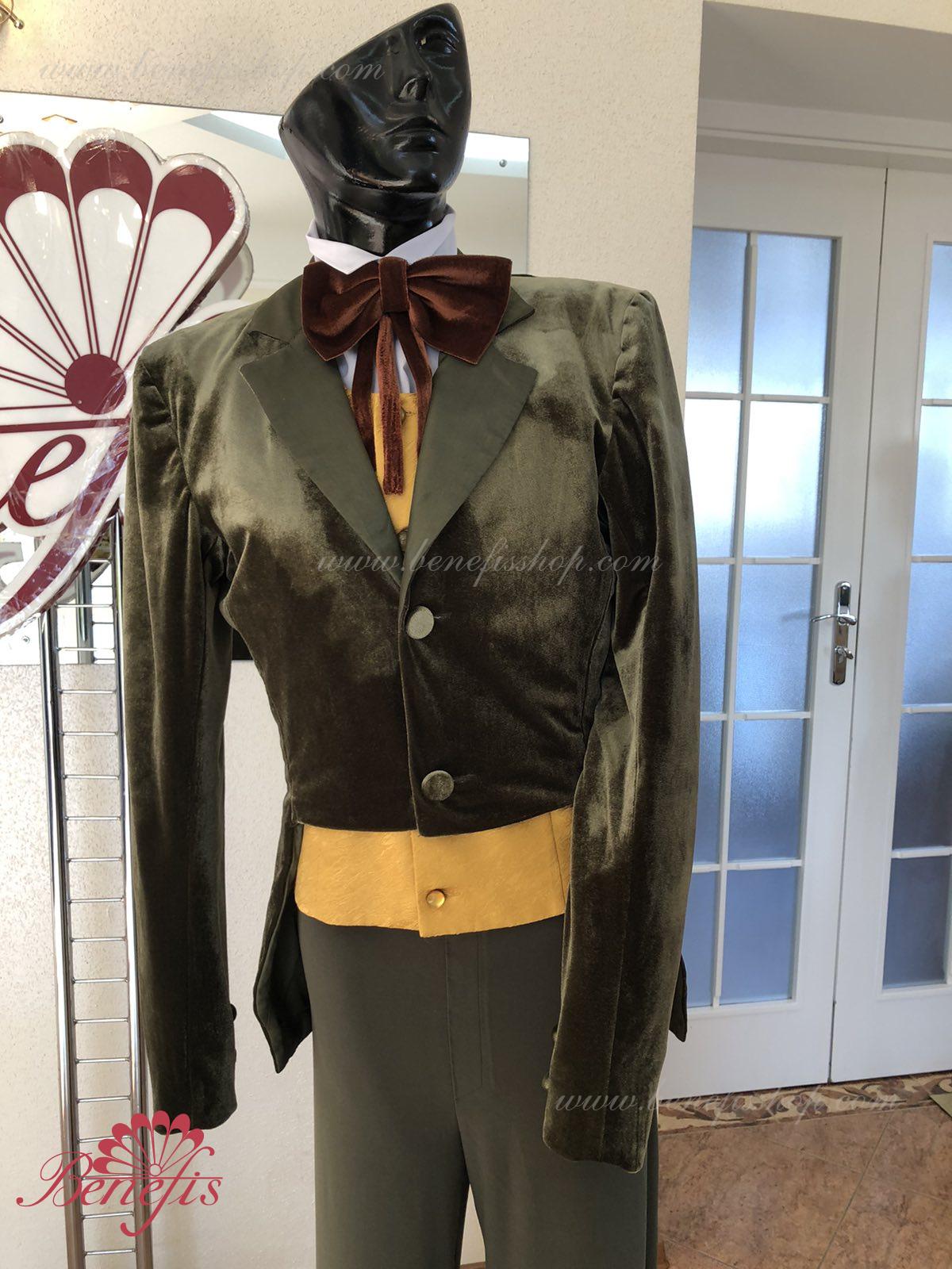 Details: Tuxedo, bow tie. This is a professional stage costume, made of semi-elastic dense fabric. Golden satin inserts are used as decoration. The costume can be made in any color.