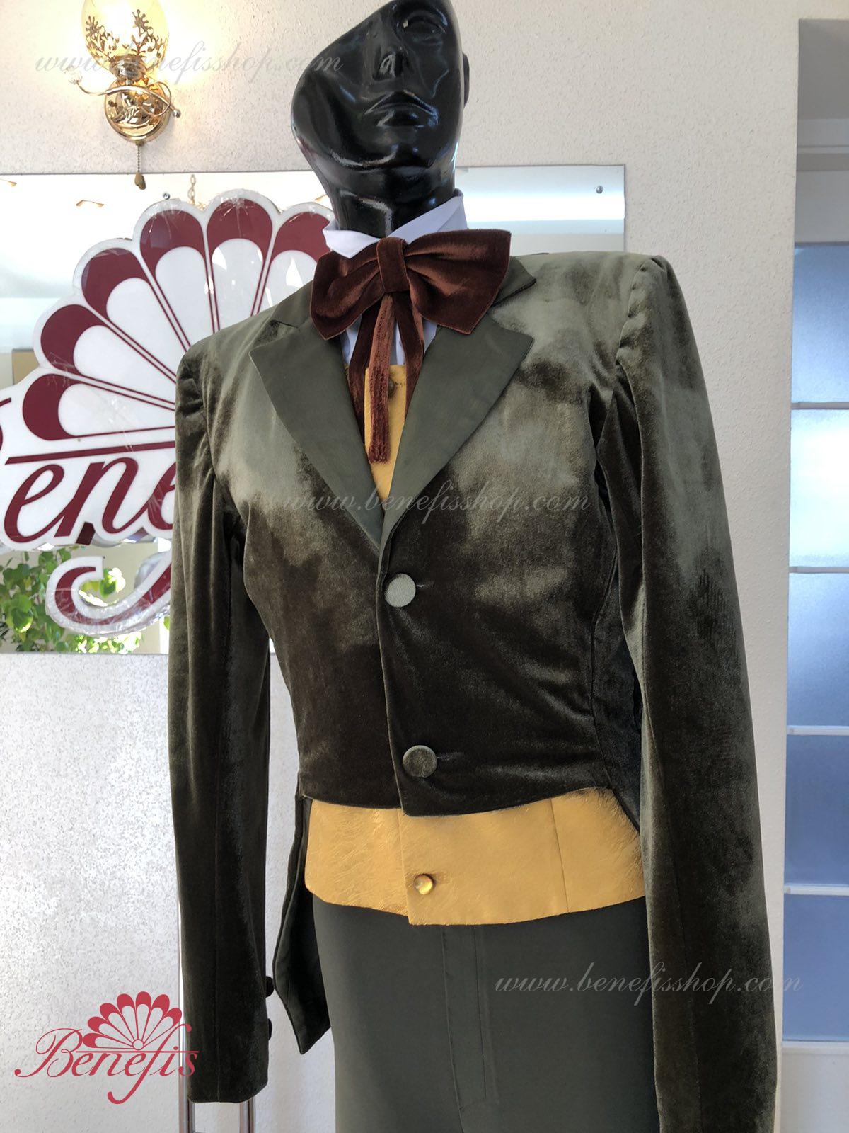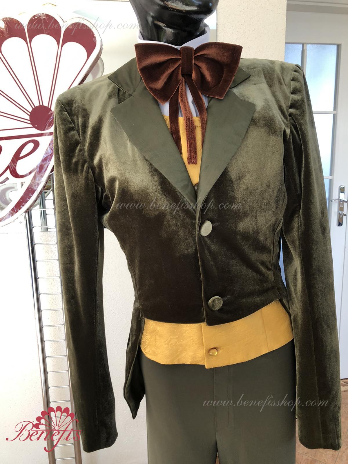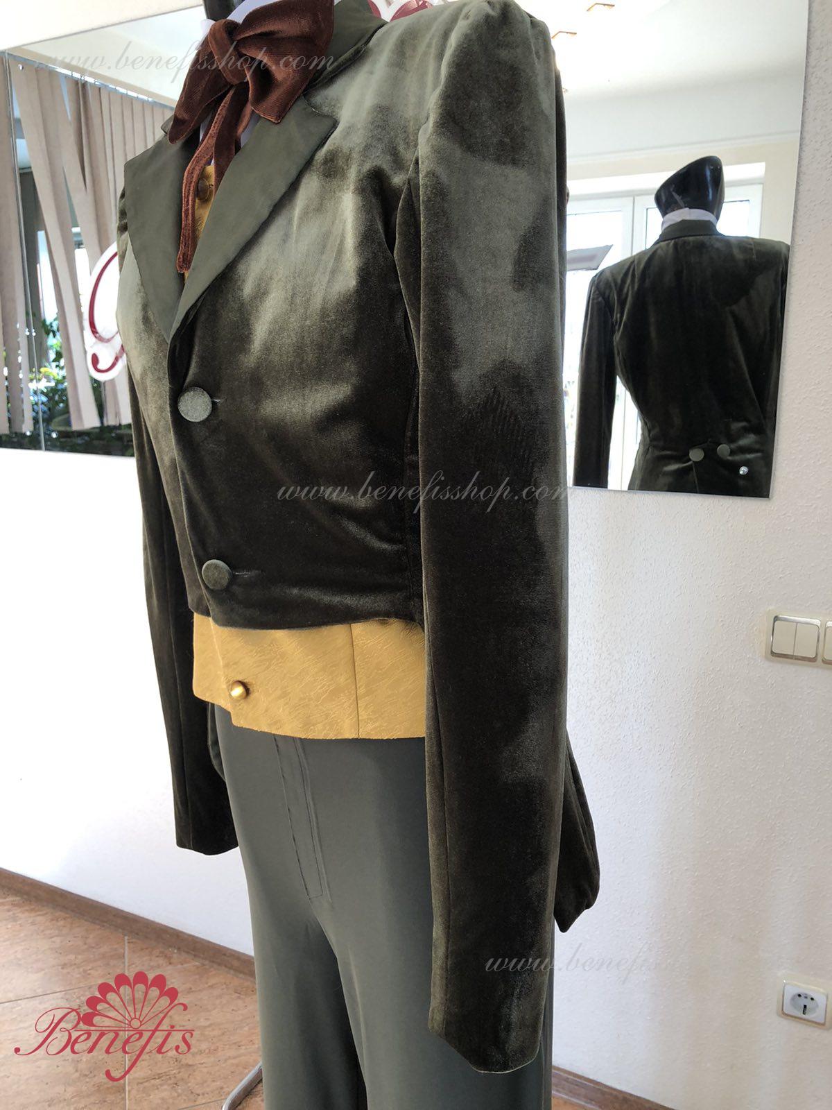 Details: Tuxedo, bow tie. This is a professional stage costume, made of semi-elastic dense fabric. Golden satin inserts are used as decoration. The costume can be made in any color.