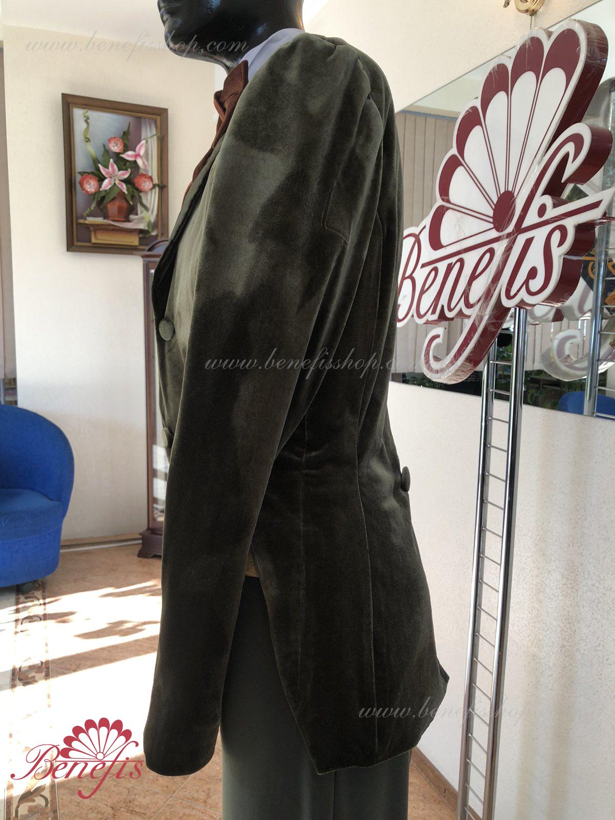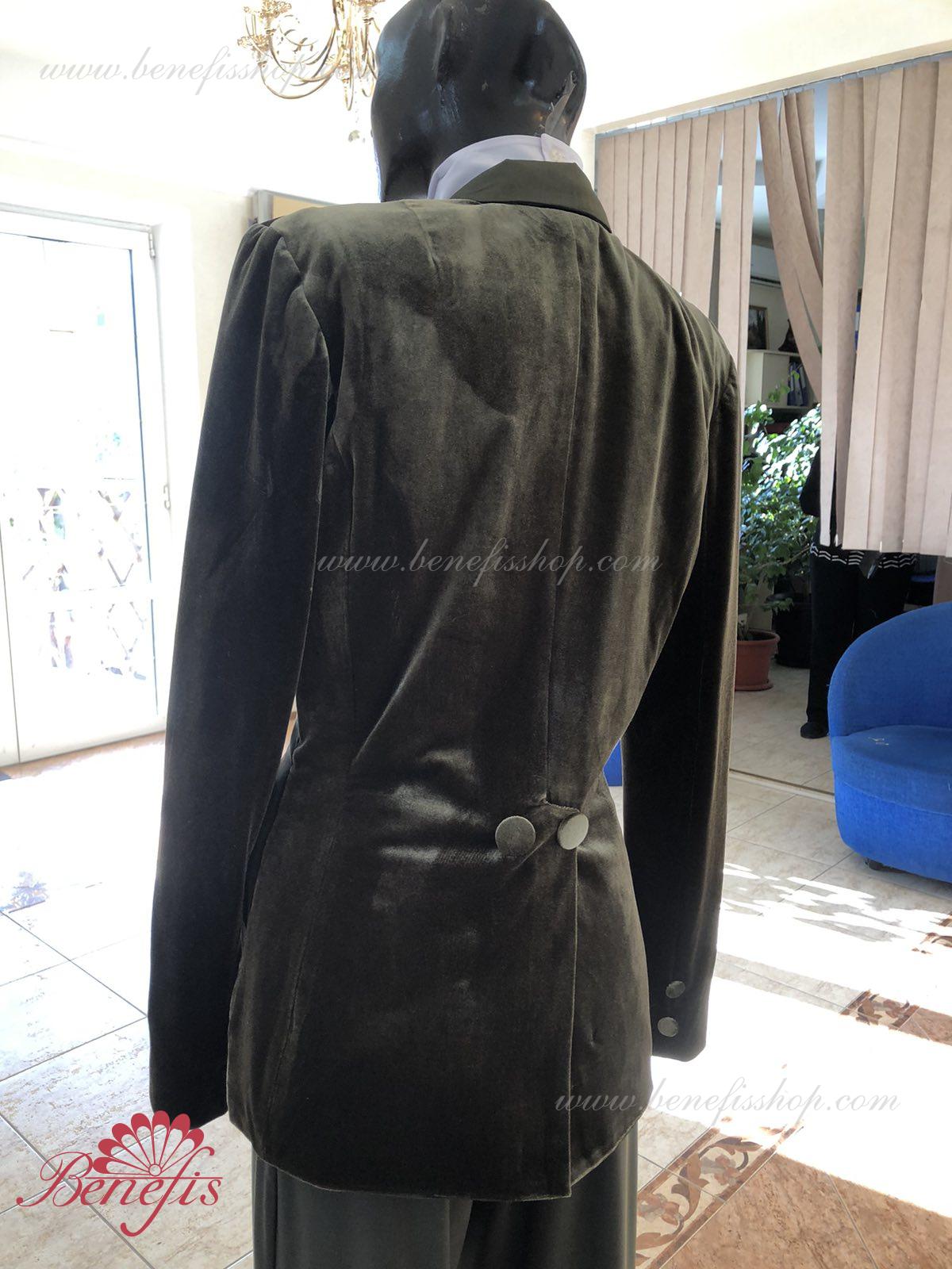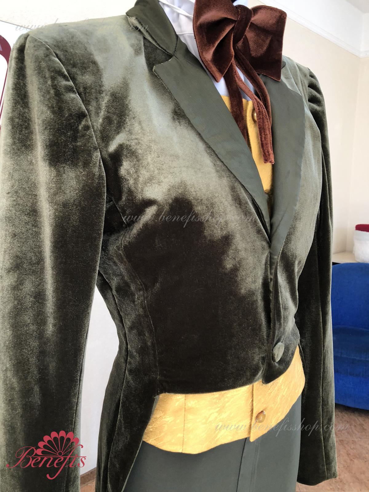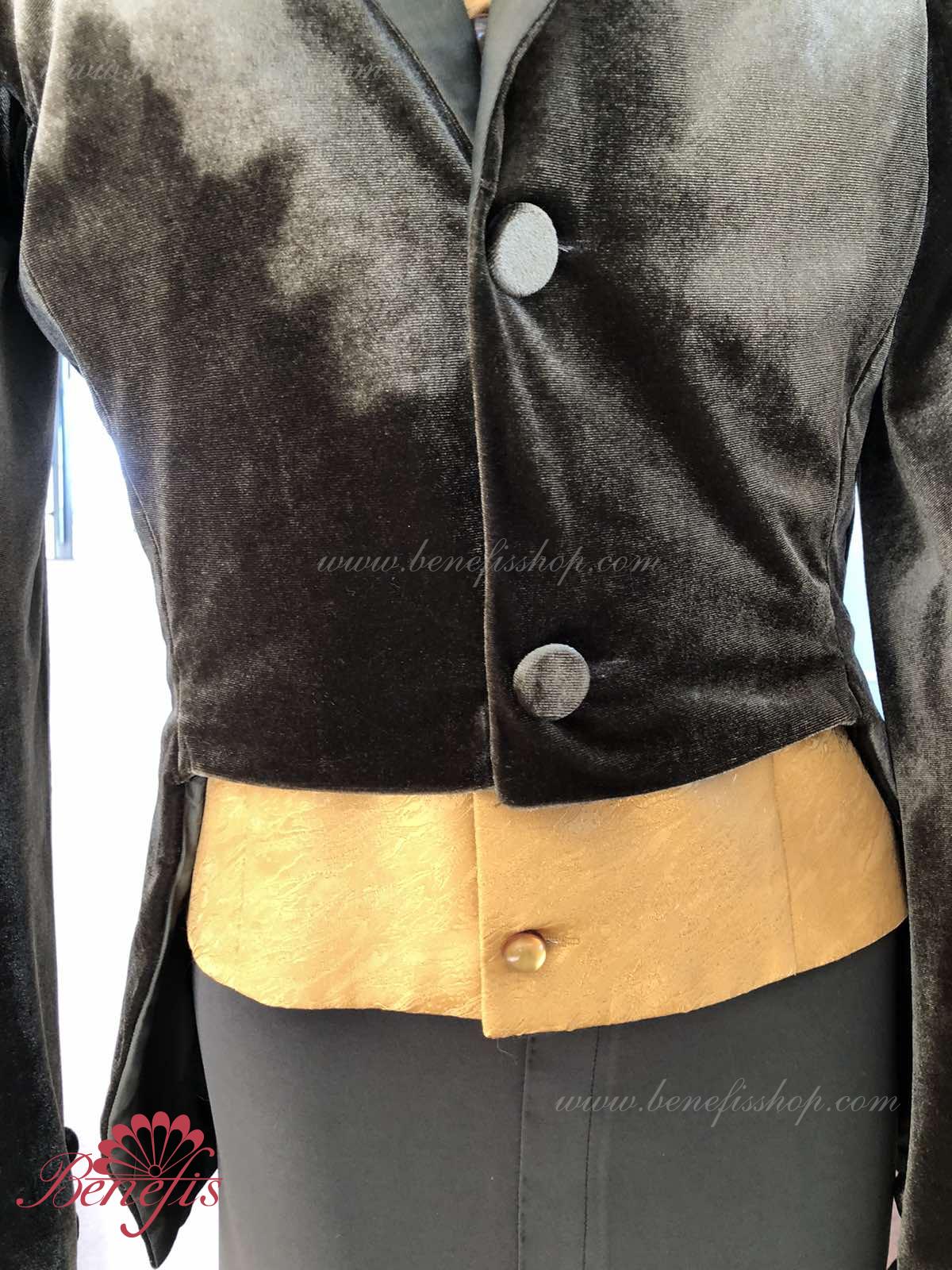 Details: Tuxedo, bow tie. This is a professional stage costume, made of semi-elastic dense fabric. Golden satin inserts are used as decoration. The costume can be made in any color.