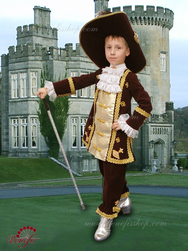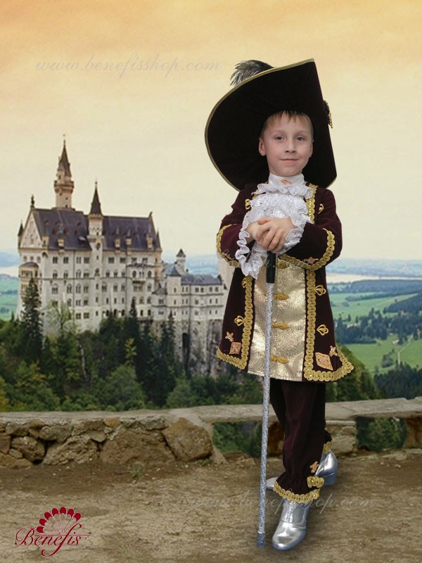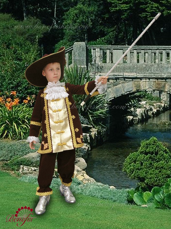 The costume is made of dense fabric in the correspondent epoch’s style. The camisole is made with sparkling inset in the front and it fastens on eyes and buttons. The camisole is embellished with braid and applications. The sleeves end up with cuffs. The shirt-front is embellished in the front with rich jabot of cuffes and fastens on the back on stickers. The breeches are on elastic, are trimmed with wide braid, and embellished with large applications on the sides.The hat is made in the costume’s style, is embellished with wide braid and applications, feather, large brooch and is trimmed with ribbon. The brooch on the hat is made on hard basis, embellished with strasses and beads.