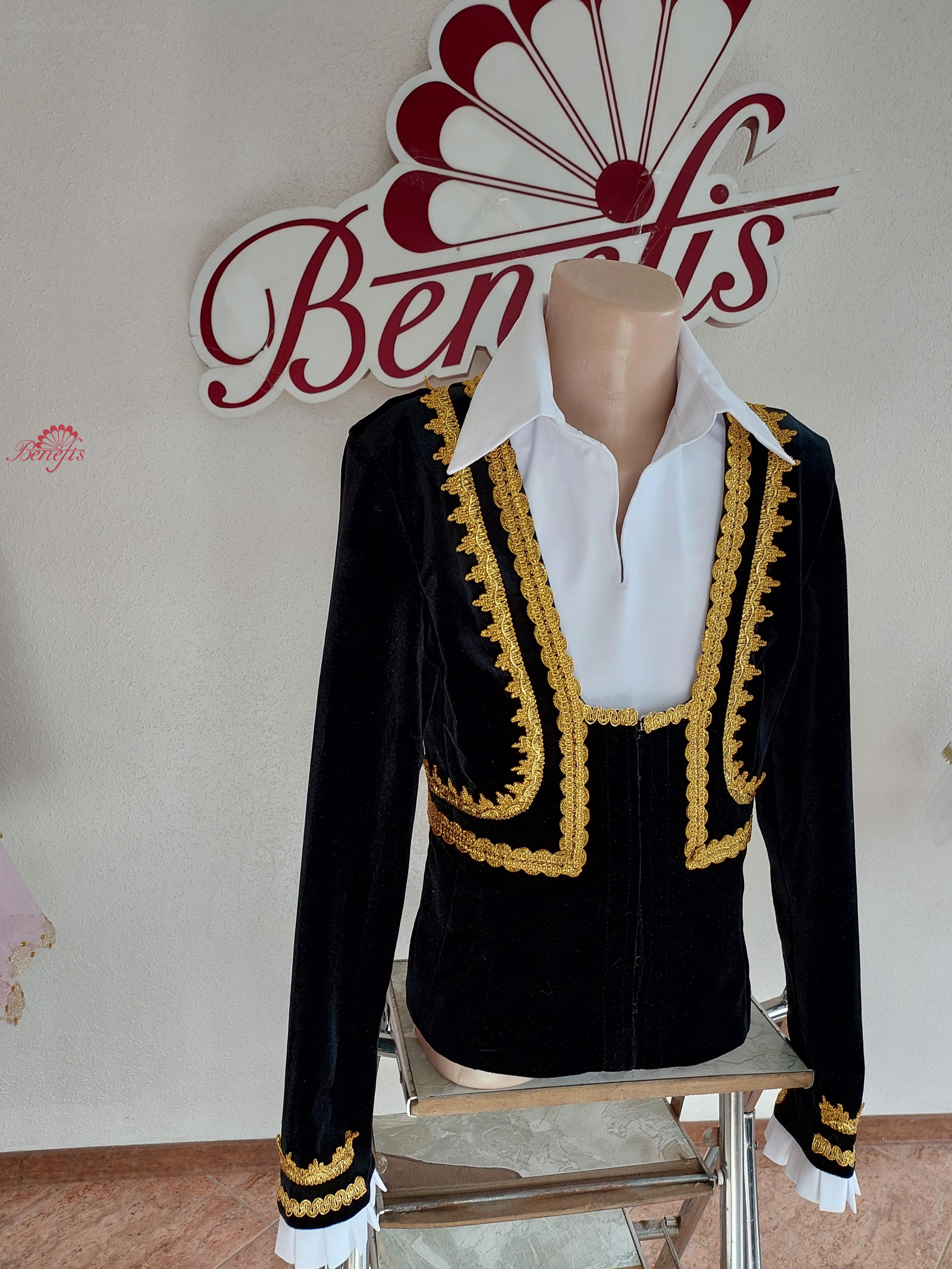Details: tunic. The professional stage costume is made of thick black elastic velvet with a lining. The jacket with a cropped silhouette is made in accordance with the traditions of the Spanish style. The simulated vest is made of elastic fabric in dark tones, it fastens in front with a row of hooks. The collar is luxuriously decorated with thick gold braid. The epaulettes are framed with gold fringe. The raincoat is made of black taffeta with lining and decorated with gold braid. A raincoat can be ordered for an additional fee. This professional stage costume is perfect for the role of "Basil" - Act 3 in the ballet "Don Quixote", and can also be used as a concert costume. The raincoat is not included in the price of the costume!