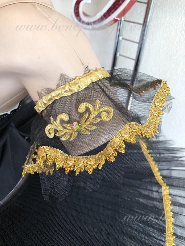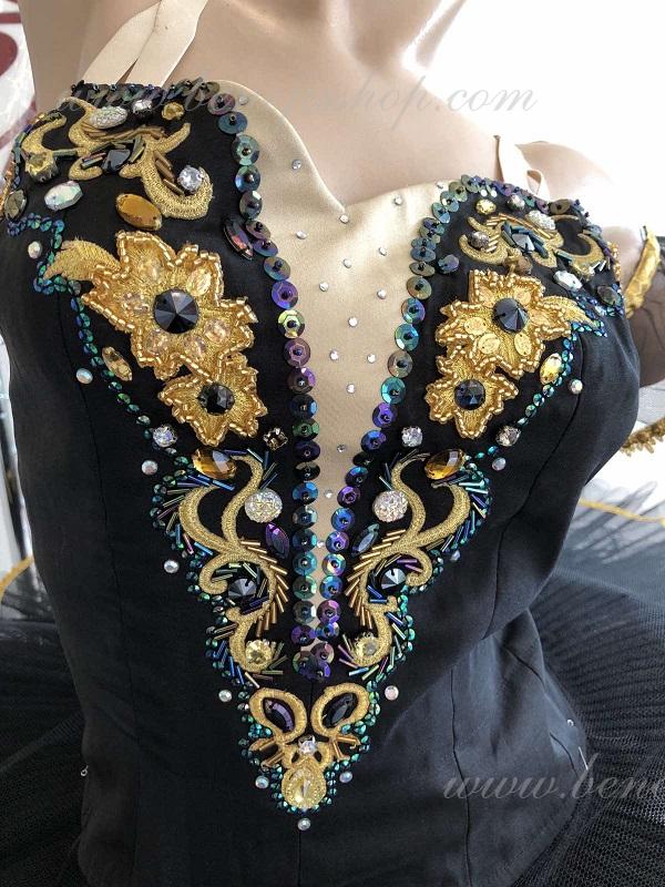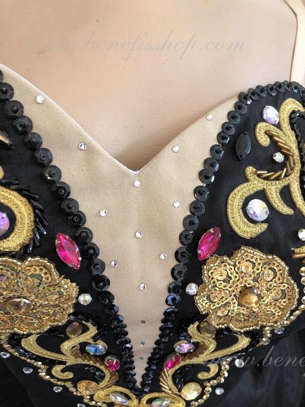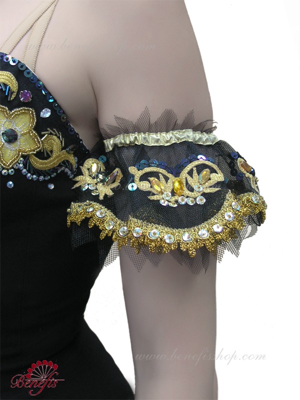 Golden appliqués,braid, bugles, beads, golden and black crystals, a lot of holographic sparkles, are used as decor elements.