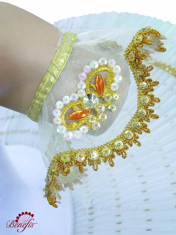 It is a professional stage costume, which consists of the following details: tutu and arm ruffles.