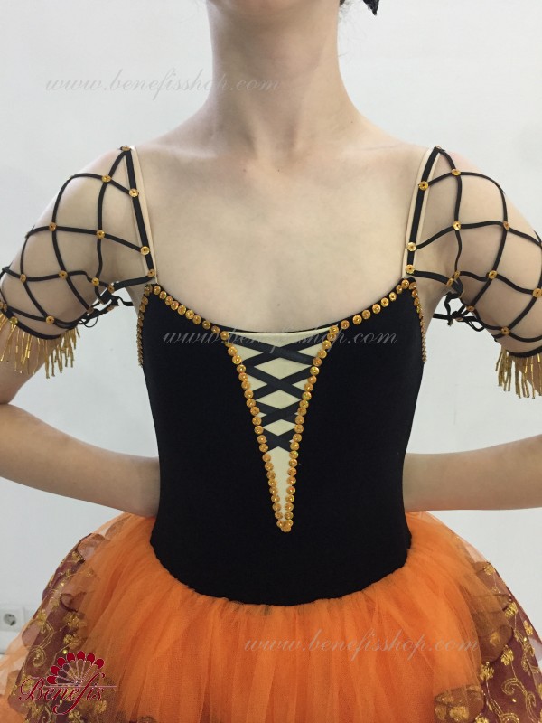 The bodice is made of elastic fabric (velvet) with a flesh-colored inset on the chest, the bodice fastens on two rows of hooks.