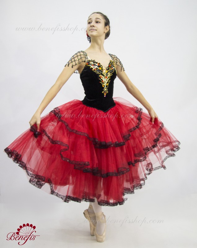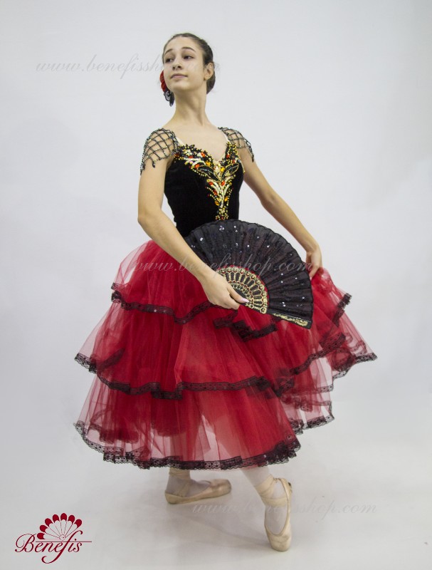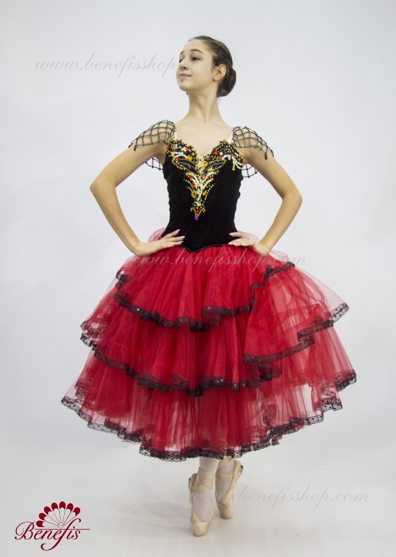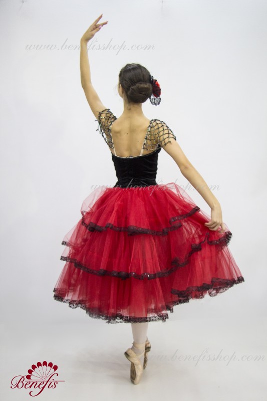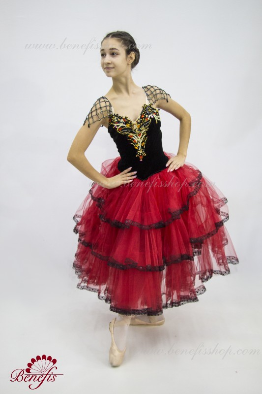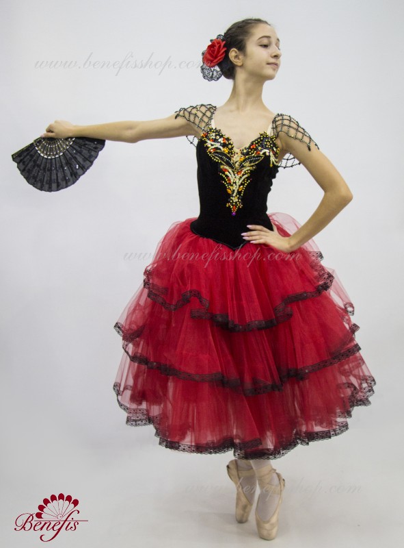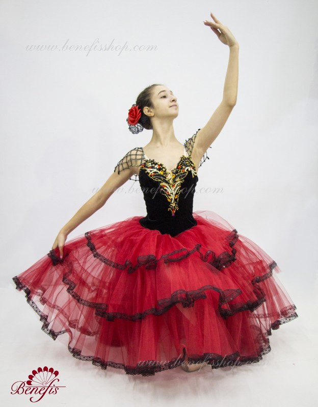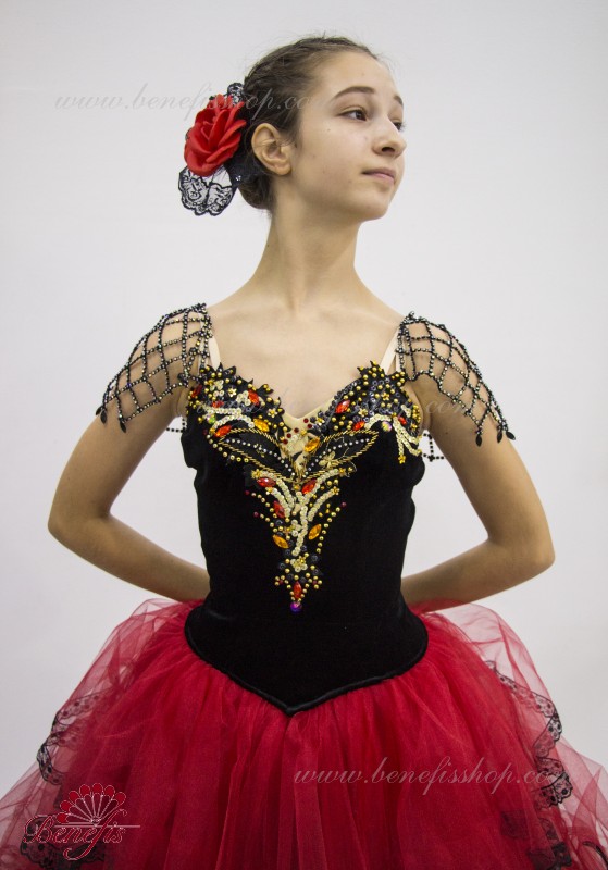 Professional stage costume is made on the basis of: bodice T0009. Skirt in Spanish style with 3 ruffles. The edges of each layer of the skirt are trimmed with braid and lace. Sleeves are made of rhinestone braid in the form of a black coarse mesh. As decorative elements on the bodice, the following are used: appliques, beads, sequins, bugles, rhinestones.