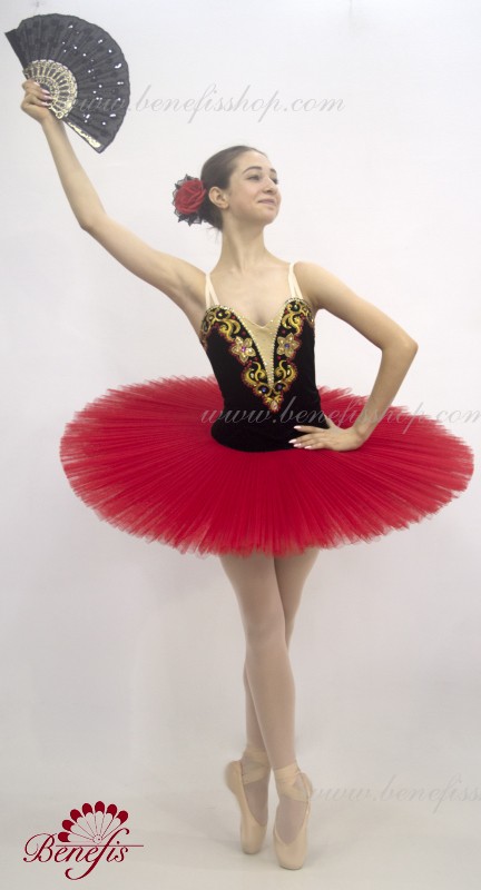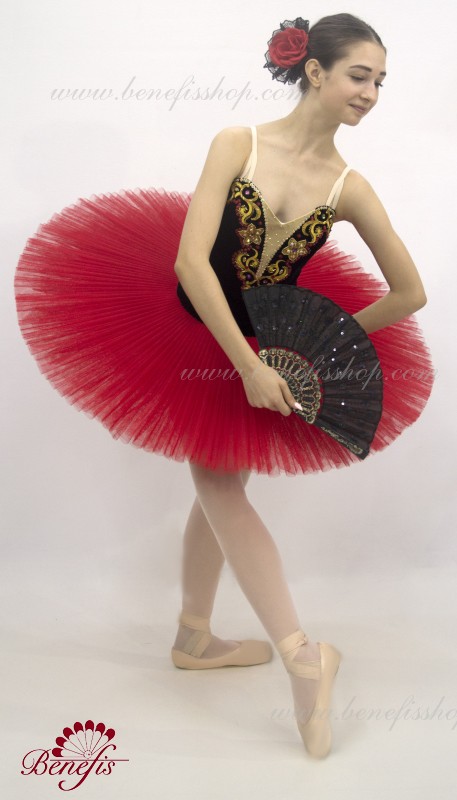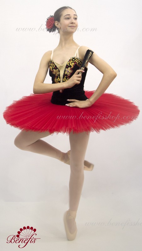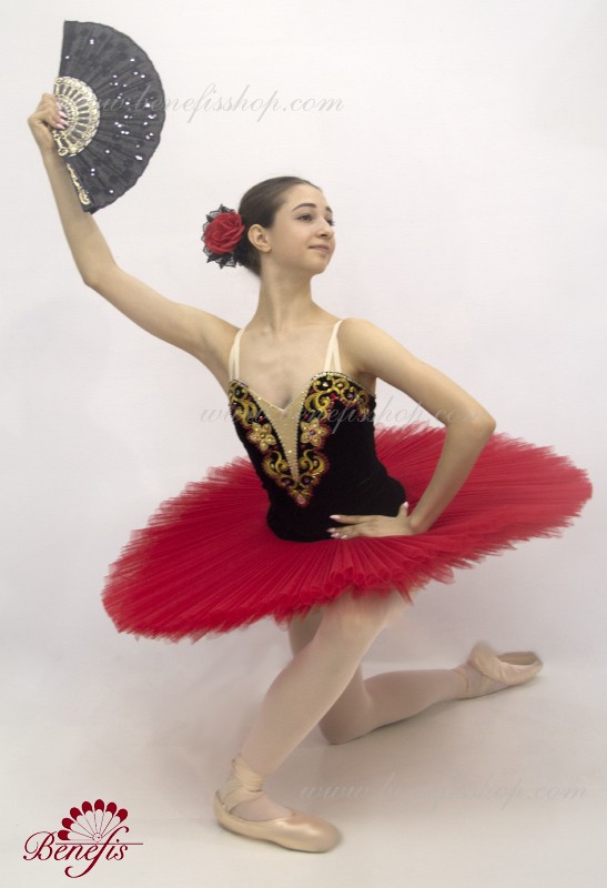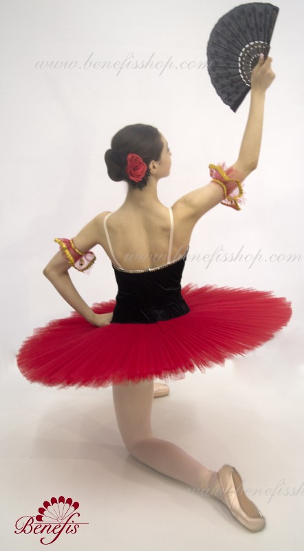 This professional ballet stage costume is made on the basis of a professional basic tutu # T 0001 (see the section "Basic and rehearsal ballet tutus"). The bodice, with elastic straps, is made of dense semi-elastic fabric. This model is made of two parts, which are attached to each other with elastic bands, in the waist area. The lower part is sewn to a tutu or skirt. The upper part is superimposed on the lower one, which allows you to adjust the length of the bodice depending on the height of the ballerina, and gives the bodice greater mobility.