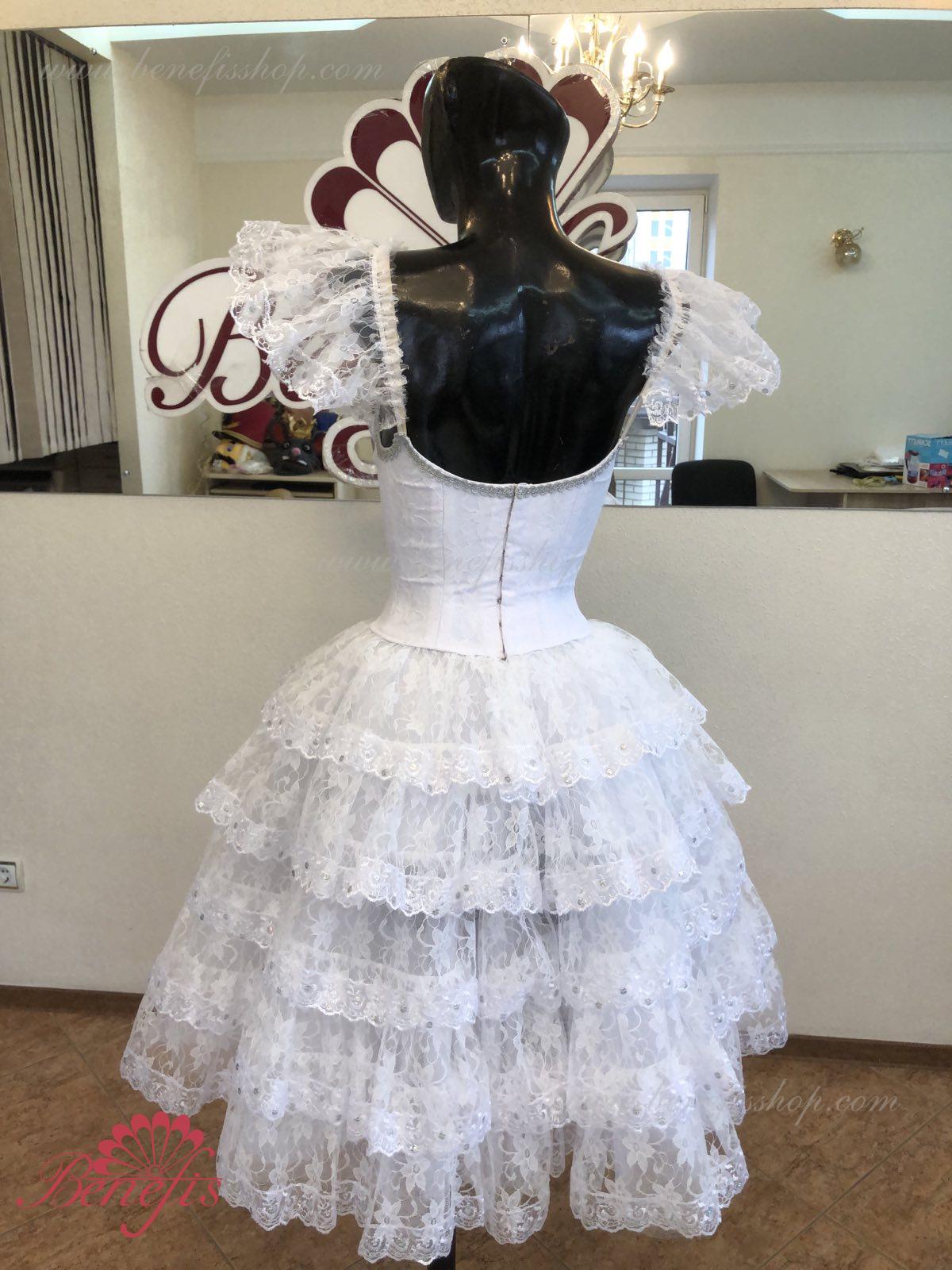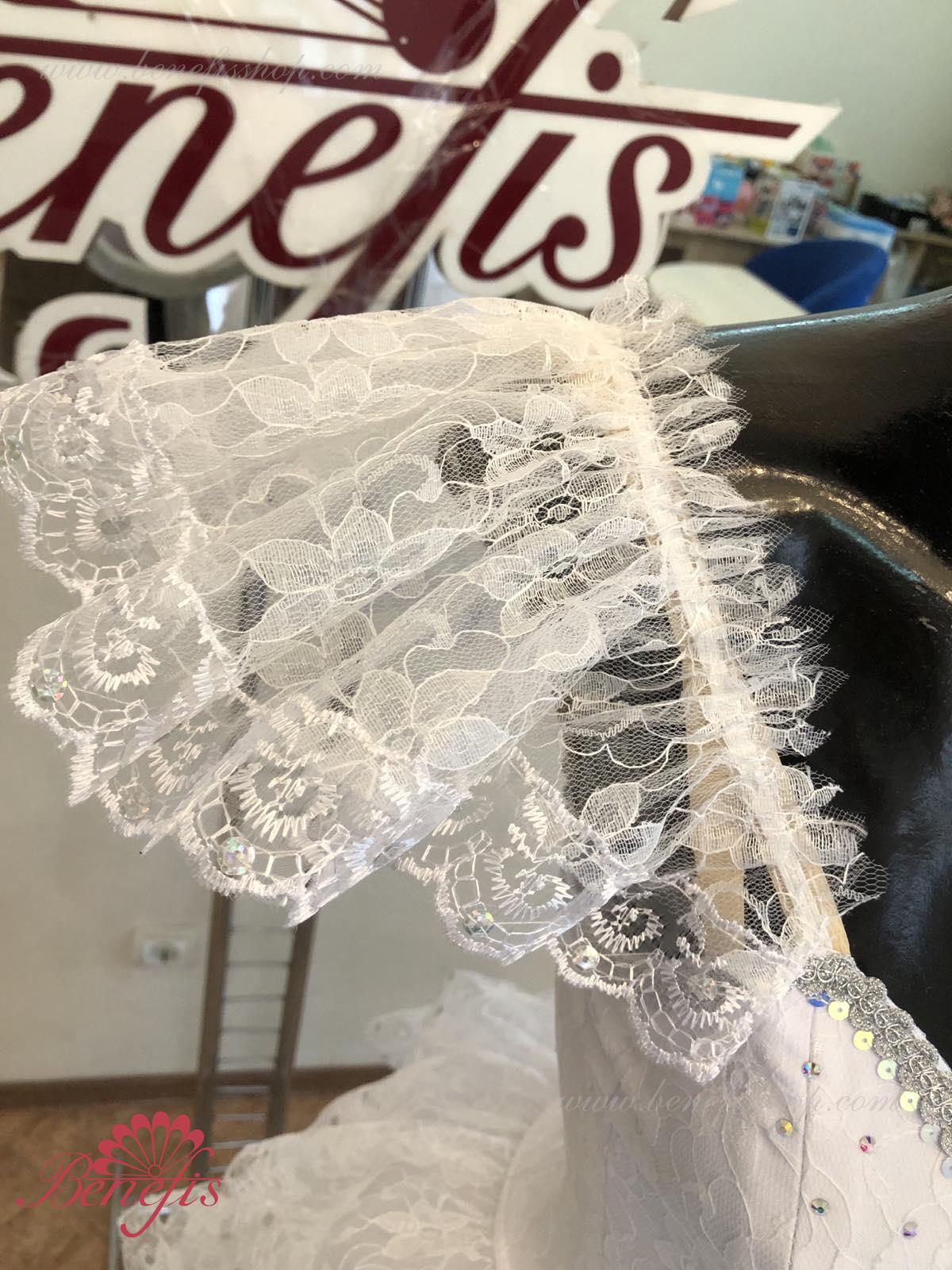 The bodice is made of semi-stretched fabric, combined with guipure. Has a V-shaped nude colored netted inset.