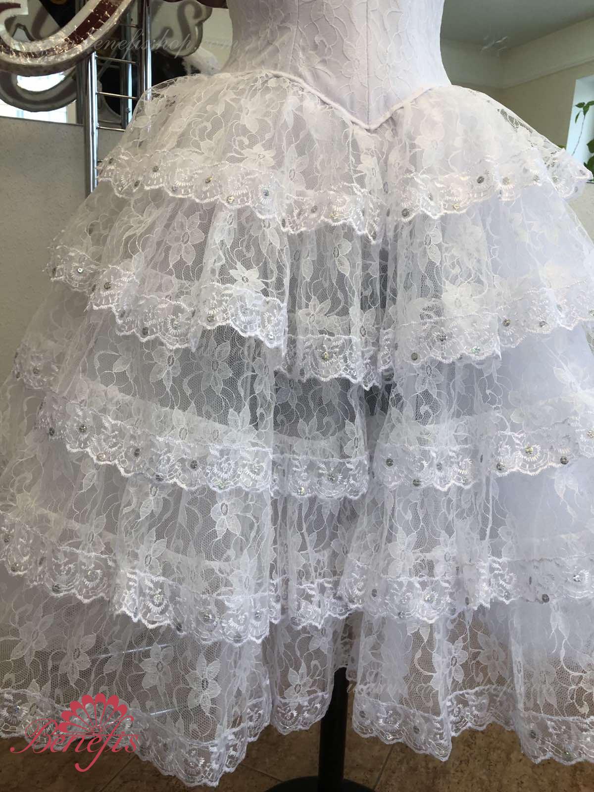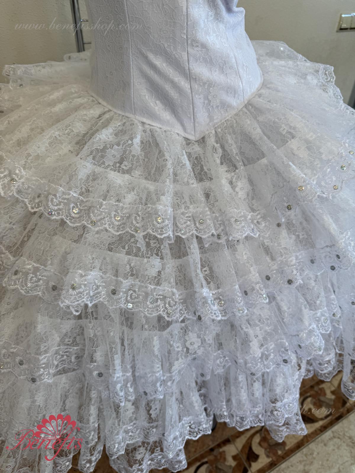 Spanish-styled skirt. The upper flounce is made of five frills decorated with laces at the edges.