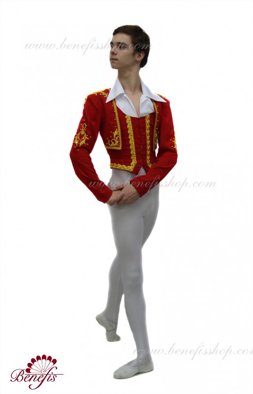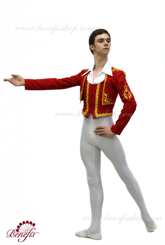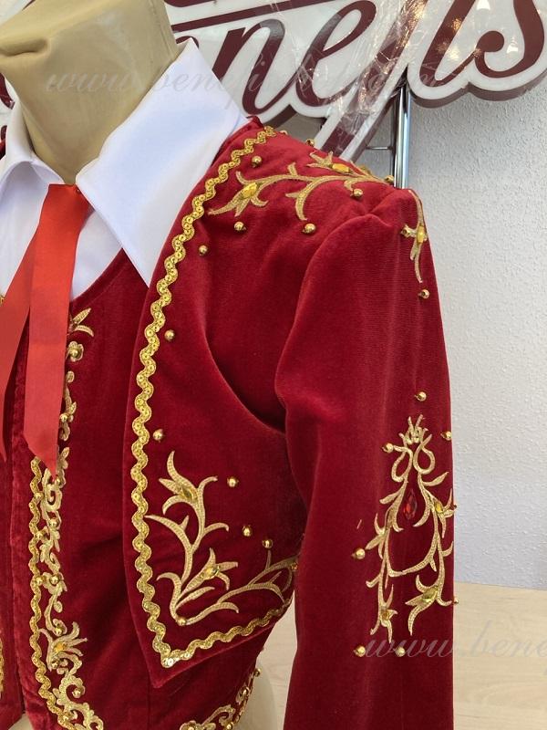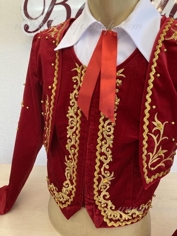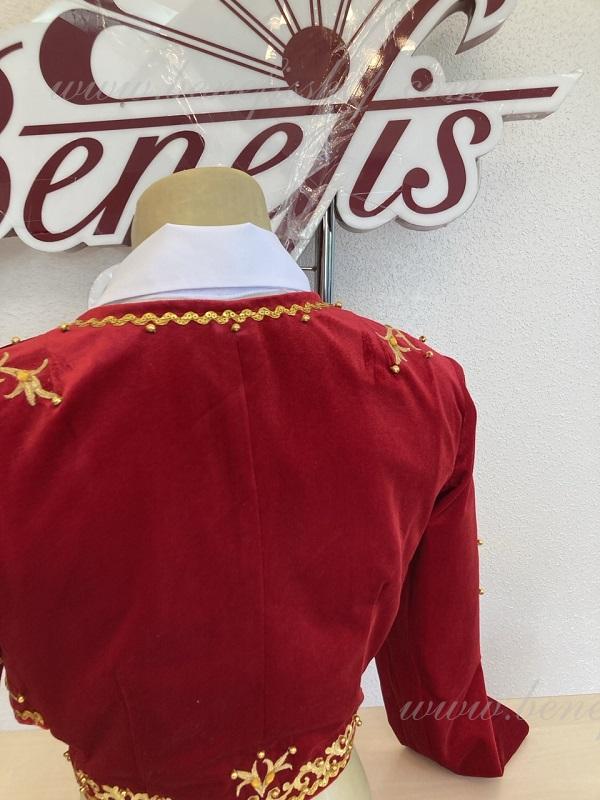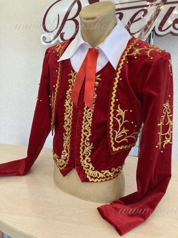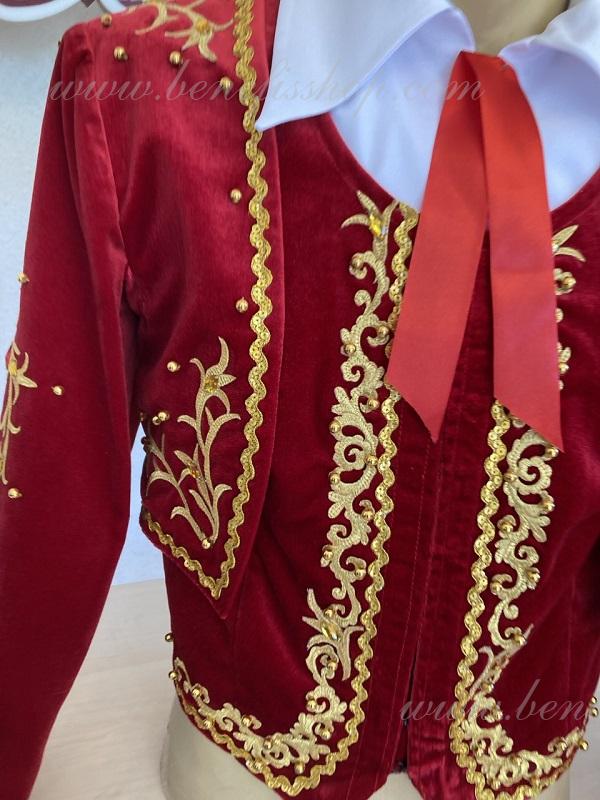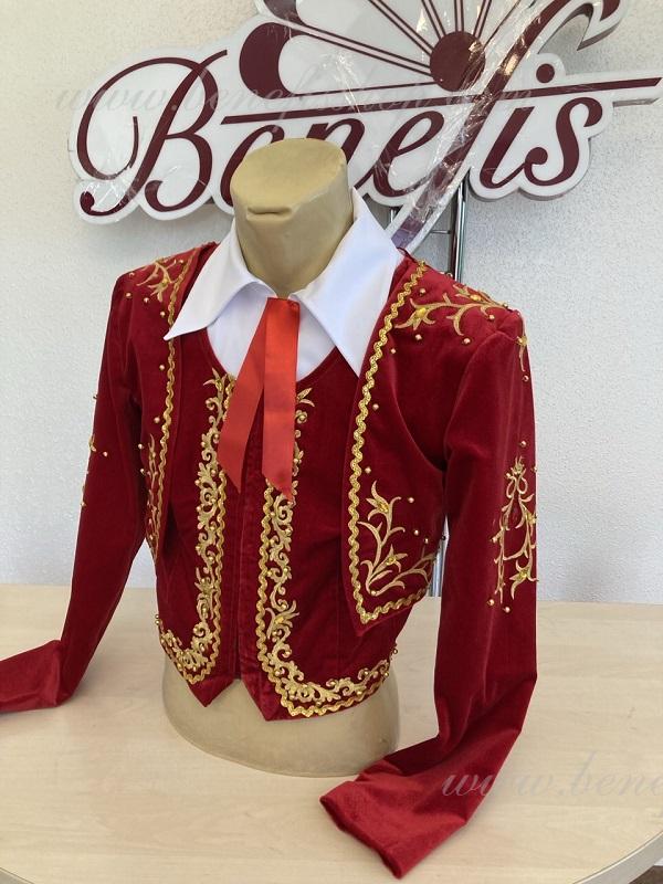The jacket of the shortened silhouette is made of semi-elastic fabric. Issued vest with a zipper in front on one row of hooks. As a decoration, two types of braid, appliques, beads, rhinestones are used.