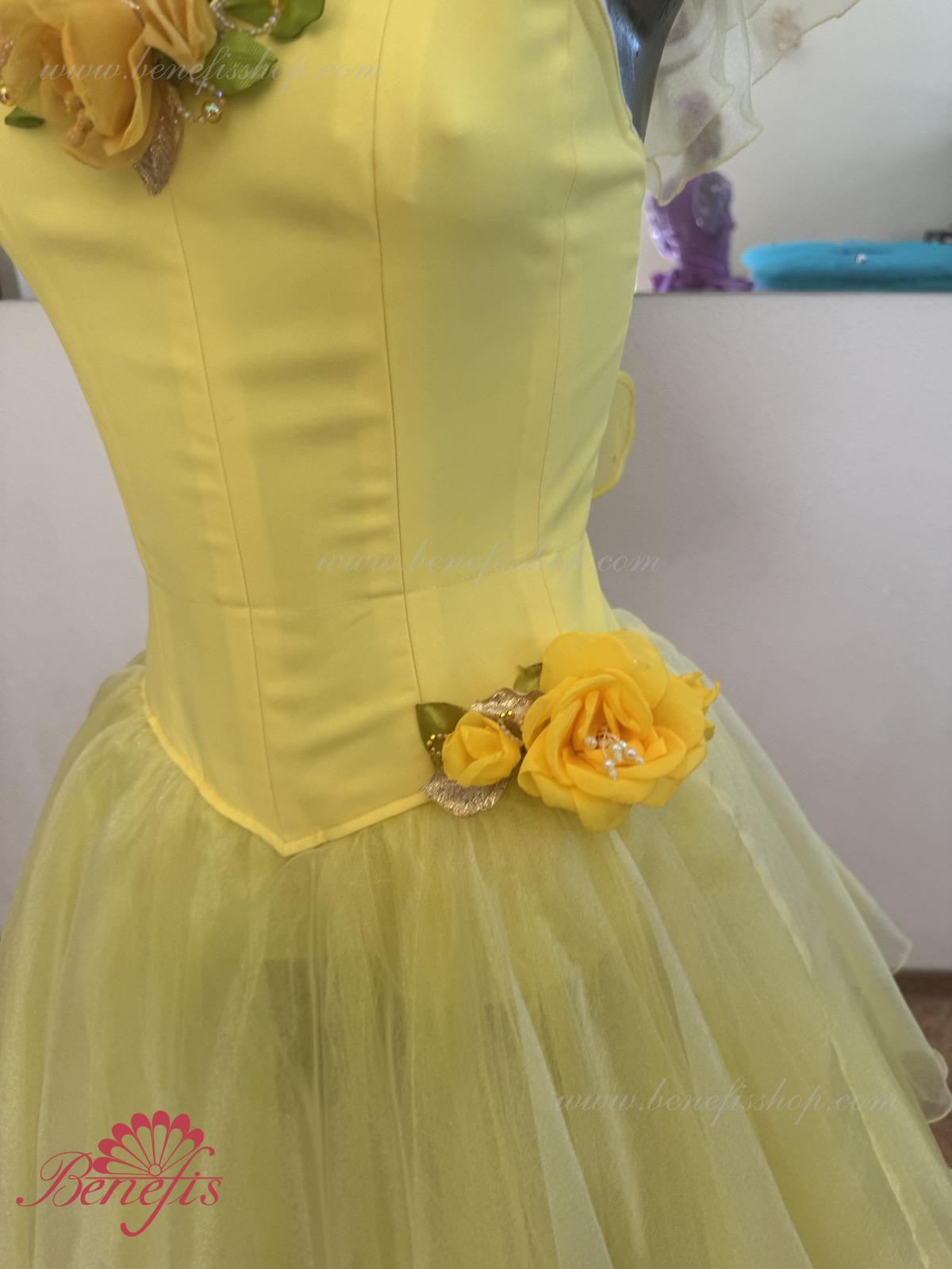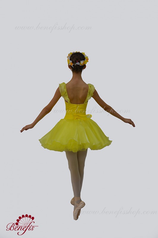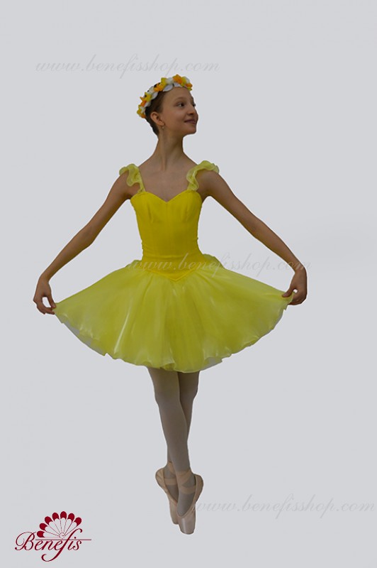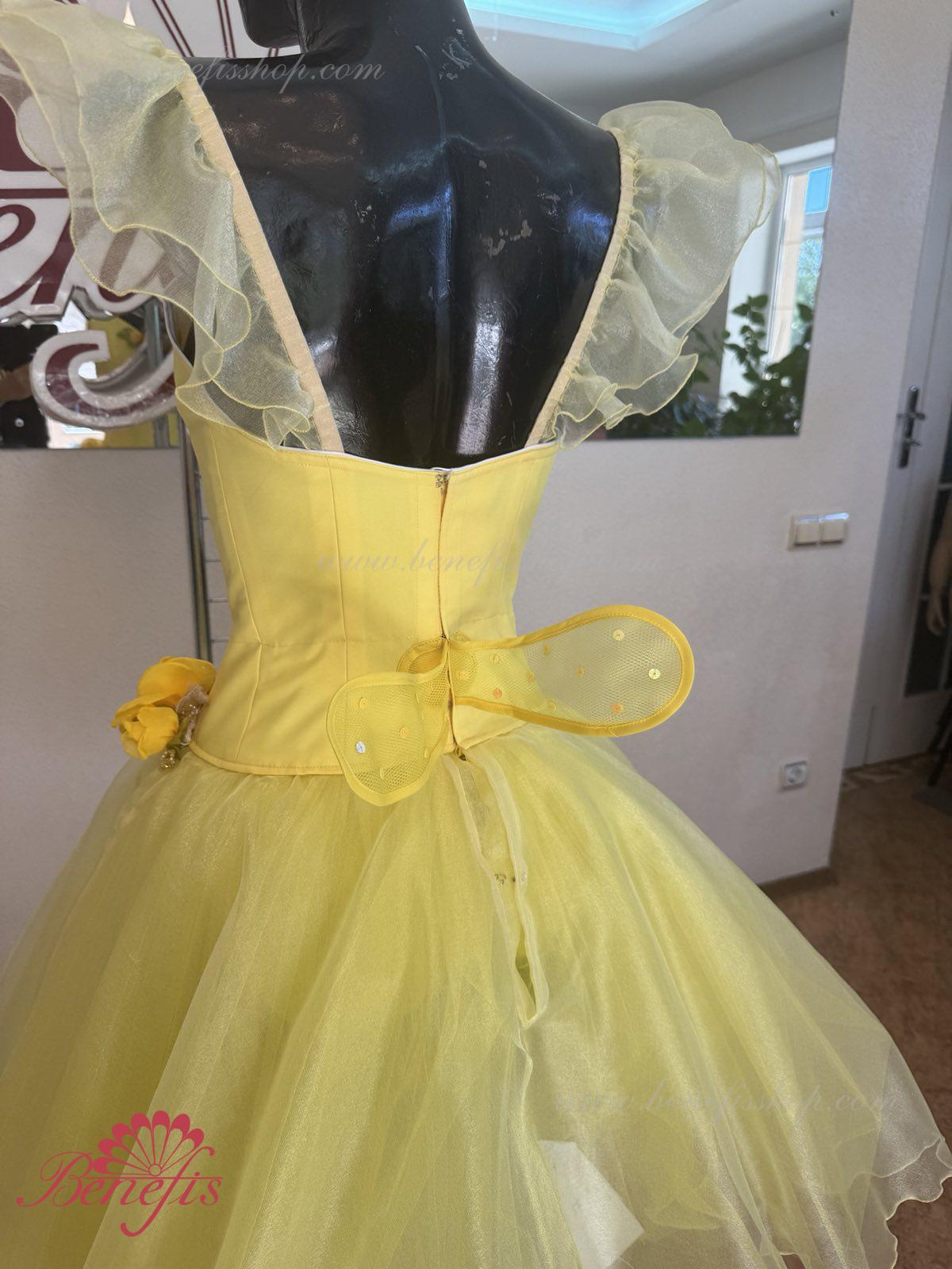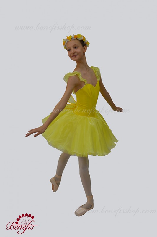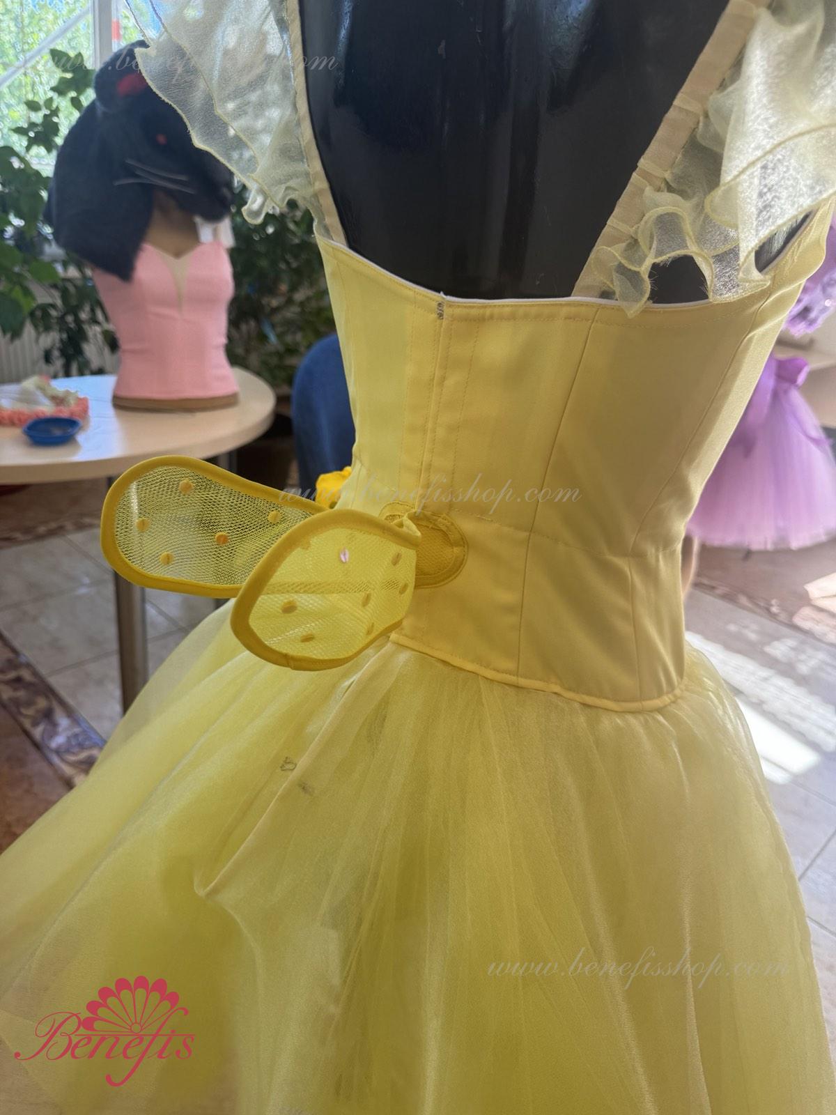 The short skirt of tulle is covered with the one layer of thin chiffon. The bodice is made of semi elastic fabric at the edge has a V-like form. The costume also comes with sequined wings, which are worn separately.