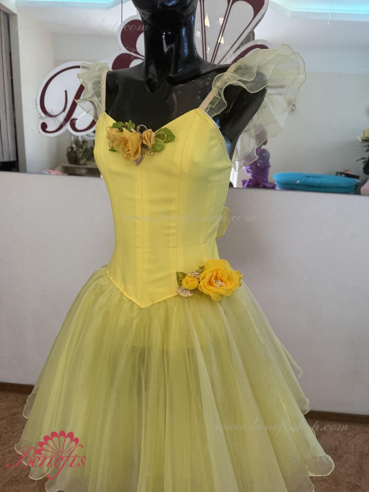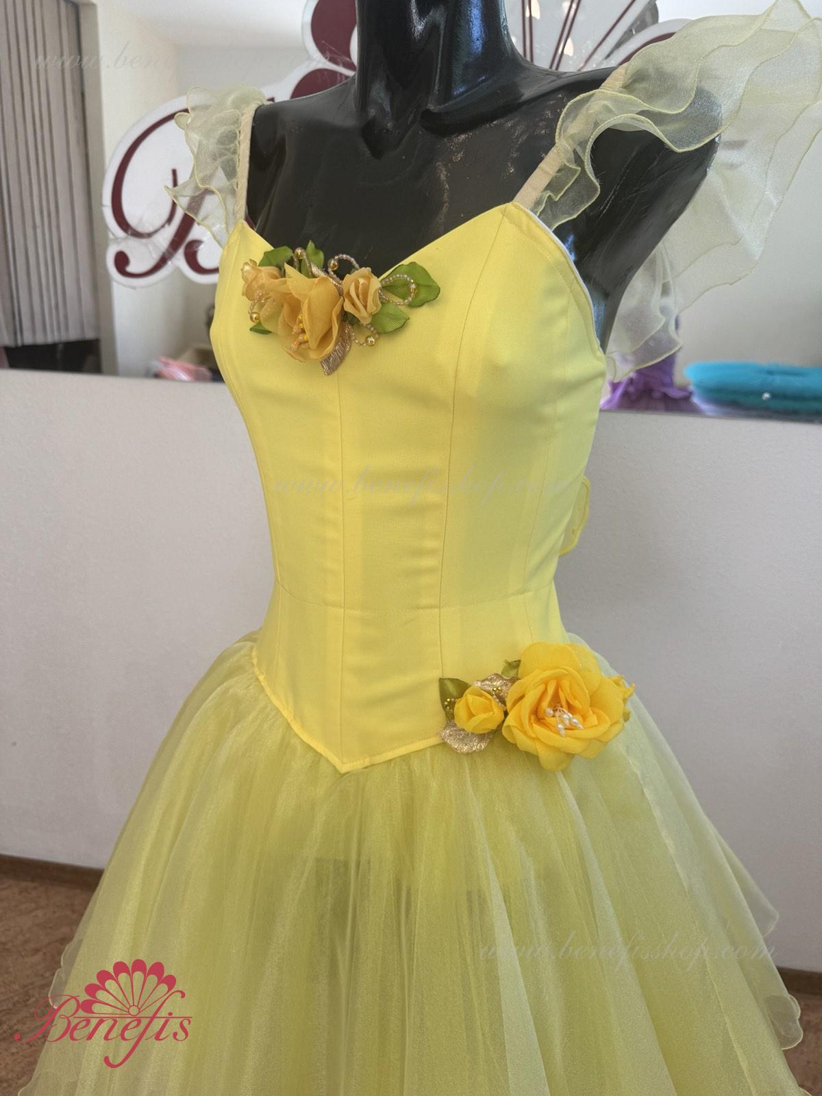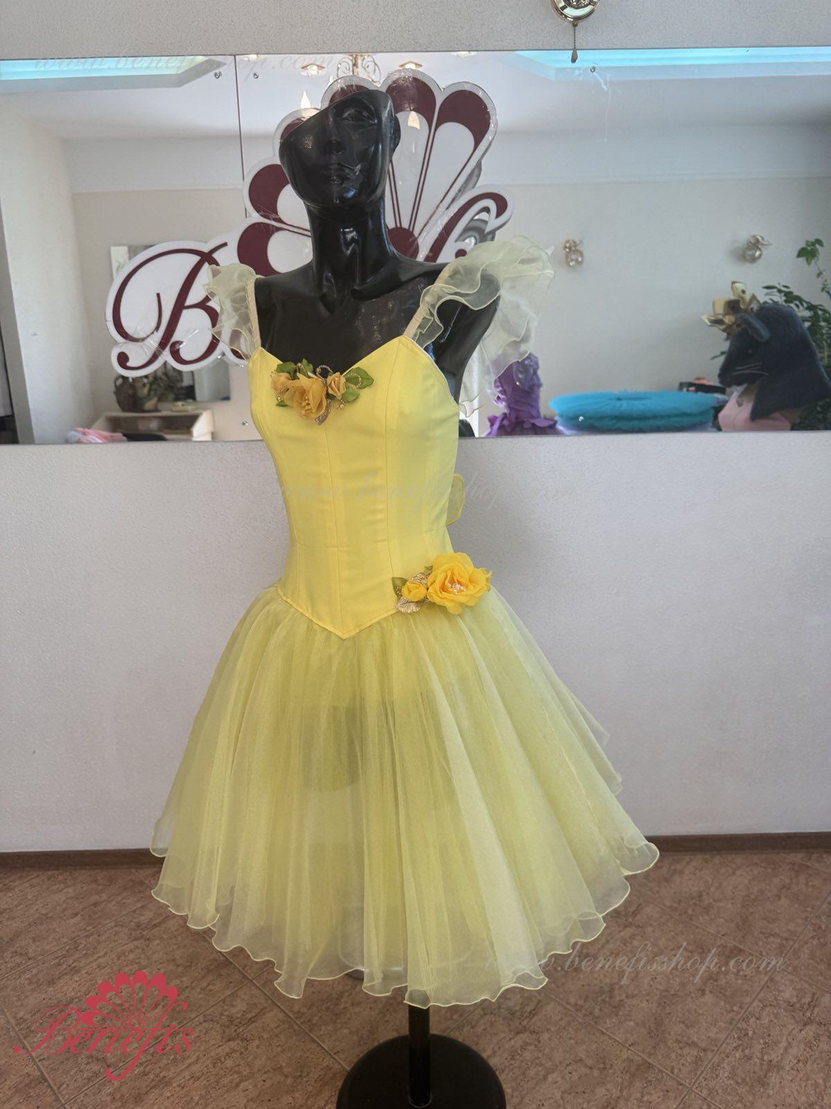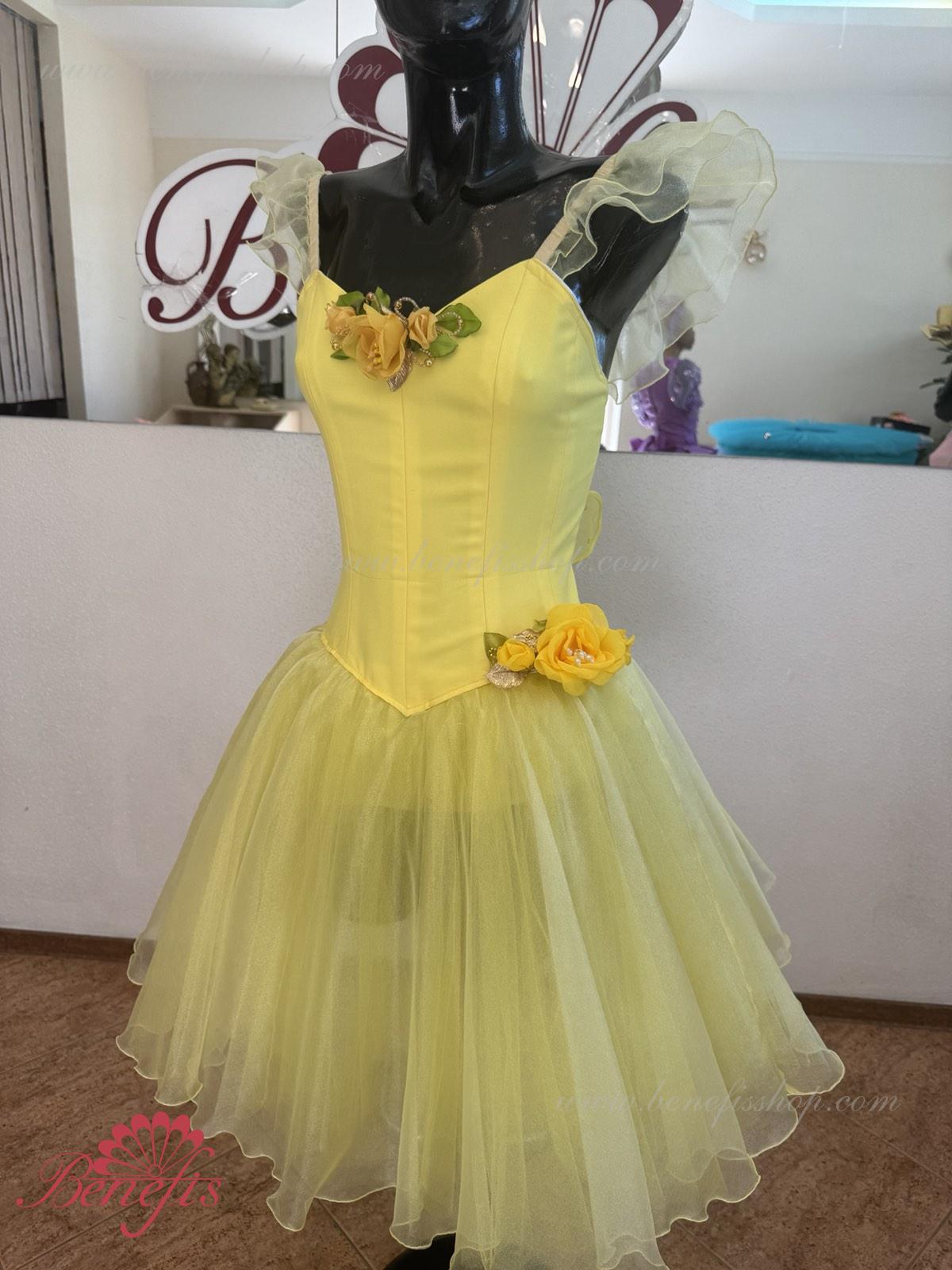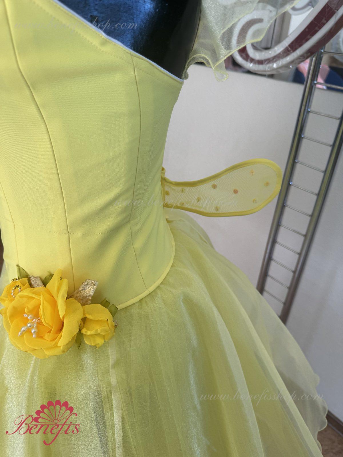 The short skirt of tulle is covered with the one layer of thin chiffon. The bodice is made of semi elastic fabric at the edge has a V-like form. The costume also comes with sequined wings, which are worn separately.