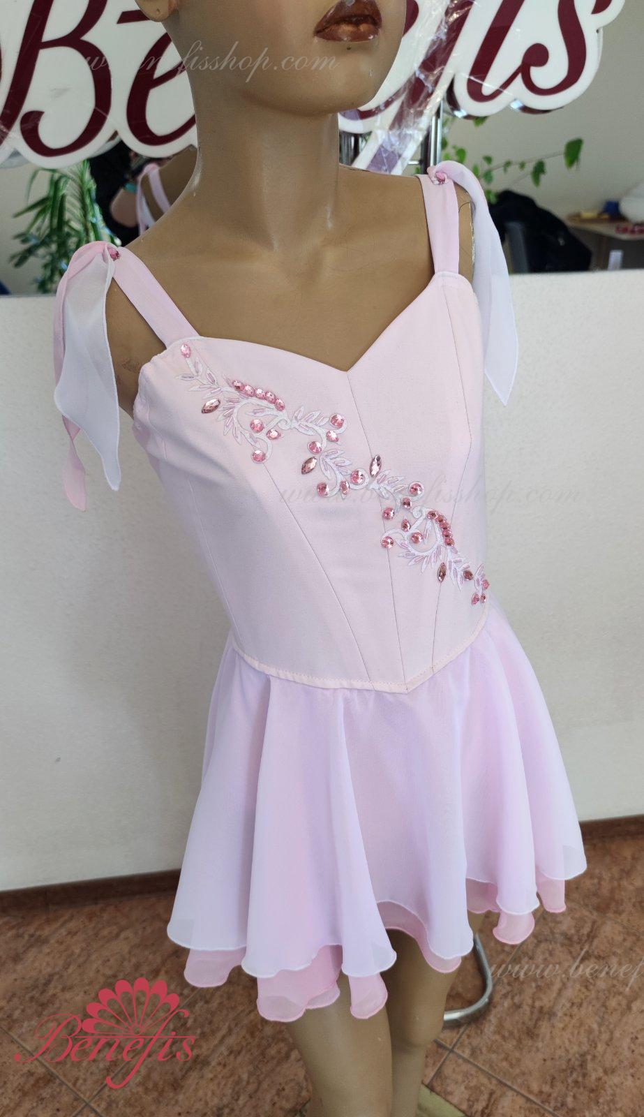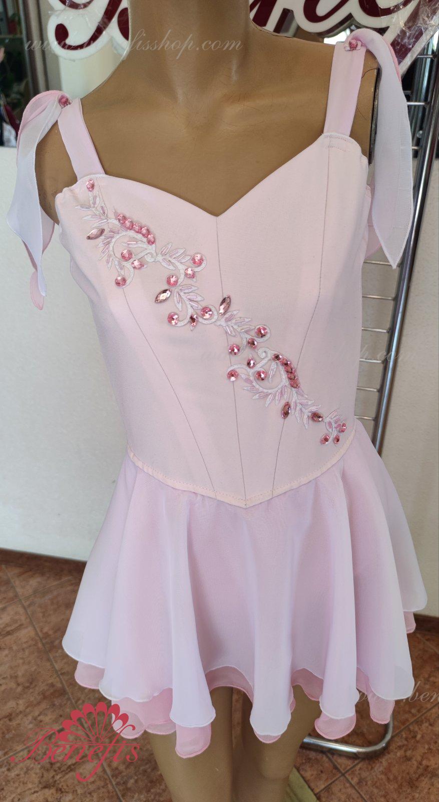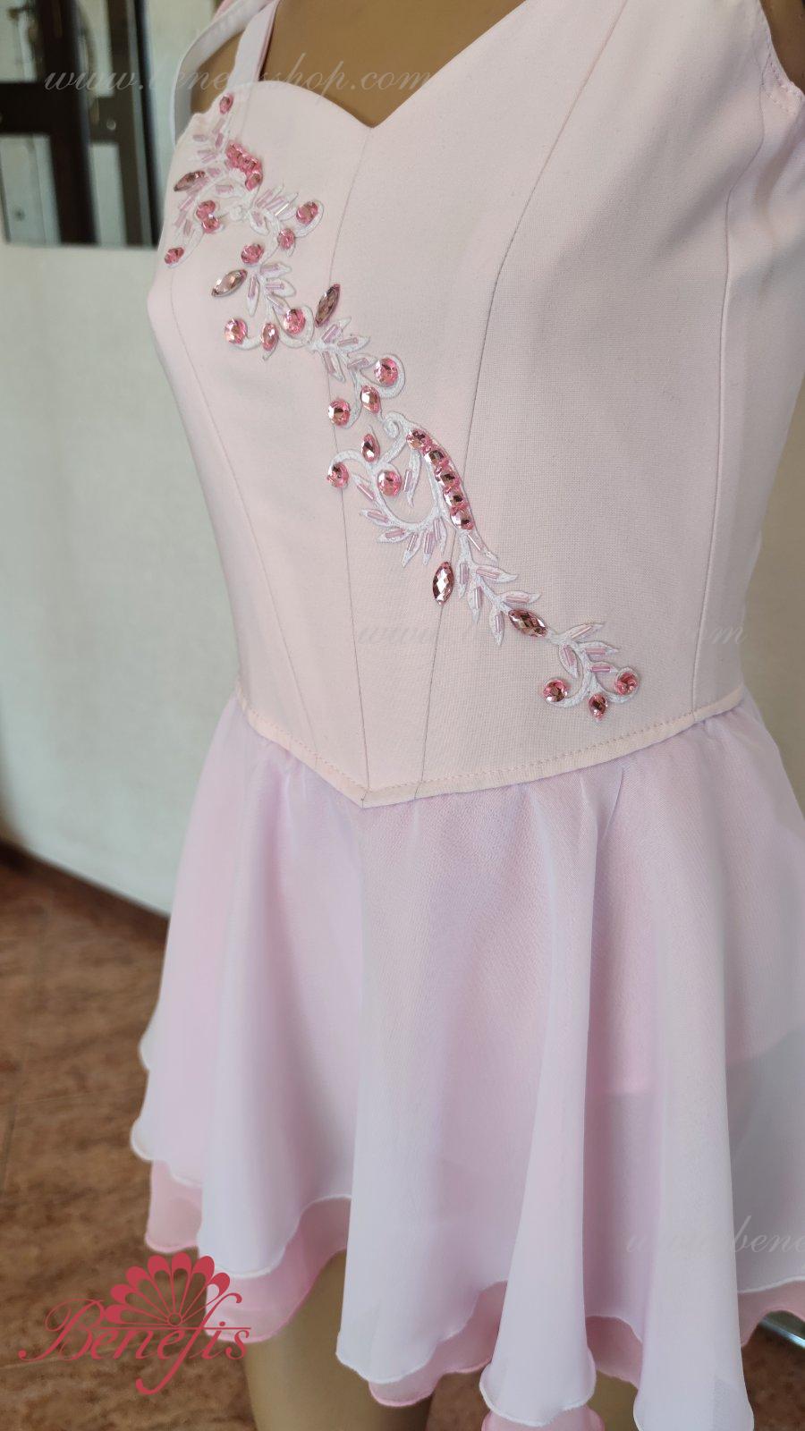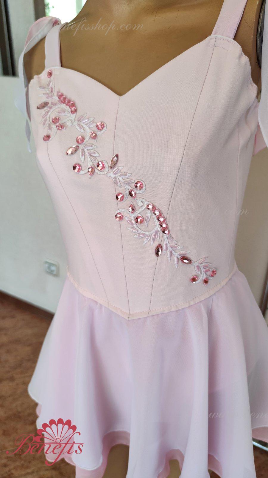 Details: dress. The bodice, with elastic straps and a body insert on the chest, is made of dense semi-elastic fabric, without a cape, biflex panties. The bodice fastens with hooks in two rows for convenient adjustment, the inner cord serves to tighten the bodice in the chest area. The skirt is made of 2 layers of chiffon. The sleeves are made of chiffon. Decor: appliques, rhinestones and glass beads.