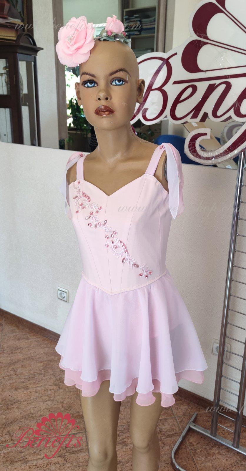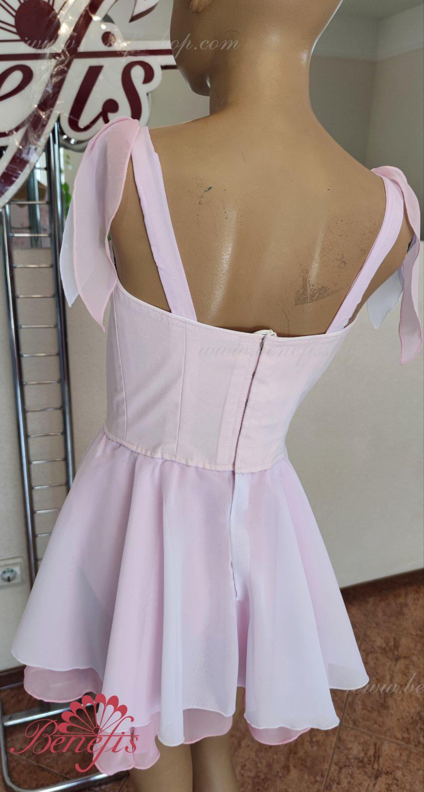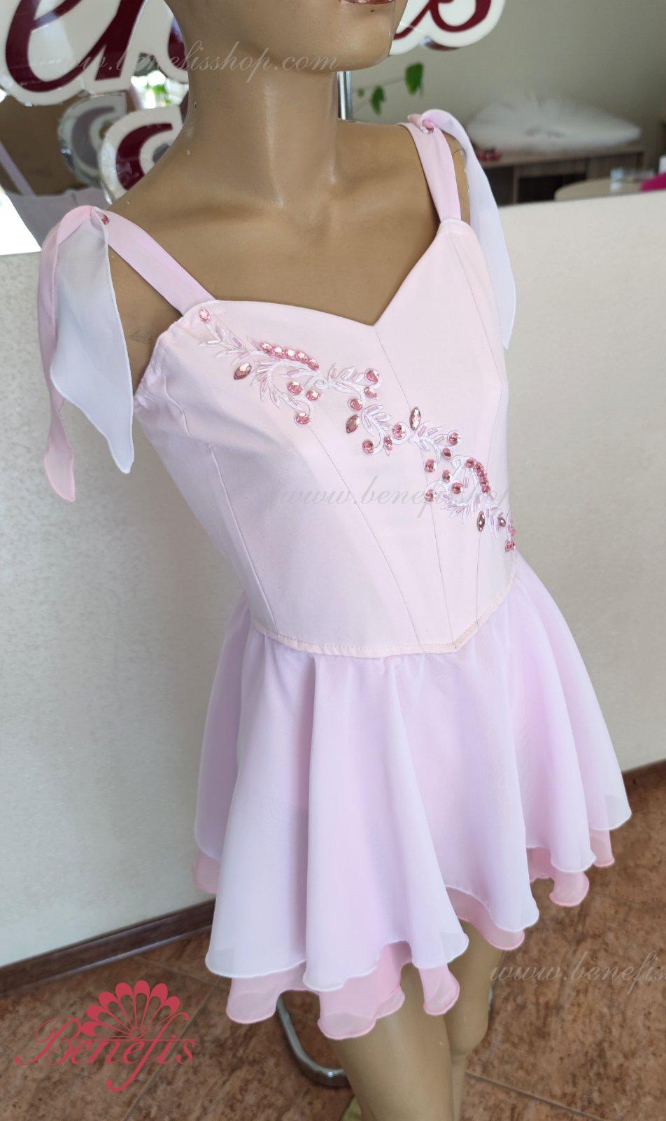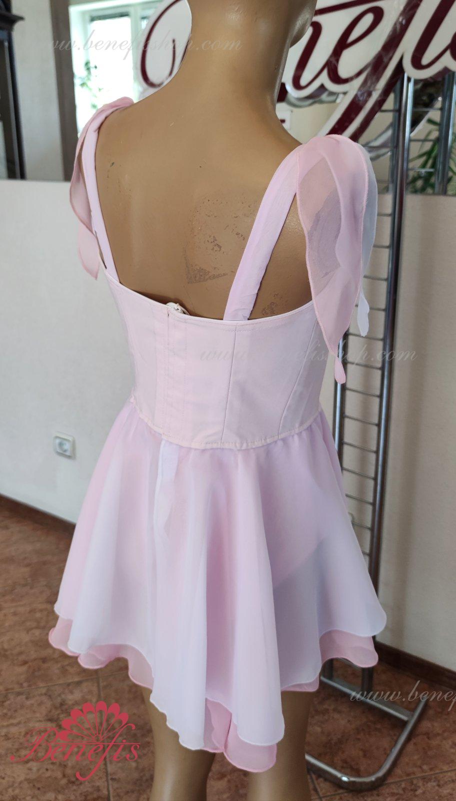 Details: dress. The bodice, with elastic straps and a body insert on the chest, is made of dense semi-elastic fabric, without a cape, biflex panties. The bodice fastens with hooks in two rows for convenient adjustment, the inner cord serves to tighten the bodice in the chest area. The skirt is made of 2 layers of chiffon. The sleeves are made of chiffon. Decor: appliques, rhinestones and glass beads.