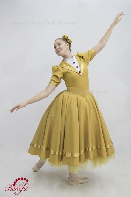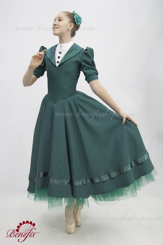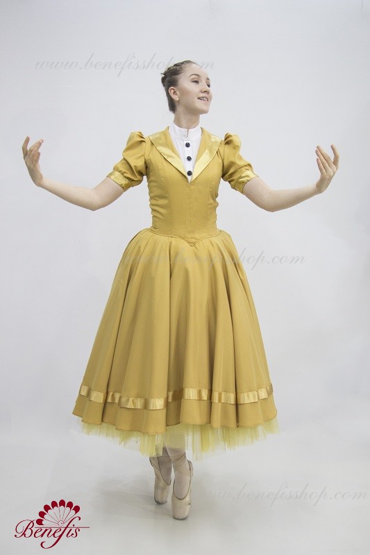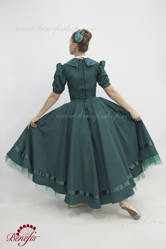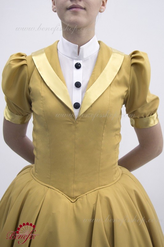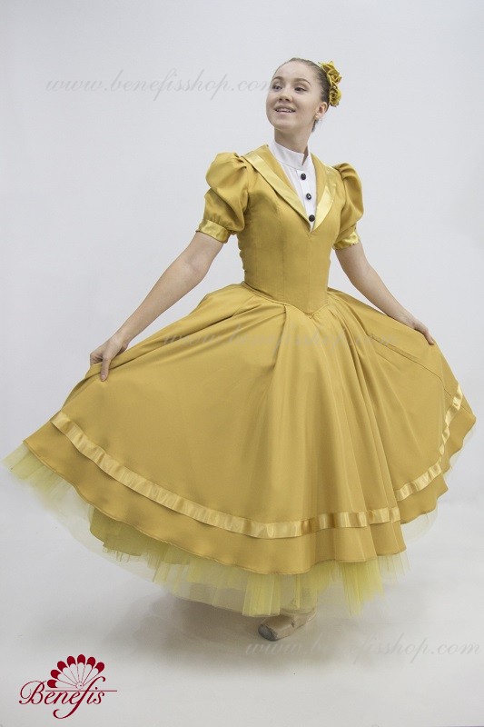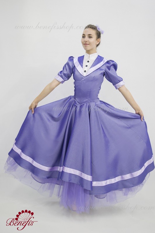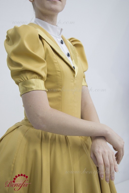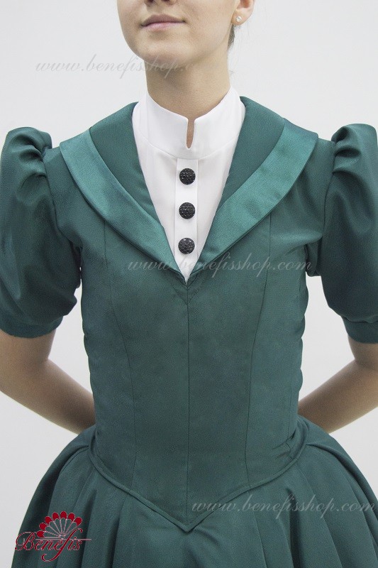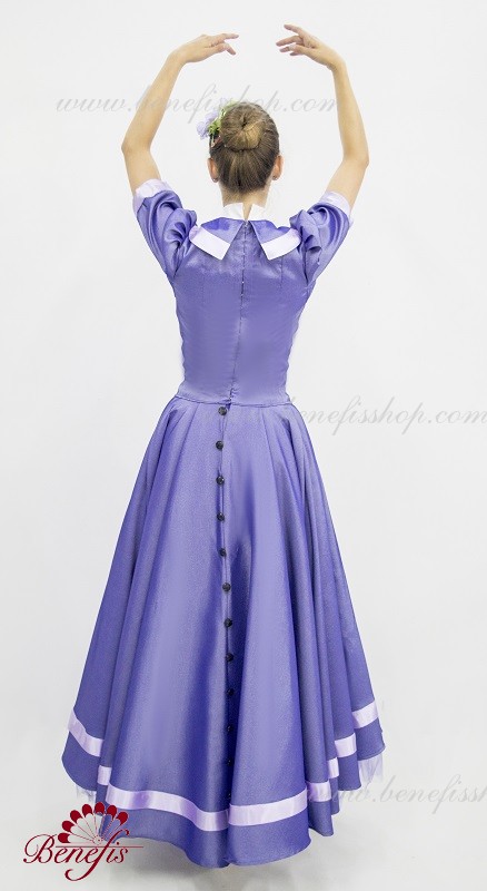 Details - satin dress. This is a stage, ballet costume. The bodice is with shoulder seams and a sleeve with a flashlight. The top of the bodice has a collar and a bib, the bodice is fastened at the back with two rows of hooks and loops. The length of the skirt has asymmetry; the lower layers of tulle give volume to the skirt. Wide-type satin ribbon and buttons are used as decoration. The product can be made in any color at the customer's choice.