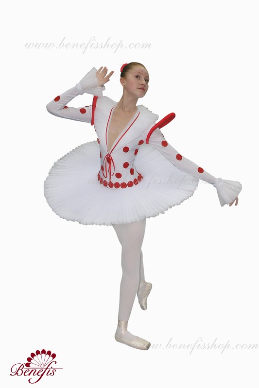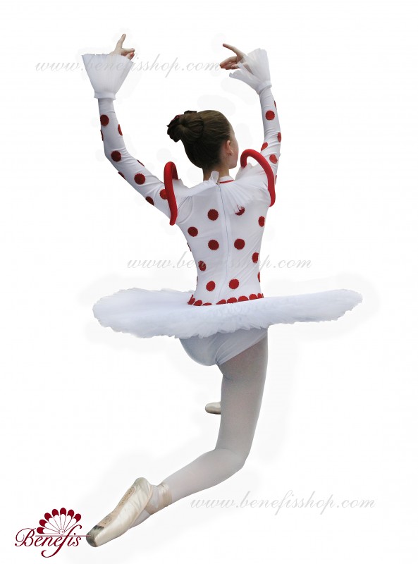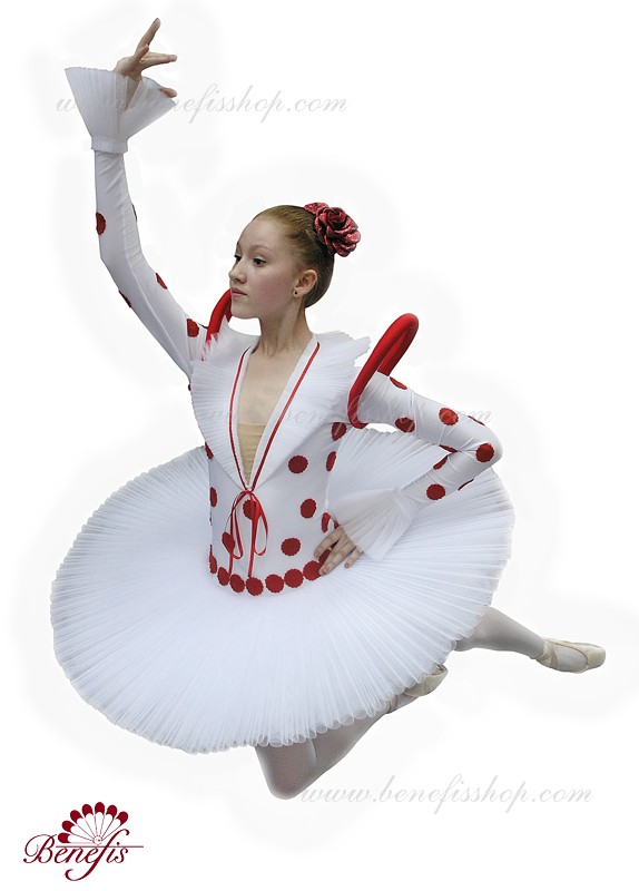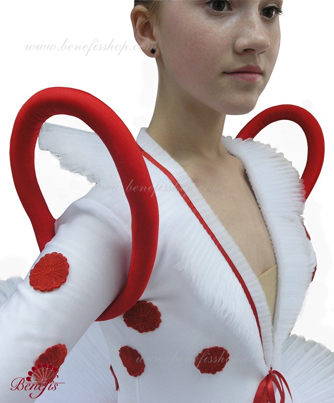 Costume consists of the following details:pack on a bathing suit made of supplex with long sleeves, embroidered with red lace flowers, as a pea. In the lines connecting hoses with swimsuit parolonnovye tube covered with red supplex. Tutu, cuffs, collar of tulle.