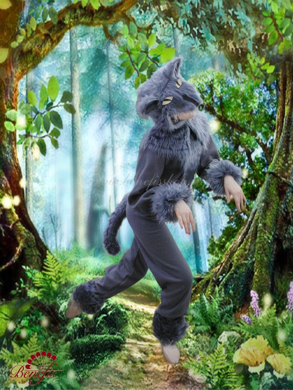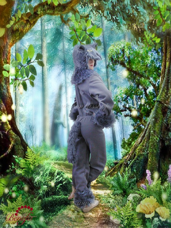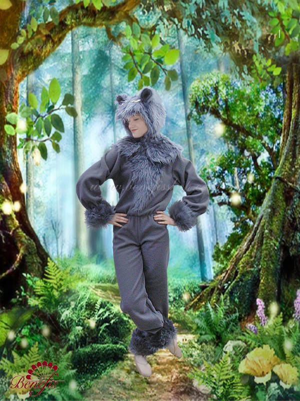This costume is made of fleece. Chest and sleeves are decorated with fur inset. The costume fastens on the buttons. At the pants back is attached tail. The headdress is made in the form of hat and is decorated with the ears, eyes and nose.