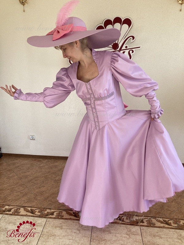 Details: dress, hat. Taffeta dress, contrasting tulle skirt on biflex underpants P2606, wide-brimmed hat is also covered with taffeta. Skirt P2207.Satin bow.