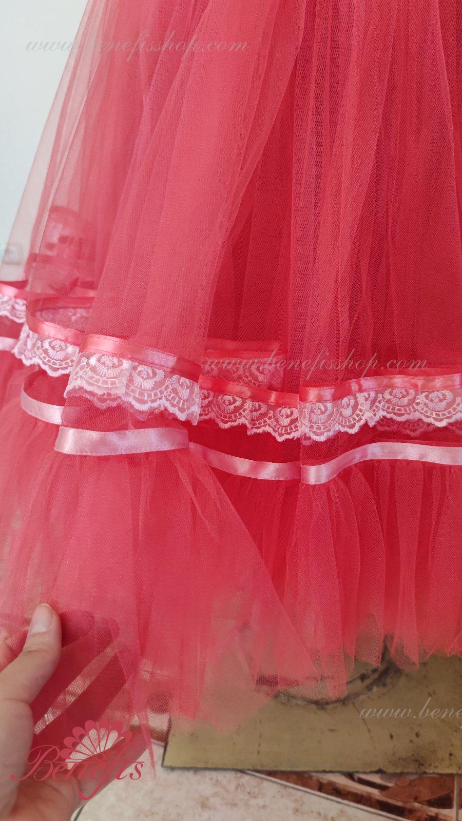 Wide skirt consists of 4 layers and 56 gussets. The length of the skirt is below the knee level.