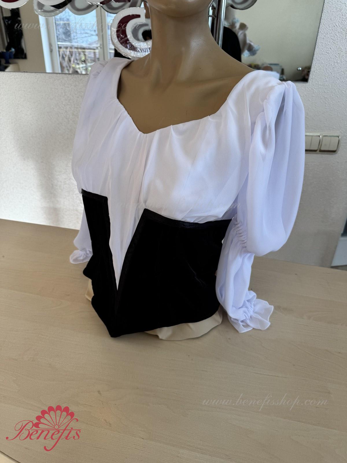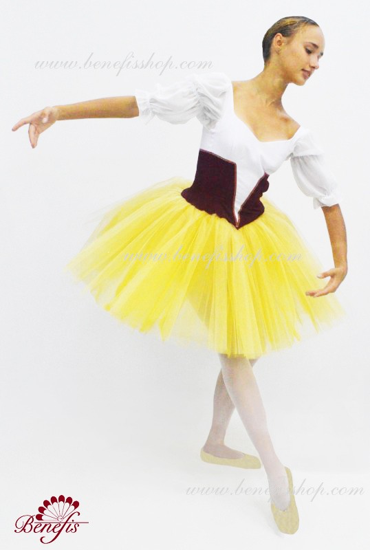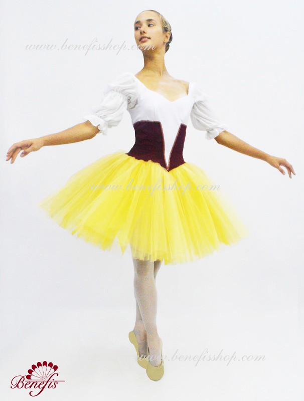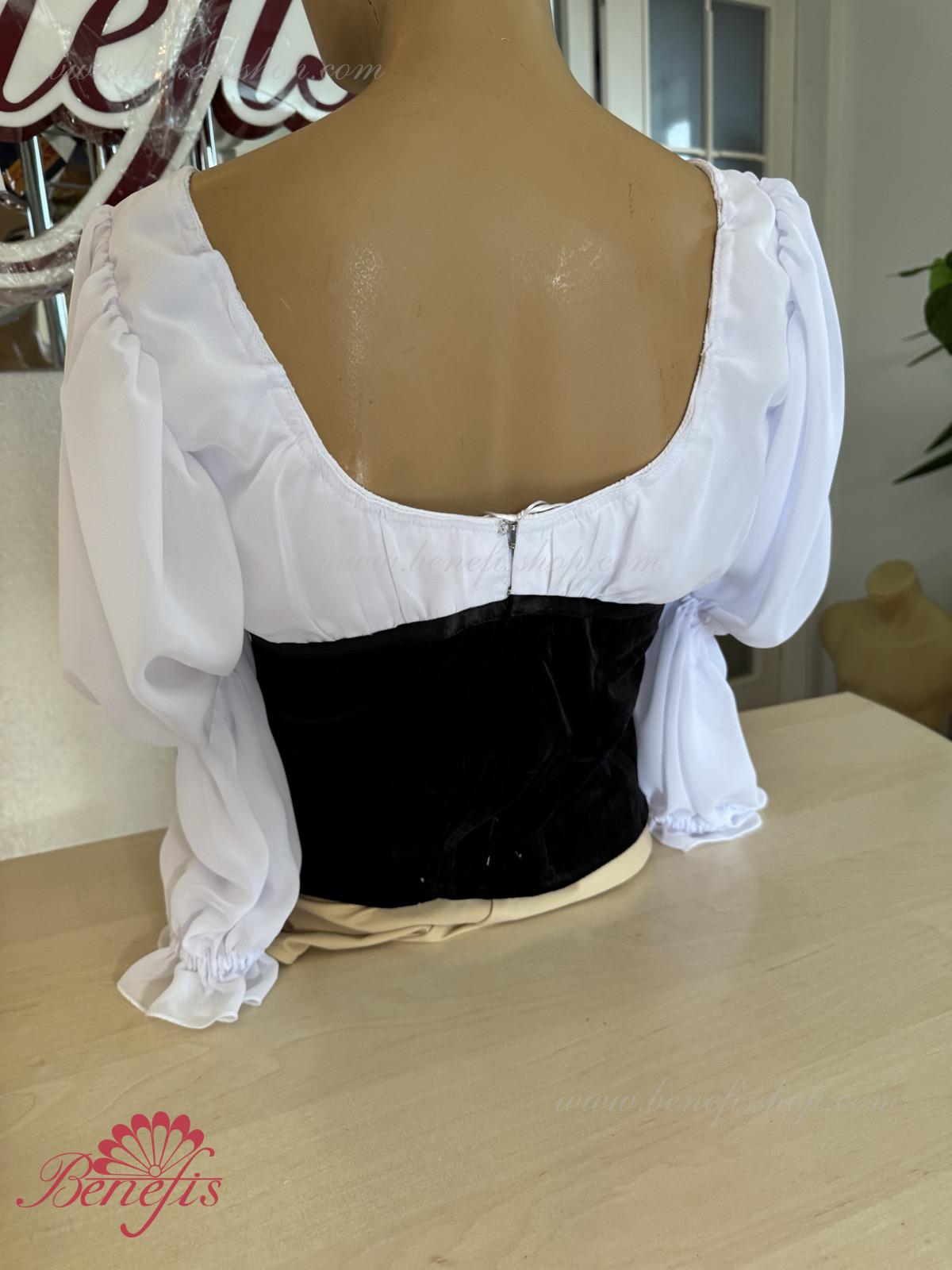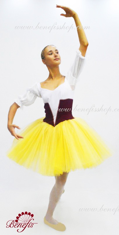 Professional stage ballet costume is made on the basis of the basic romantic skirt T0003. The top of the bodice is decorated with gathered chiffon imitating a blouse. Small lantern sleeves make the blouse more delicate.
