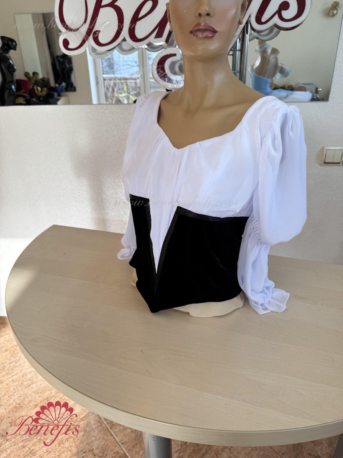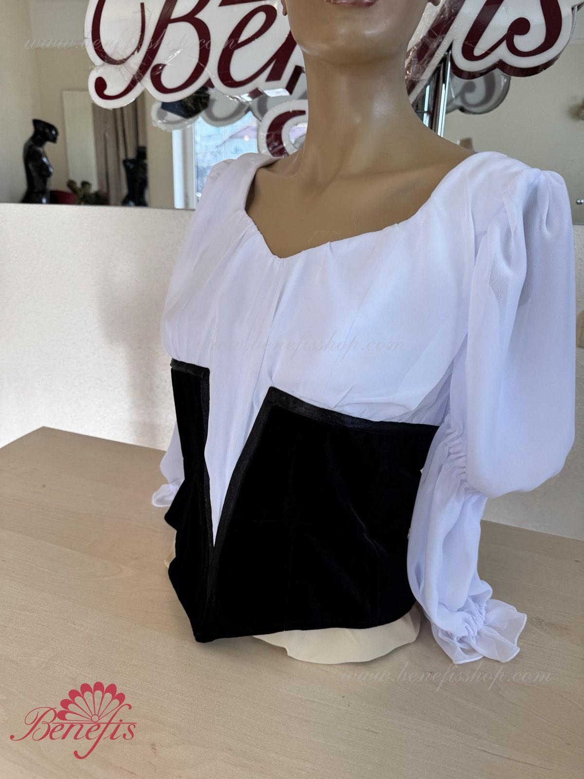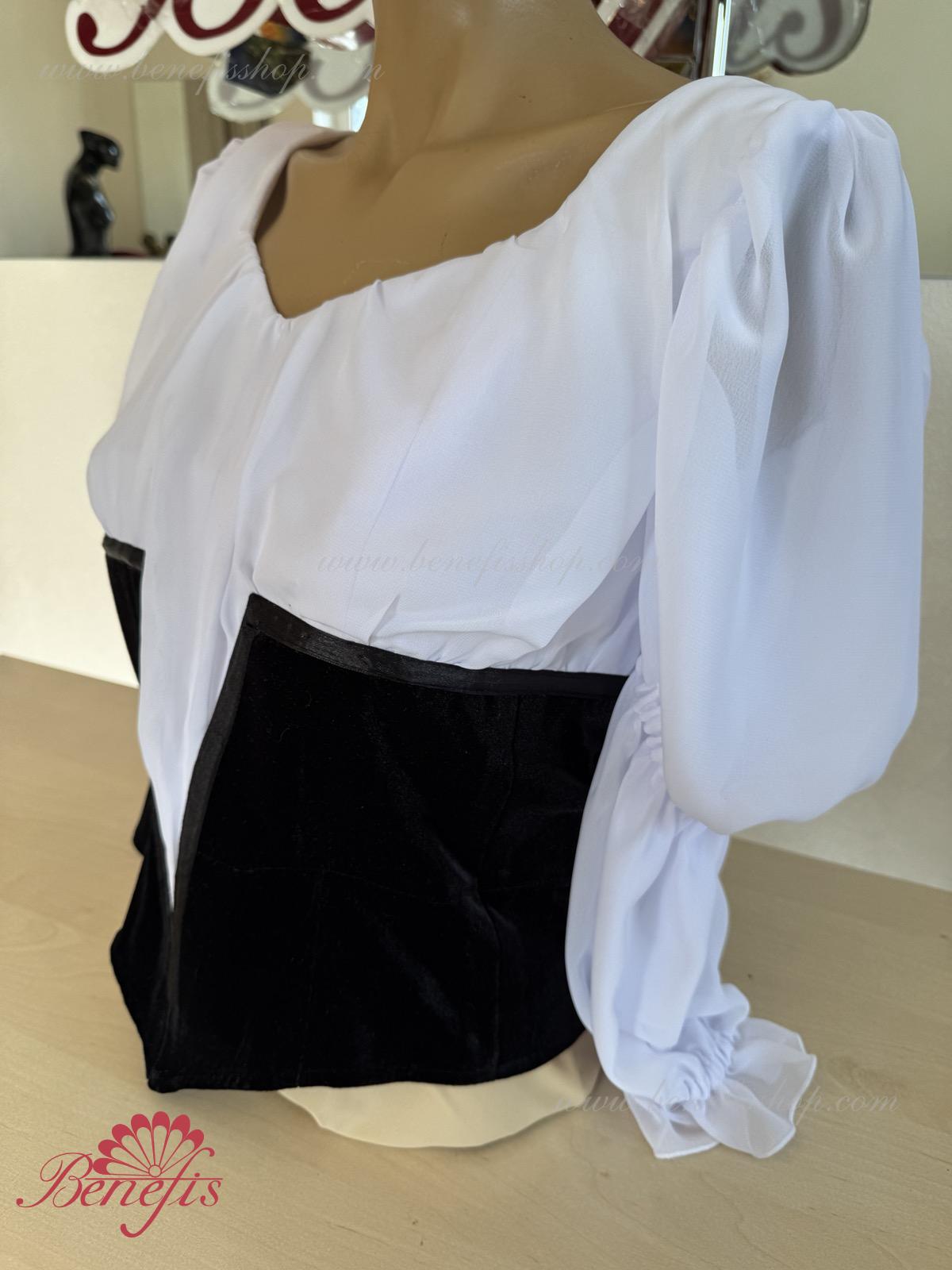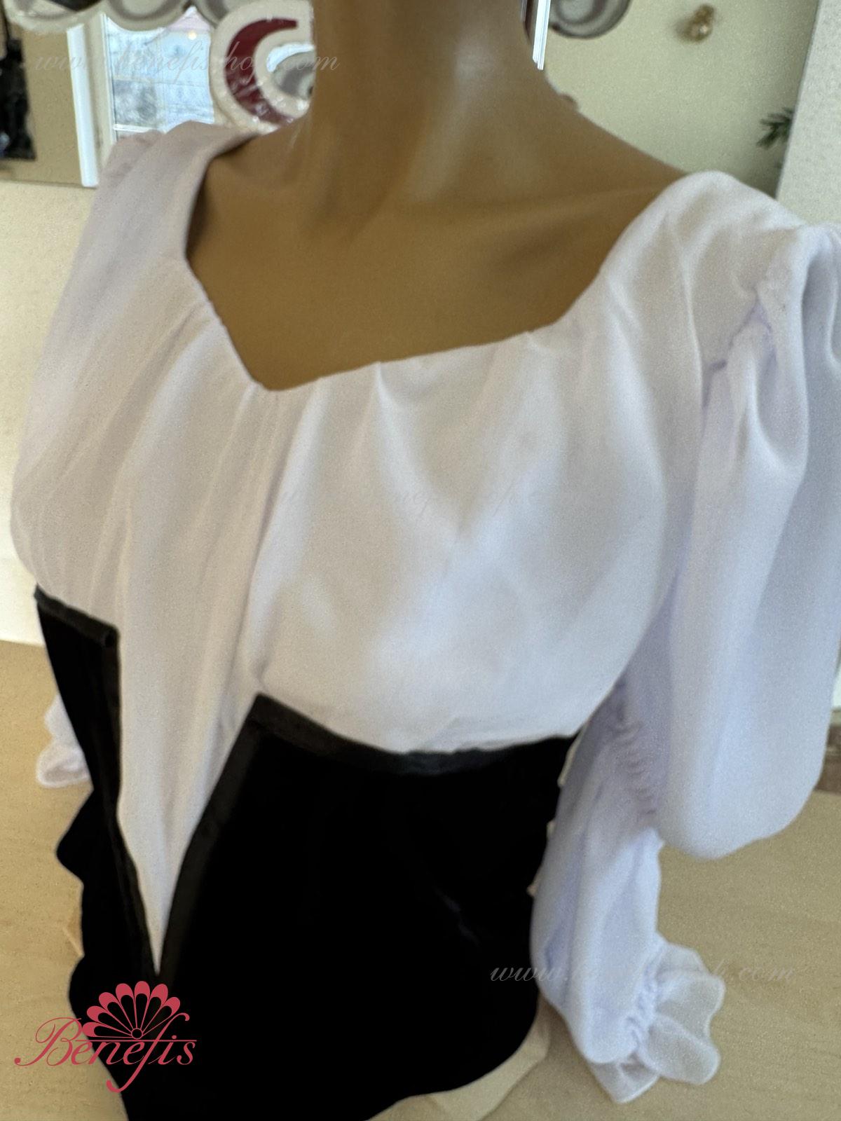 Professional stage ballet costume is made on the basis of the basic romantic skirt T0003. The top of the bodice is decorated with gathered chiffon imitating a blouse. Small lantern sleeves make the blouse more delicate.