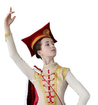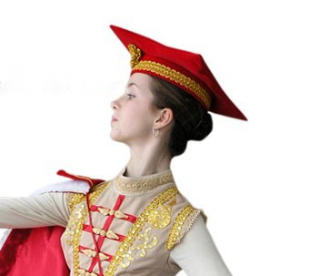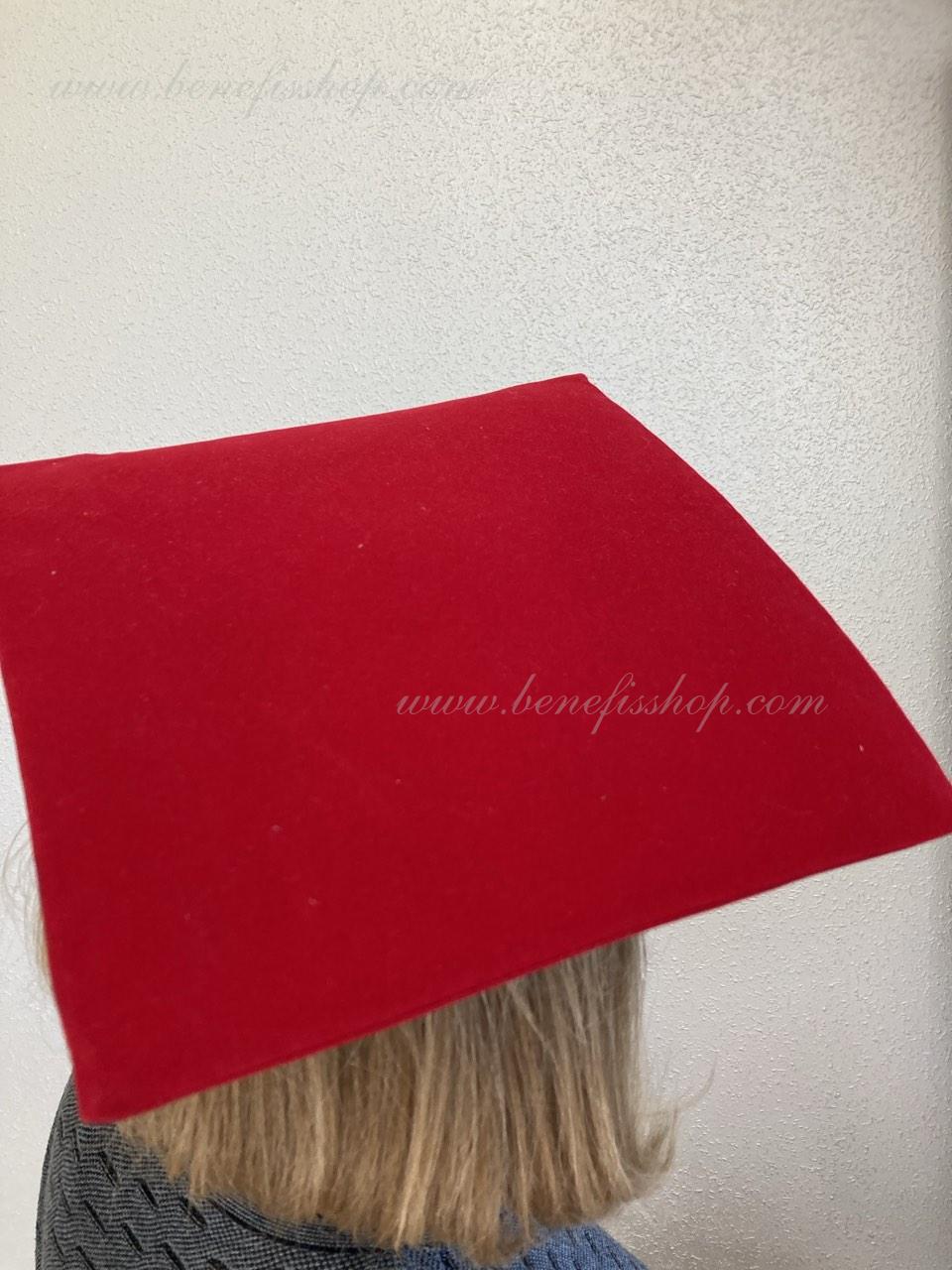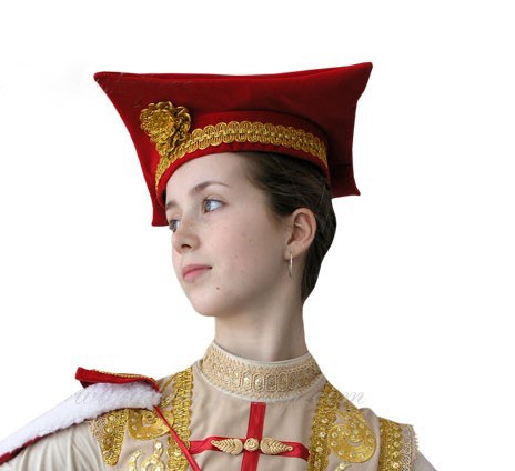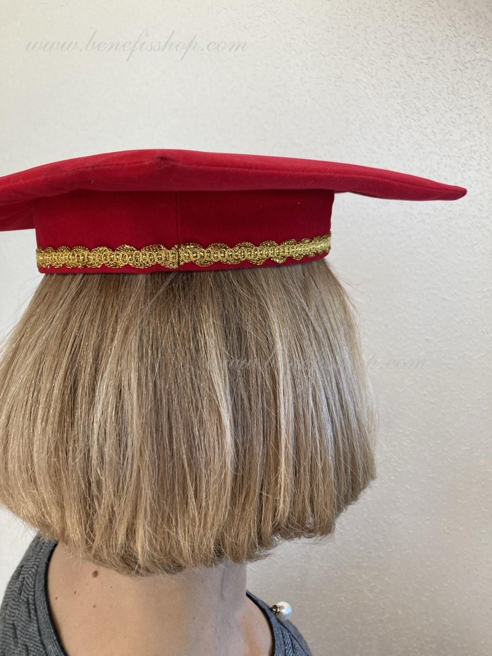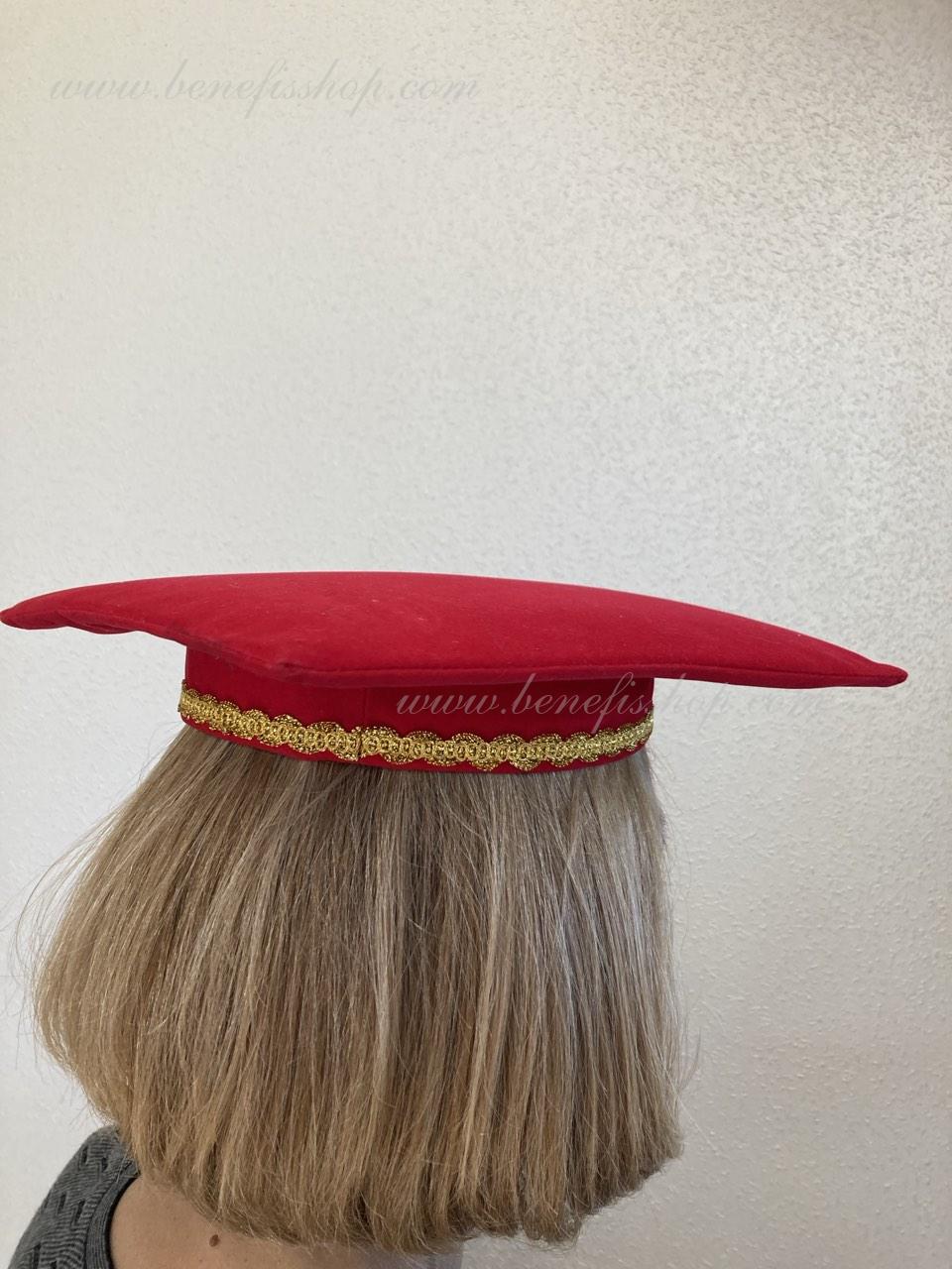 The square – shaped velvet headpiece is embellished with large braid and appliqués.
