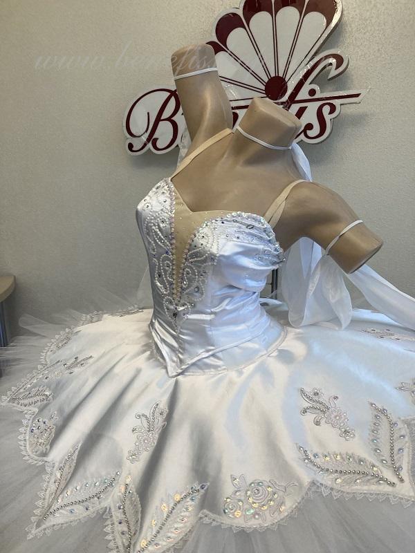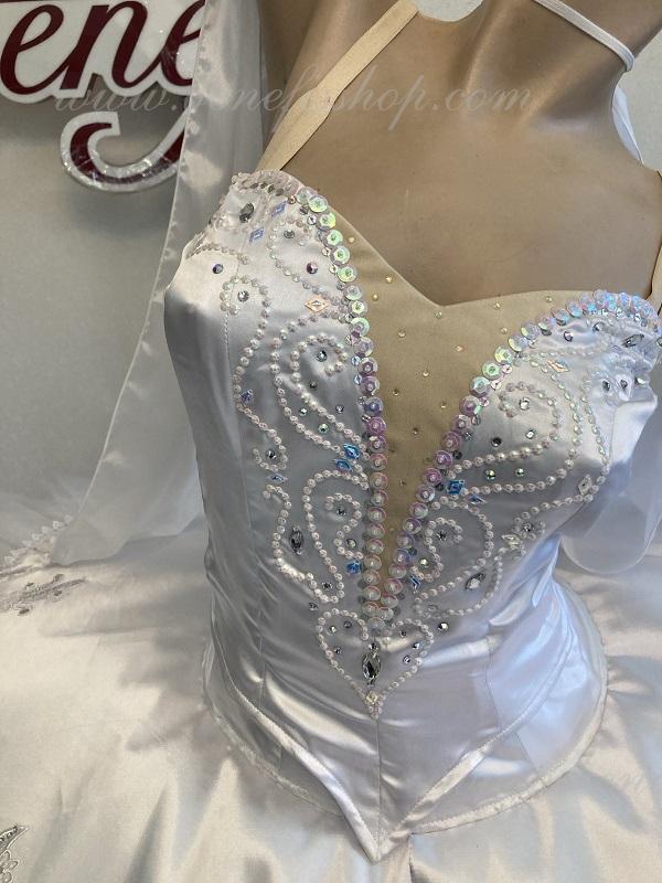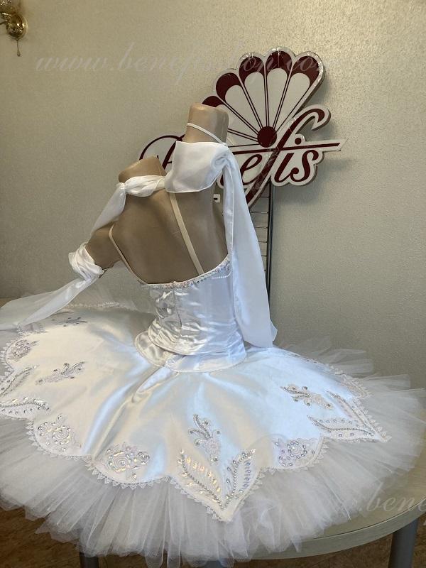 Details: dress, sleeves. This is a professional stage ballet costume. The base is based on the basic model T0001R .It is made of 9 layers of soft and hard tulle with 1 crinoline. The edge of the bundle is 38-42 cm. The bodice on flesh-colored straps can be made of the semi-stretched dense fabric of velvet or taffeta. This model is made of two parts which are connected with rubber bands on the waist area. The lower part is attached to the tutu, or skirt. The upper part is superimposed on the bottom part, what allows adjusting the length of the bodice, depending on the ballerina’s height, and makes it more flexible.