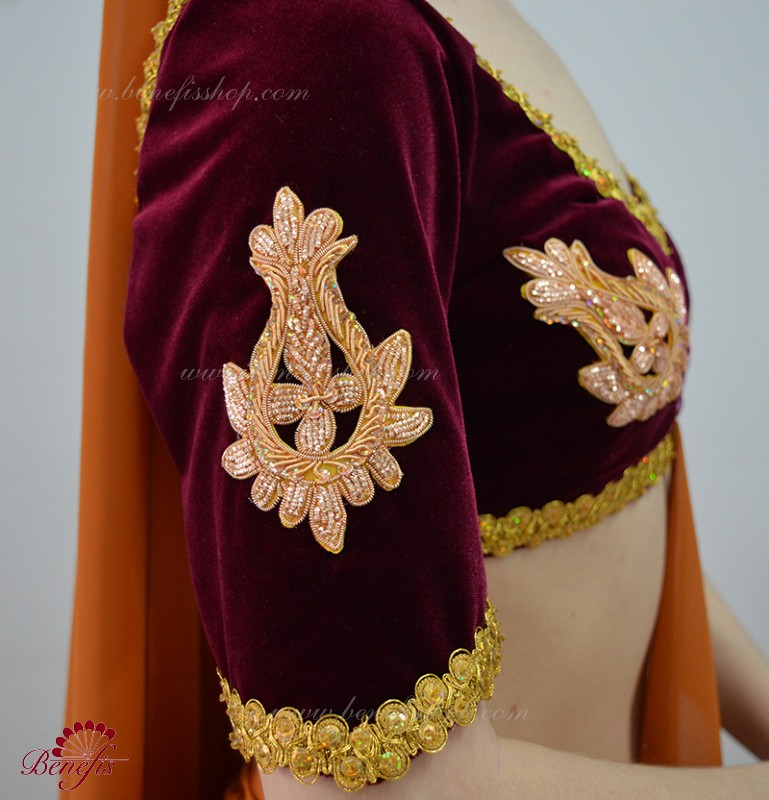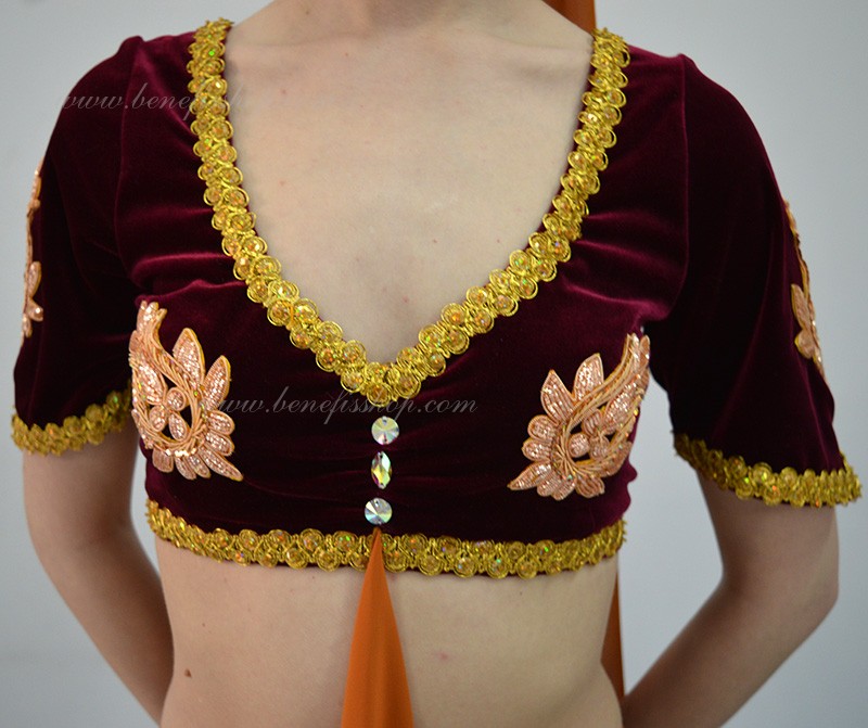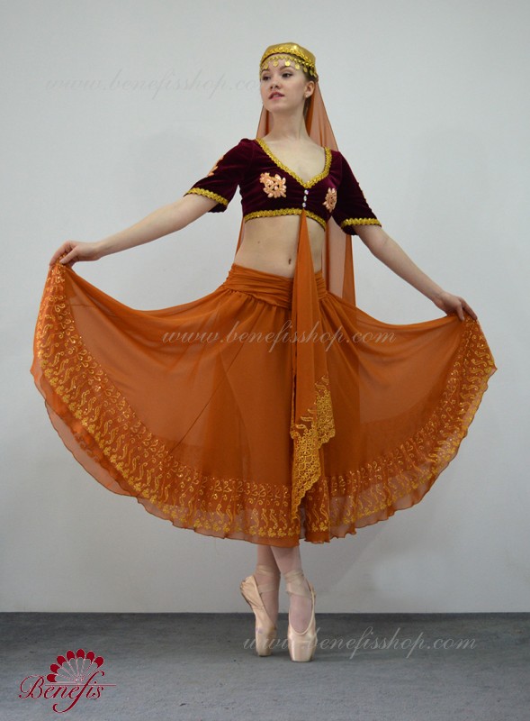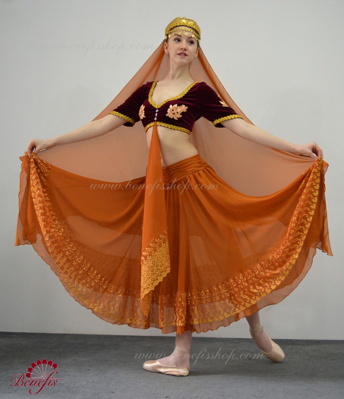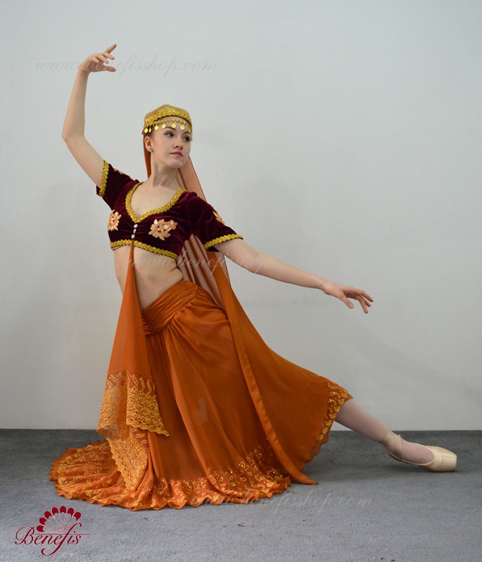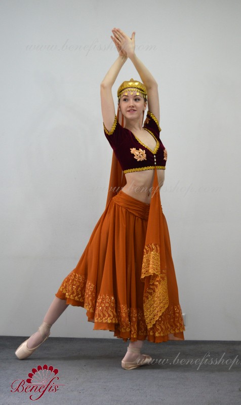 A luxurious ballet costume is made in the best oriental traditions. The shortened bodice is executed separately from the skirt, the bodice is made of elastic velvet fabric. In the center of the bodice is a decorative detail made of light chiffon. Clasp behind is on two rows of hooks. The skirt is made of light chiffon with 6 wedges. Below the skirt is processed lace of guipure. Appliques, crystals, braid are used in the form of decor.