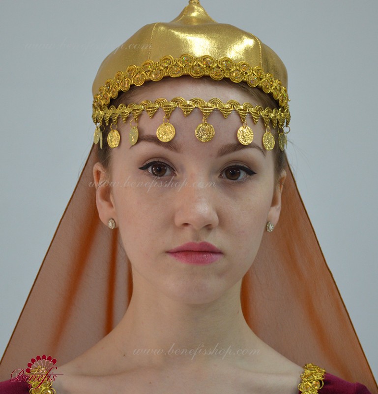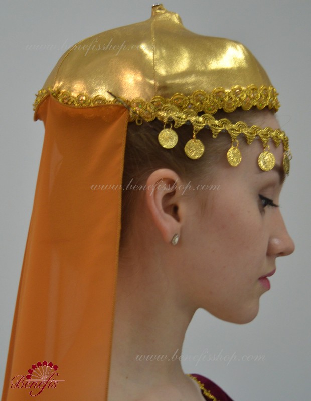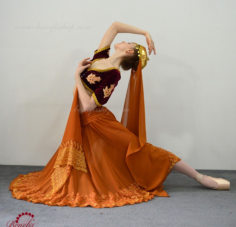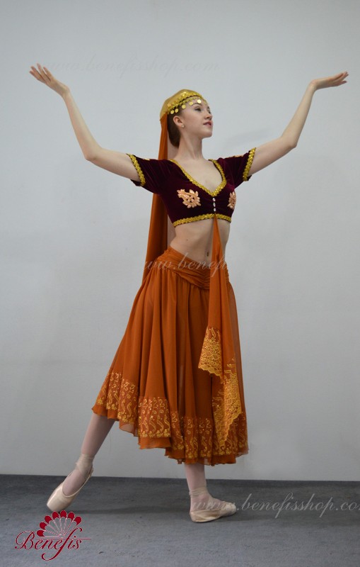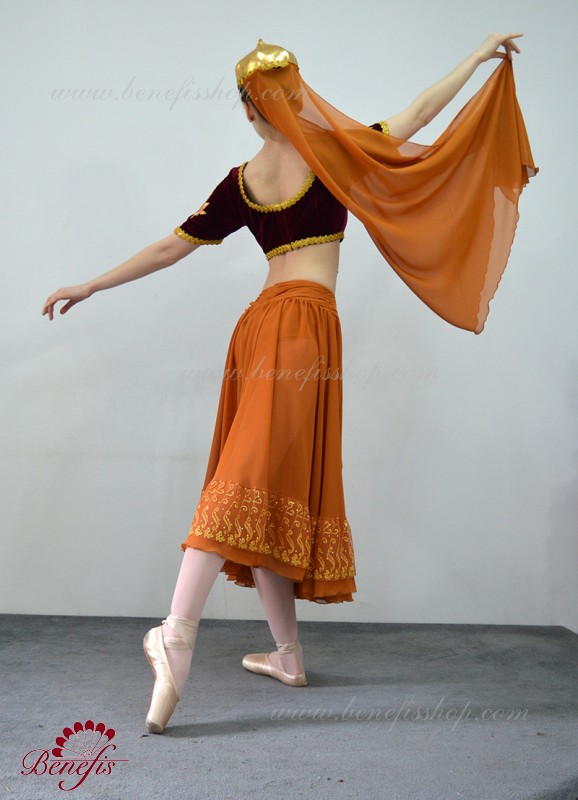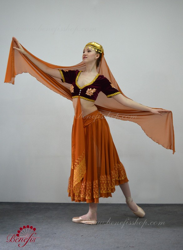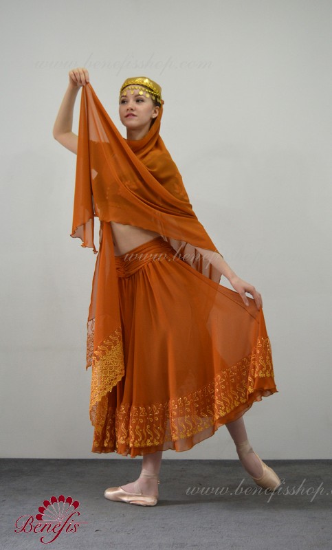 A luxurious ballet costume is made in the best oriental traditions. The shortened bodice is executed separately from the skirt, the bodice is made of elastic velvet fabric. In the center of the bodice is a decorative detail made of light chiffon. Clasp behind is on two rows of hooks. The skirt is made of light chiffon with 6 wedges. Below the skirt is processed lace of guipure. Appliques, crystals, braid are used in the form of decor.