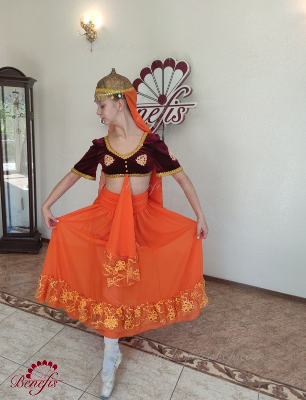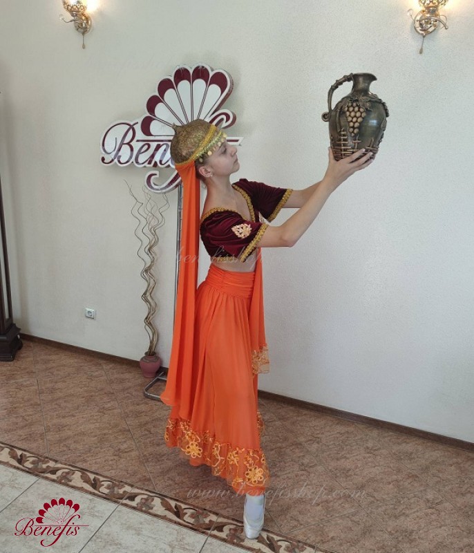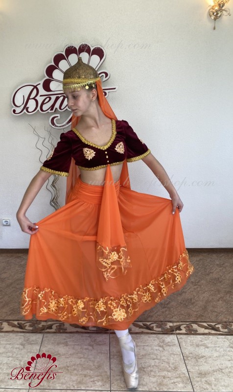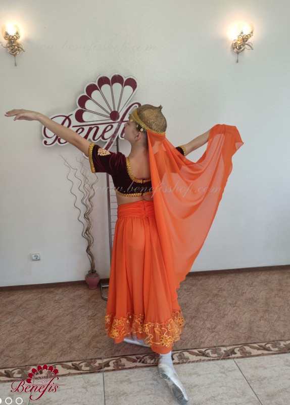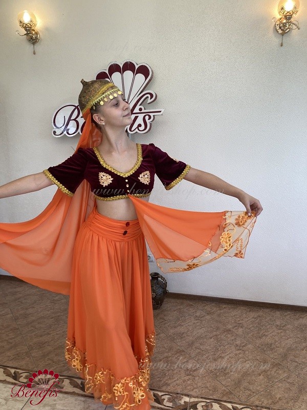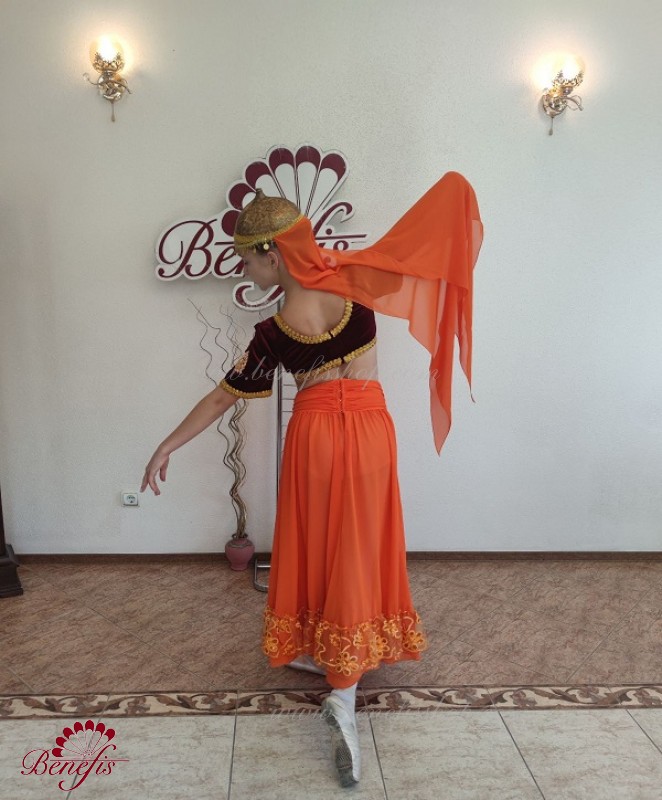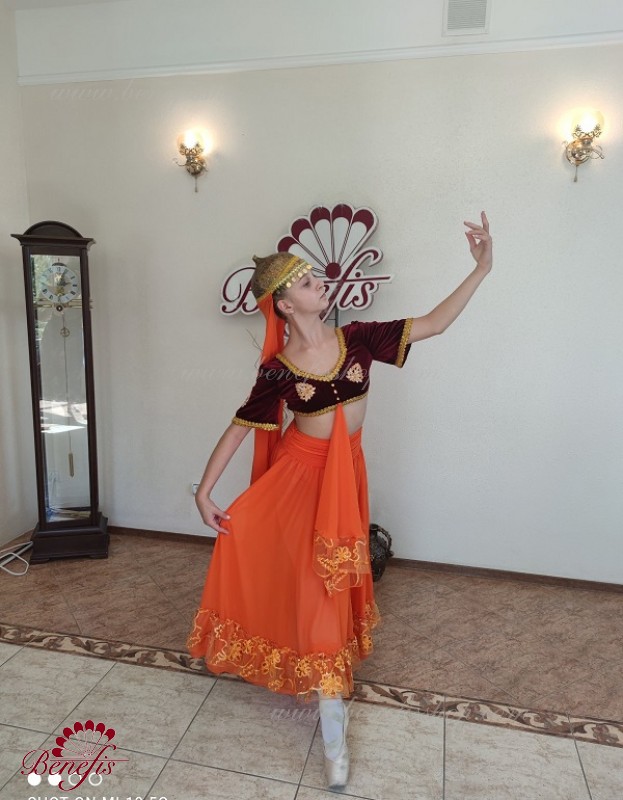 A luxurious ballet costume is made in the best oriental traditions. The shortened bodice is executed separately from the skirt, the bodice is made of elastic velvet fabric. In the center of the bodice is a decorative detail made of light chiffon. Clasp behind is on two rows of hooks. The skirt is made of light chiffon with 6 wedges. Below the skirt is processed lace of guipure. Appliques, crystals, braid are used in the form of decor.