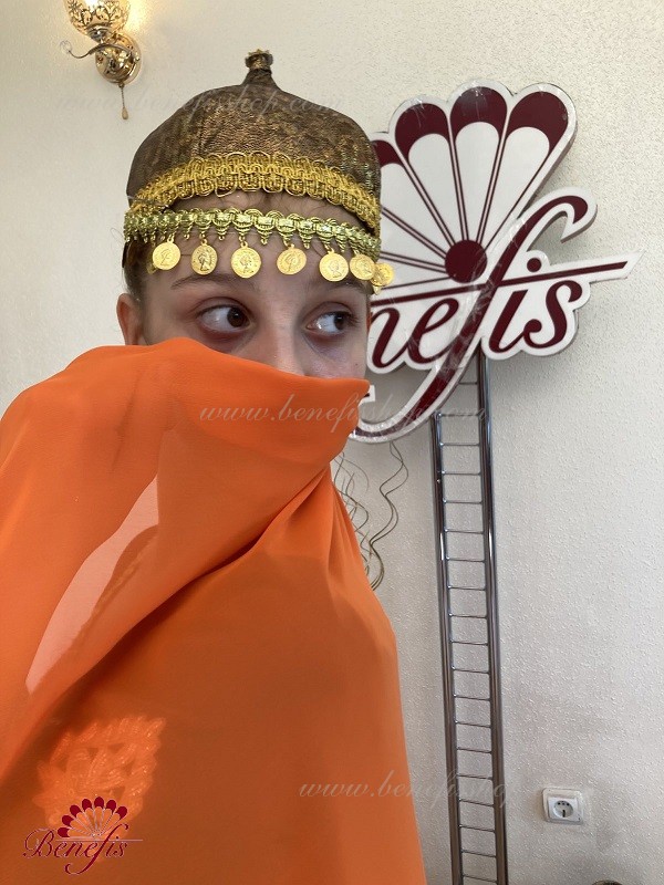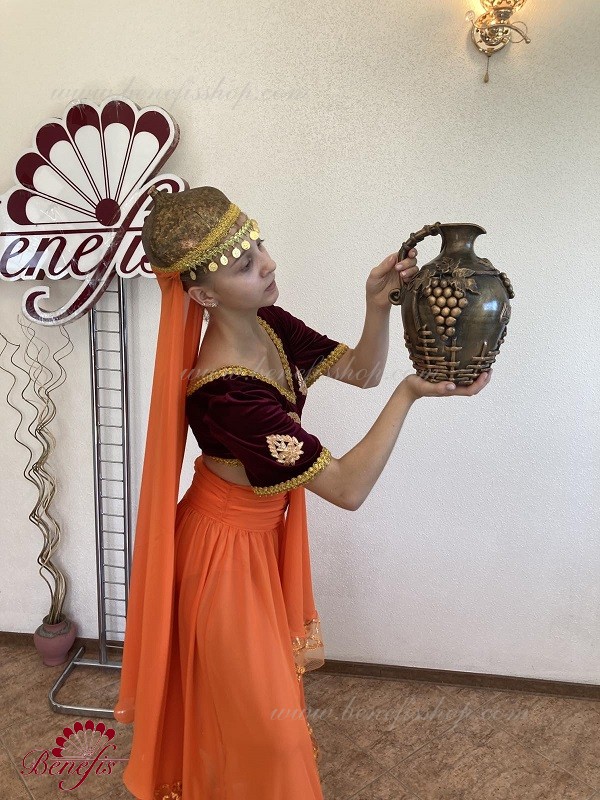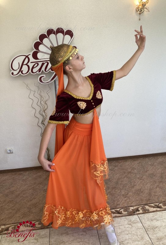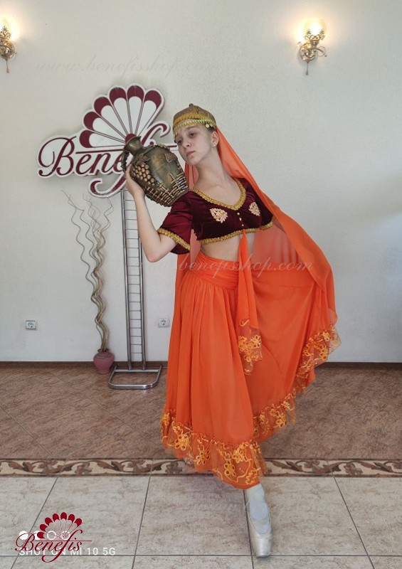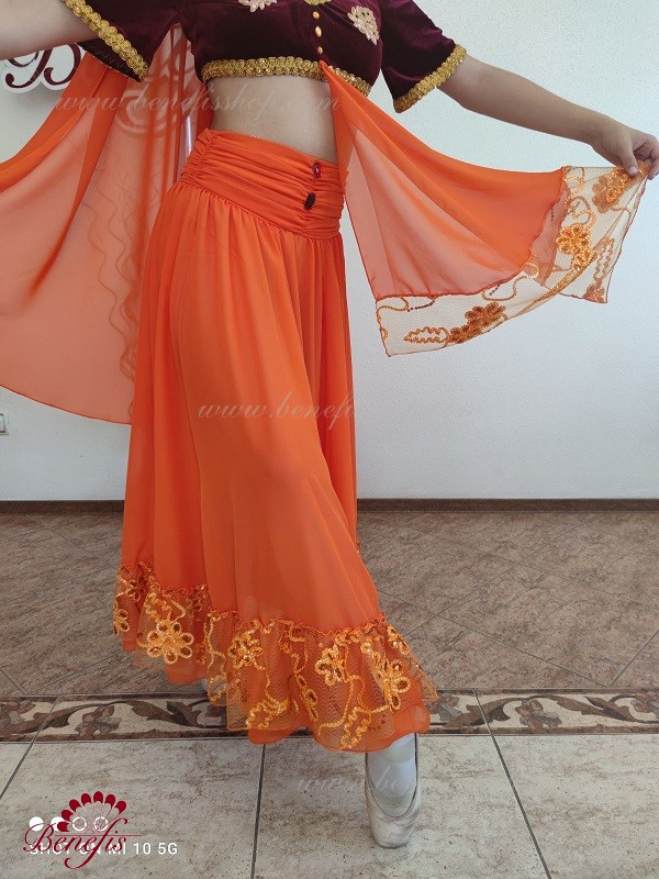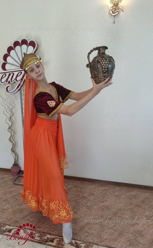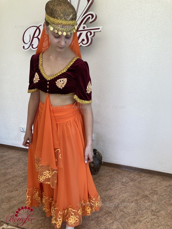 A luxurious ballet costume is made in the best oriental traditions. The shortened bodice is executed separately from the skirt, the bodice is made of elastic velvet fabric. In the center of the bodice is a decorative detail made of light chiffon. Clasp behind is on two rows of hooks. The skirt is made of light chiffon with 6 wedges. Below the skirt is processed lace of guipure. Appliques, crystals, braid are used in the form of decor.