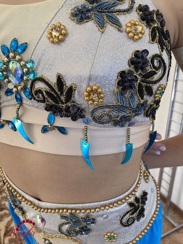Details:A top,cuffs on the arms, trousers. A top, a yoke,cuffs on trousers made of biflex, trousers made of viscose.The headdress is not included in the price of the suit.Rhinestones, sequins, and appliques are used as decor.