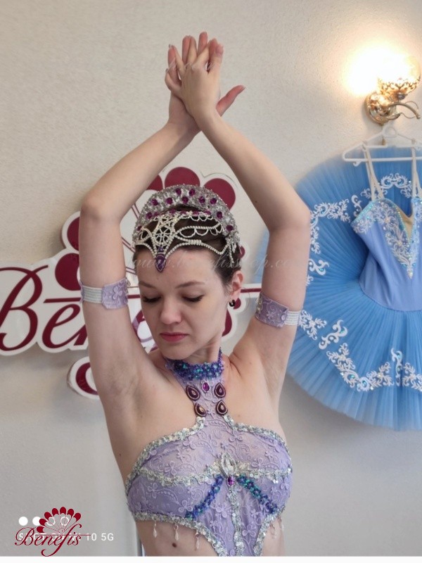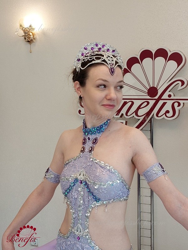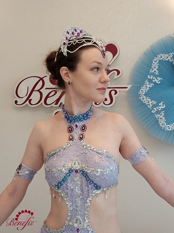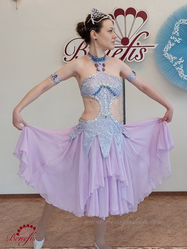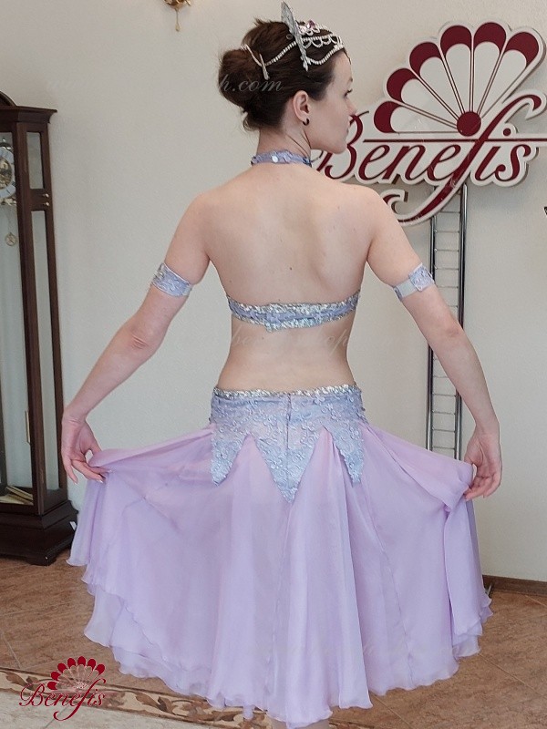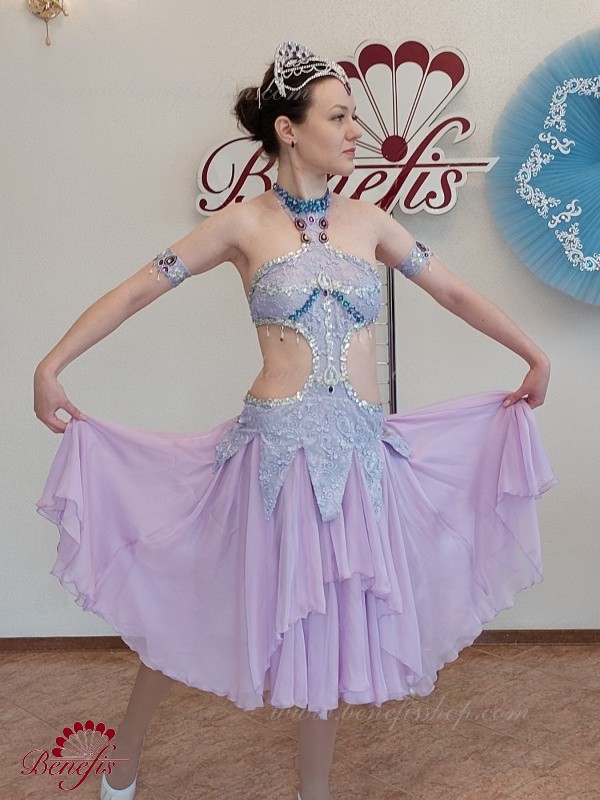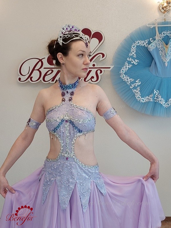Details:suit. Bodice and yoke made of biflex with guipure lining, with sewn cups. Asymmetrical chiffon skirt in two layers. Cuffs made of biflex with guipure lining.