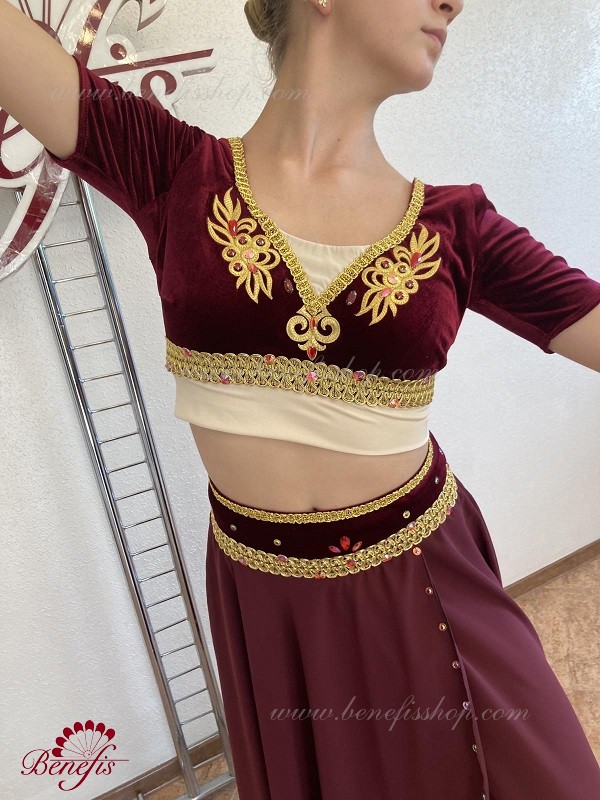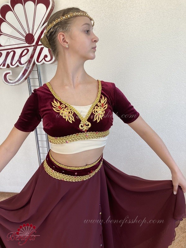 Shortened bodice with short sleeves is made of elastic fabric (supplex). It has a V-shaped inset in front. The bodice fastens by 2 rows of hooks in the back.