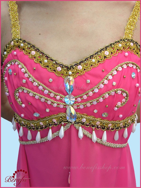 The bodice at the chest level is made of chiffon. It is edged with a large golden braid and is decorated with sparkles, beads, braid-cord, and crystals.